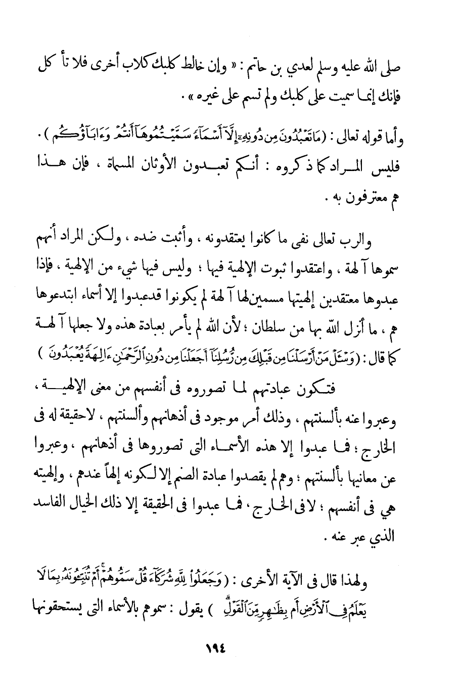 صَلَّى اللَّهُ عَلَيْهِ وَسَلَّمَ لِعَدِيِّ بْنِ حَاتِمٍ " {وَإِنْ خَالَطَ كَلْبَك كِلَابٌ أُخْرَى فَلَا تَأْكُلْ فَإِنَّك إنَّمَا سَمَّيْت عَلَى كَلْبِك وَلَمْ تُسَمِّ عَلَى غَيْرِهِ} ". وَأَمَّا قَوْله تَعَالَى {مَا تَعْبُدُونَ مِنْ دُونِهِ إلَّا أَسْمَاءً سَمَّيْتُمُوهَا أَنْتُمْ وَآبَاؤُكُمْ} . فَلَيْسَ الْمُرَادُ كَمَا ذَكَرُوهُ: أَنَّكُمْ تَعْبُدُونَ الْأَوْثَانَ الْمُسَمَّاةَ فَإِنَّ هَذَا هُمْ مُعْتَرِفُونَ بِهِ. وَالرَّبُّ تَعَالَى نَفَى مَا كَانُوا يَعْتَقِدُونَهُ وَأَثْبَتَ ضِدَّهُ وَلَكِنَّ الْمُرَادَ أَنَّهُمْ سَمَّوْهَا آلِهَةً وَاعْتَقَدُوا ثُبُوتَ الْإِلَهِيَّةِ فِيهَا؛ وَلَيْسَ فِيهَا شَيْءٌ مِنْ الْإِلَهِيَّةِ فَإِذَا عَبَدُوهَا مُعْتَقِدِينَ إلَهِيَّتَهَا مُسَمِّينَ لَهَا آلِهَةً لَمْ يَكُونُوا قَدْ عَبَدُوا إلَّا أَسْمَاءً ابْتَدَعُوهَا هُمْ مَا أَنْزَلَ اللَّهُ بِهَا مِنْ سُلْطَانٍ؛ لِأَنَّ اللَّهَ لَمْ يَأْمُرْ بِعِبَادَةِ هَذِهِ وَلَا جَعَلَهَا آلِهَةً كَمَا قَالَ: {وَاسْأَلْ مَنْ أَرْسَلْنَا مِنْ قَبْلِكَ مِنْ رُسُلِنَا أَجَعَلْنَا مِنْ دُونِ الرَّحْمَنِ آلِهَةً يُعْبَدُونَ} فَتَكُونُ عِبَادَتُهُمْ لِمَا تَصَوَّرُوهُ فِي أَنْفُسِهِمْ مِنْ مَعْنَى الْإِلَهِيَّةِ وَعَبَّرُوا عَنْهُ بِأَلْسِنَتِهِمْ وَذَلِكَ أَمْرٌ مَوْجُودٌ فِي أَذْهَانِهِمْ وَأَلْسِنَتِهِمْ لَا حَقِيقَةَ لَهُ فِي الْخَارِجِ؛ فَمَا عَبَدُوا إلَّا هَذِهِ الْأَسْمَاءَ الَّتِي تَصَوَّرُوهَا فِي أَذْهَانِهِمْ وَعَبَّرُوا عَنْ مَعَانِيهَا بِأَلْسِنَتِهِمْ؛ وَهُمْ لَمْ يَقْصِدُوا عِبَادَةَ الصَّنَمِ إلَّا لِكَوْنِهِ إلَهًا عِنْدَهُمْ وَإِلَهِيَّتُهُ هِيَ فِي أَنْفُسِهِمْ؛ لَا فِي الْخَارِجِ فَمَا عَبَدُوا فِي الْحَقِيقَةِ إلَّا ذَلِكَ الْخَيَالَ الْفَاسِدَ الَّذِي عُبِّرَ عَنْهُ. وَلِهَذَا قَالَ فِي الْآيَةِ الْأُخْرَى: {وَجَعَلُوا لِلَّهِ شُرَكَاءَ قُلْ سَمُّوهُمْ أَمْ تُنَبِّئُونَهُ بِمَا لَا يَعْلَمُ فِي الْأَرْضِ أَمْ بِظَاهِرٍ مِنَ الْقَوْلِ} يَقُولُ: سَمُّوهُمْ بِالْأَسْمَاءِ الَّتِي يَسْتَحِقُّونَهَا