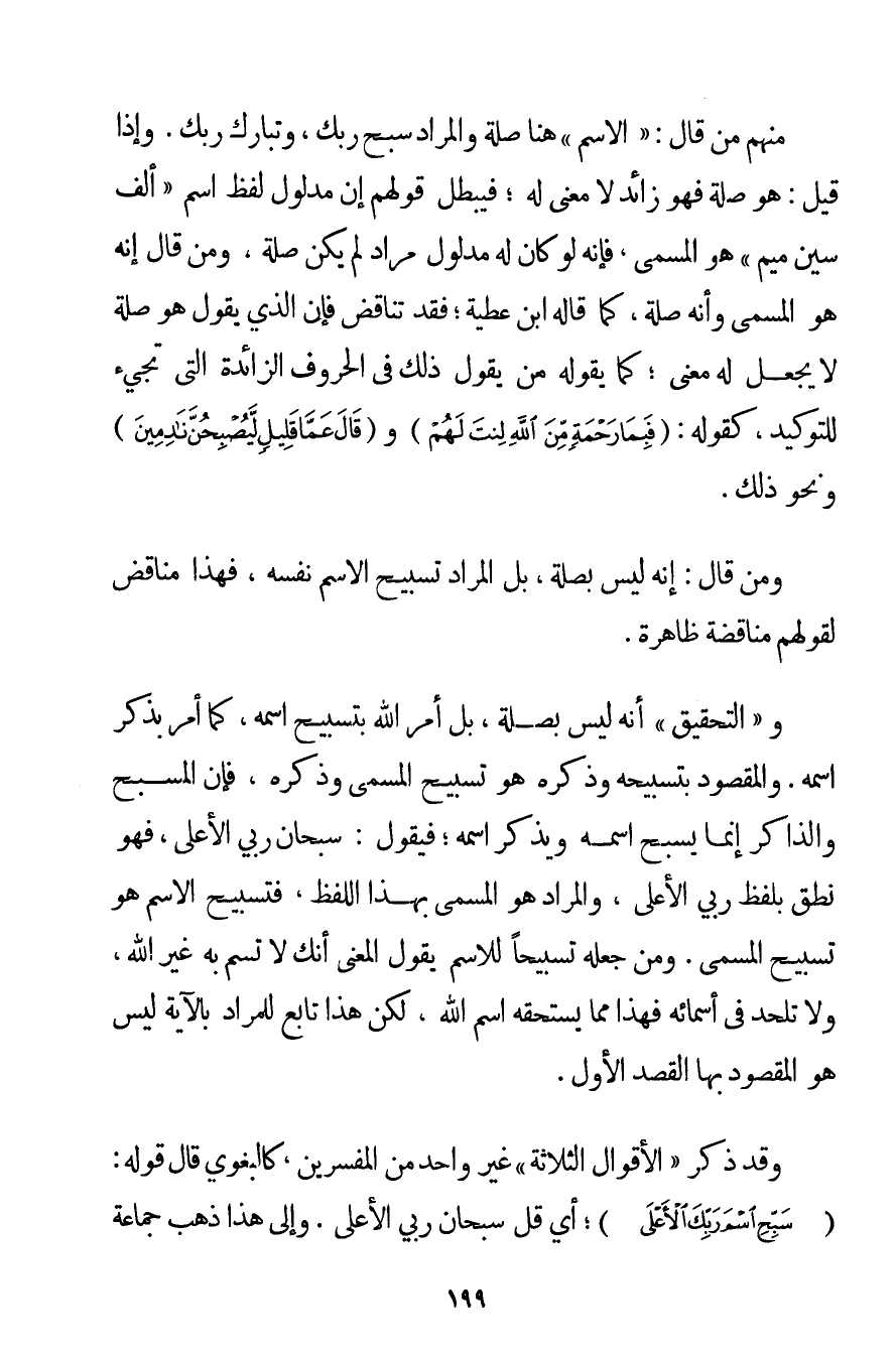 مِنْهُمْ مَنْ قَالَ: " الِاسْمُ " هُنَا صِلَةٌ وَالْمُرَادُ سَبِّحْ رَبَّك وَتَبَارَكَ رَبُّك. وَإِذَا قِيلَ: هُوَ صِلَةٌ فَهُوَ زَائِدٌ لَا مَعْنَى لَهُ؛ فَيُبْطِلُ قَوْلَهُمْ إنَّ مَدْلُولَ لَفْظِ اسْمٍ " أَلِفٌ سِينٌ مِيمٌ " هُوَ الْمُسَمَّى فَإِنَّهُ لَوْ كَانَ لَهُ مَدْلُولٌ مُرَادٌ لَمْ يَكُنْ صِلَةً. وَمَنْ قَالَ إنَّهُ هُوَ الْمُسَمَّى وَأَنَّهُ صِلَةٌ كَمَا قَالَهُ ابْنُ عَطِيَّةَ؛ فَقَدْ تَنَاقَضَ فَإِنَّ الَّذِي يَقُولُ هُوَ صِلَةٌ لَا يَجْعَلُ لَهُ مَعْنًى؛ كَمَا يَقُولُهُ مَنْ يَقُولُ ذَلِكَ فِي الْحُرُوفِ الزَّائِدَةِ الَّتِي تَجِيءُ لِلتَّوْكِيدِ كَقَوْلِهِ: {فَبِمَا رَحْمَةٍ مِنَ اللَّهِ لِنْتَ لَهُمْ} و {قَالَ عَمَّا قَلِيلٍ لَيُصْبِحُنَّ نَادِمِينَ} وَنَحْوُ ذَلِكَ. وَمَنْ قَالَ: إنَّهُ لَيْسَ بِصِلَةِ بَلْ الْمُرَادُ تَسْبِيحُ الِاسْمِ نَفْسِهِ فَهَذَا مُنَاقِضٌ لِقَوْلِهِمْ مُنَاقَضَةً ظَاهِرَةً. وَ " التَّحْقِيقُ " أَنَّهُ لَيْسَ بِصِلَةِ بَلْ أَمَرَ اللَّهُ بِتَسْبِيحِ اسْمِهِ كَمَا أَمَرَ بِذِكْرِ اسْمِهِ. وَالْمَقْصُودُ بِتَسْبِيحِهِ وَذِكْرِهِ هُوَ تَسْبِيحُ الْمُسَمَّى وَذِكْرُهُ فَإِنَّ الْمُسَبِّحَ وَالذَّاكِرَ إنَّمَا يُسَبِّحُ اسْمَهُ وَيَذْكُرُ اسْمَهُ؛ فَيَقُولُ: سُبْحَانَ رَبِّي الْأَعْلَى فَهُوَ نَطَقَ بِلَفْظِ رَبِّي الْأَعْلَى وَالْمُرَادُ هُوَ الْمُسَمَّى بِهَذَا اللَّفْظِ فَتَسْبِيحُ الِاسْمِ هُوَ تَسْبِيحُ الْمُسَمَّى. وَمَنْ جَعَلَهُ تَسْبِيحًا لِلِاسْمِ يَقُولُ الْمَعْنَى أَنَّك لَا تُسَمِّ بِهِ غَيْرَ اللَّهِ وَلَا تُلْحِدُ فِي أَسْمَائِهِ فَهَذَا مِمَّا يَسْتَحِقُّهُ اسْمُ اللَّهِ لَكِنَّ هَذَا تَابِعٌ لِلْمُرَادِ بِالْآيَةِ لَيْسَ هُوَ الْمَقْصُودَ بِهَا الْقَصْدَ الْأَوَّلَ. وَقَدْ ذَكَرَ " الْأَقْوَالَ الثَّلَاثَةَ " غَيْرُ وَاحِدٍ مِنْ الْمُفَسِّرِينَ كالبغوي قَالَ قَوْلُهُ: {سَبِّحِ اسْمَ رَبِّكَ الْأَعْلَى} أَيْ قُلْ سُبْحَانَ رَبِّي الْأَعْلَى. وَإِلَى هَذَا ذَهَبَ جَمَاعَةٌ
