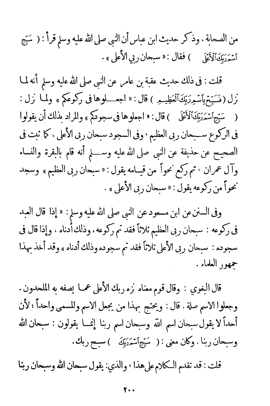 مِنْ الصَّحَابَةِ وَذَكَرَ حَدِيثَ ابْنِ عَبَّاسٍ {أَنَّ النَّبِيَّ صَلَّى اللَّهُ عَلَيْهِ وَسَلَّمَ قَرَأَ: {سَبِّحِ اسْمَ رَبِّكَ الْأَعْلَى} . فَقَالَ: سُبْحَانَ رَبِّي الْأَعْلَى} . قُلْت: فِي ذَلِكَ حَدِيثُ عُقْبَةَ بْنِ عَامِرٍ عَنْ النَّبِيِّ صَلَّى اللَّهُ عَلَيْهِ وَسَلَّمَ أَنَّهُ {لَمَّا نَزَلَ {فَسَبِّحْ بِاسْمِ رَبِّكَ الْعَظِيمِ} قَالَ اجْعَلُوهَا فِي رُكُوعِكُمْ وَلَمَّا نَزَلَ: {سَبِّحِ اسْمَ رَبِّكَ الْأَعْلَى} قَالَ: اجْعَلُوهَا فِي سُجُودِكُمْ} " وَالْمُرَادُ بِذَلِكَ أَنْ يَقُولُوا فِي الرُّكُوعِ سُبْحَانَ رَبِّي الْعَظِيمِ وَفِي السُّجُودِ سُبْحَانَ رَبِّي الْأَعْلَى كَمَا ثَبَتَ فِي الصَّحِيحِ عَنْ حُذَيْفَةَ عَنْ النَّبِيِّ صَلَّى اللَّهُ عَلَيْهِ وَسَلَّمَ أَنَّهُ {قَامَ بِالْبَقَرَةِ وَالنِّسَاءِ وَآلِ عِمْرَانَ ثُمَّ رَكَعَ نَحْوًا مِنْ قِيَامِهِ يَقُولُ: سُبْحَانَ رَبِّي الْعَظِيمِ وَسَجَدَ نَحْوًا مِنْ رُكُوعِهِ يَقُولُ: سُبْحَانَ رَبِّي الْأَعْلَى} ". وَفِي السُّنَنِ عَنْ ابْنِ مَسْعُودٍ عَنْ النَّبِيِّ صَلَّى اللَّهُ عَلَيْهِ وَسَلَّمَ " {إذَا قَالَ الْعَبْدُ فِي رُكُوعِهِ: سُبْحَانَ رَبِّي الْعَظِيمِ ثَلَاثًا فَقَدْ تَمَّ رُكُوعُهُ وَذَلِكَ أَدْنَاهُ وَإِذَا قَالَ فِي سُجُودِهِ: سُبْحَانَ رَبِّي الْأَعْلَى ثَلَاثًا فَقَدْ تَمَّ سُجُودُهُ وَذَلِكَ أَدْنَاهُ} " وَقَدْ أَخَذَ بِهَذَا جُمْهُورُ الْعُلَمَاءِ. قَالَ البغوي: وَقَالَ قَوْمٌ مَعْنَاهُ نَزِّهْ رَبَّك الْأَعْلَى عَمَّا يَصِفُهُ بِهِ الْمُلْحِدُونَ. وَجَعَلُوا الِاسْمَ صِلَةً. قَالَ: وَيَحْتَجُّ بِهَذَا مَنْ يَجْعَلُ الِاسْمَ وَالْمُسَمَّى وَاحِدًا؛ لِأَنَّ أَحَدًا لَا يَقُولُ سُبْحَانَ اسْمِ اللَّهِ وَسُبْحَانَ اسْمِ رَبِّنَا إنَّمَا يَقُولُونَ: سُبْحَانَ اللَّهِ وَسُبْحَانَ رَبِّنَا. وَكَانَ مَعْنَى: {سَبِّحِ اسْمَ رَبِّكَ} سَبِّحْ رَبَّك. قُلْت: قَدْ تَقَدَّمَ الْكَلَامُ عَلَى هَذَا وَاَلَّذِي: يَقُولُ سُبْحَانَ اللَّهِ وَسُبْحَانَ رَبِّنَا