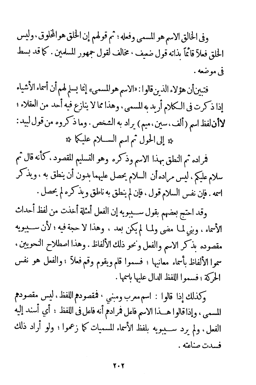 وَفِي الْخَالِقِ الِاسْمُ هُوَ الْمُسَمَّى وَفِعْلُهُ؛ ثُمَّ قَوْلُهُمْ إنَّ الْخَلْقَ هُوَ الْمَخْلُوقُ وَلَيْسَ الْخَلْقُ فِعْلًا قَائِمًا بِذَاتِهِ قَوْلٌ ضَعِيفٌ مُخَالِفٌ لِقَوْلِ جُمْهُورِ الْمُسْلِمِينَ. كَمَا قَدْ بُسِطَ فِي مَوْضِعِهِ. فَتَبَيَّنَ أَنَّ هَؤُلَاءِ الَّذِينَ قَالُوا: " الِاسْمُ هُوَ الْمُسَمَّى " إنَّمَا يَسْلَمُ لَهُمْ أَنَّ أَسْمَاءَ الْأَشْيَاءِ إذَا ذُكِرَتْ فِي الْكَلَامِ أُرِيدَ بِهِ الْمُسَمَّى وَهَذَا مِمَّا لَا يُنَازِعُ فِيهِ أَحَدٌ مِنْ الْعُقَلَاءِ؛ لَا أَنَّ لَفْظَ اسْمٍ. أَلِفٌ سِينٌ مِيمٌ يُرَادُ بِهِ الشَّخْصُ. وَمَا ذَكَرُوهُ مِنْ قَوْلِ لَبِيَدِ: إلَى الْحَوْلِ ثُمَّ اسْمُ السَّلَامِ عَلَيْكُمَا فَمُرَادُهُ ثُمَّ النُّطْقُ بِهَذَا الِاسْمِ وَذَكَرَهُ وَهُوَ التَّسْلِيمُ الْمَقْصُودُ؛ كَأَنَّهُ قَالَ ثُمَّ سَلَامٌ عَلَيْكُمْ لَيْسَ مُرَادُهُ أَنَّ السَّلَامَ يَحْصُلُ عَلَيْهِمَا بِدُونِ أَنْ يَنْطِقَ بِهِ وَيَذْكُرَ اسْمَهُ. فَإِنَّ نَفْسَ السَّلَامِ قَوْلٌ فَإِنْ لَمْ يَنْطِقْ بِهِ نَاطِقٌ وَيَذْكُرْهُ لَمْ يَحْصُلْ. وَقَدْ احْتَجَّ بَعْضُهُمْ بِقَوْلِ سِيبَوَيْهِ إنَّ الْفِعْلَ أَمْثِلَةٌ أُخِذَتْ مِنْ لَفْظِ أَحْدَاثِ الْأَسْمَاءِ وَبُنِيَ لِمَا مَضَى وَلَمَّا لَمْ يَكُنْ بَعْدُ وَهَذَا لَا حُجَّةَ فِيهِ؛ لِأَنَّ سِيبَوَيْهِ مَقْصُودُهُ بِذِكْرِ الِاسْمِ وَالْفِعْلِ وَنَحْوِ ذَلِكَ الْأَلْفَاظُ. وَهَذَا اصْطِلَاحُ النَّحْوِيِّينَ سَمَّوْا الْأَلْفَاظَ بِأَسْمَاءِ مَعَانِيهَا؛ فَسَمَّوْا قَامَ وَيَقُومُ وَقُمْ فِعْلًا؛ وَالْفِعْلُ هُوَ نَفْسُ الْحَرَكَةِ؛ فَسَمَّوْا اللَّفْظَ الدَّالَّ عَلَيْهَا بِاسْمِهَا. وَكَذَلِكَ إذَا قَالُوا: اسْمٌ مُعَرَّبٌ وَمَبْنِيٌّ فَمَقْصُودُهُمْ اللَّفْظُ لَيْسَ مَقْصُودُهُمْ الْمُسَمَّى وَإِذَا قَالُوا هَذَا الِاسْمُ فَاعِلٌ فَمُرَادُهُمْ أَنَّهُ فَاعِلٌ فِي اللَّفْظِ؛ أَيْ أُسْنِدَ إلَيْهِ الْفِعْلُ وَلَمْ يُرِدْ سِيبَوَيْهِ بِلَفْظِ الْأَسْمَاءِ الْمُسَمَّيَاتِ كَمَا زَعَمُوا؛ وَلَوْ أَرَادَ ذَلِكَ فَسَدَتْ صِنَاعَتُهُ.