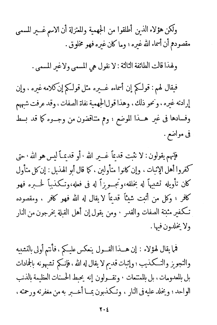 وَلَكِنْ هَؤُلَاءِ الَّذِينَ أَطْلَقُوا مِنْ الْجَهْمِيَّة وَالْمُعْتَزِلَةِ أَنَّ الِاسْمَ غَيْرُ الْمُسَمَّى مَقْصُودُهُمْ أَنَّ أَسْمَاءَ اللَّهِ غَيْرُهُ؛ وَمَا كَانَ غَيْرُهُ فَهُوَ مَخْلُوقٌ. وَلِهَذَا قَالَتْ الطَّائِفَةَ الثَّالِثَةَ: لَا نَقُولُ هِيَ الْمُسَمَّى وَلَا غَيْرُ الْمُسَمَّى. فَيُقَالُ لَهُمْ: قَوْلُكُمْ إنَّ أَسْمَاءَهُ غَيْرُهُ مِثْلَ قَوْلِكُمْ إنَّ كَلَامَهُ غَيْرُهُ وَإِنَّ إرَادَتَهُ غَيْرُهُ وَنَحْوُ ذَلِكَ وَهَذَا قَوْلُ الْجَهْمِيَّة نفاة الصِّفَاتِ وَقَدْ عَرَفْت شُبَهَهُمْ وَفَسَادَهَا فِي غَيْرِ هَذَا الْمَوْضِعِ؛ وَهُمْ مُتَنَاقِضُونَ مِنْ وُجُوهٍ كَمَا قَدْ بُسِطَ فِي مَوَاضِعَ. فَإِنَّهُمْ يَقُولُونَ: لَا نُثْبِتُ قَدِيمًا غَيْرَ اللَّهِ؛ أَوْ قَدِيمًا لَيْسَ هُوَ اللَّهُ حَتَّى كَفَّرُوا أَهْلَ الْإِثْبَاتِ وَإِنْ كَانُوا مُتَأَوِّلِينَ كَمَا قَالَ أَبُو الهذيل: إنَّ كُلَّ مُتَأَوِّلٍ كَانَ تَأْوِيلُهُ تَشْبِيهًا لَهُ بِخَلْقِهِ وَتَجْوِيزًا لَهُ فِي فِعْلِهِ وَتَكْذِيبًا لِخَبَرِهِ فَهُوَ كَافِرٌ؛ وَكُلُّ مَنْ أَثْبَتَ شَيْئًا قَدِيمًا لَا يُقَالُ لَهُ اللَّهُ فَهُوَ كَافِرٌ وَمَقْصُودُهُ تَكْفِيرُ مُثْبِتَةِ الصِّفَاتِ وَالْقَدَرِ وَمَنْ يَقُولُ إنَّ أَهْلَ الْقِبْلَةِ يَخْرُجُونَ مِنْ النَّارِ وَلَا يُخَلَّدُونَ فِيهَا. فَمِمَّا يُقَالُ لِهَؤُلَاءِ: إنَّ هَذَا الْقَوْلَ يَنْعَكِسُ عَلَيْكُمْ فَأَنْتُمْ أَوْلَى بِالتَّشْبِيهِ وَالتَّجْوِيزِ وَالتَّكْذِيبِ؛ وَإِثْبَاتِ قَدِيمٍ لَا يُقَالُ لَهُ اللَّهُ فَإِنَّكُمْ تُشَبِّهُونَهُ بِالْجَمَادَاتِ بَلْ بِالْمَعْدُومَاتِ بَلْ بِالْمُمْتَنِعَاتِ وَتَقُولُونَ إنَّهُ يُحْبِطُ الْحَسَنَاتِ الْعَظِيمَةَ بِالذَّنْبِ الْوَاحِدِ؛ وَيُخَلَّدُ عَلَيْهِ فِي النَّارِ وَتُكَذِّبُونَ بِمَا أَخْبَرَ بِهِ مِنْ مَغْفِرَتِهِ وَرَحْمَتِهِ