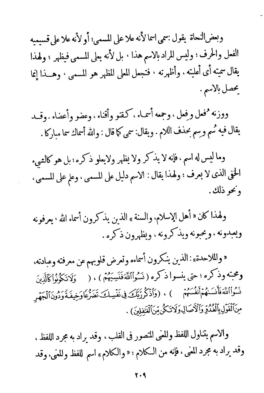 وَبَعْضُ النُّحَاةِ يَقُولُ: سُمِّيَ اسْمًا لِأَنَّهُ عَلَا عَلَى الْمُسَمَّى؛ أَوْ لِأَنَّهُ عَلَا عَلَى قَسِيمَيْهِ الْفِعْلِ وَالْحَرْفِ؛ وَلَيْسَ الْمُرَادُ بِالِاسْمِ هَذَا بَلْ لِأَنَّهُ يَعْلَى الْمُسَمَّى فَيَظْهَرُ؛ وَلِهَذَا يُقَالُ سَمَّيْته أَيْ أَعْلَيْته وَأَظْهَرْته فَتَجْعَلُ الْمُعَلَّى الْمُظْهَرَ هُوَ الْمُسَمَّى وَهَذَا إنَّمَا يَحْصُلُ بِالِاسْمِ. وَوَزْنُهُ فُعْلٌ وَفِعْلٌ وَجَمْعُهُ أَسْمَاءٌ كَقِنْوِ وَأَقْنَاءٍ وَعُضْوٍ وَأَعْضَاءٍ. وَقَدْ يُقَالُ فِيهِ سُمٌّ وَسِمٌّ بِحَذْفِ اللَّامِ. وَيُقَالُ: سَمَّى كَمَا قَالَ: وَاَللَّهُ أَسْمَاك سُمًّا مُبَارَكًا. وَمَا لَيْسَ لَهُ اسْمٌ فَإِنَّهُ لَا يُذْكَرُ وَلَا يُظْهَرُ وَلَا يَعْلُو ذِكْرُهُ؛ بَلْ هُوَ كَالشَّيْءِ الْخَفِيِّ الَّذِي لَا يُعْرَفُ؛ وَلِهَذَا يُقَالُ: الِاسْمُ دَلِيلٌ عَلَى الْمُسَمَّى وَعَلَمٌ عَلَى الْمُسَمَّى وَنَحْوُ ذَلِكَ. وَلِهَذَا كَانَ " أَهْلُ الْإِسْلَامِ وَالسُّنَّةِ " الَّذِينَ يَذْكُرُونَ أَسْمَاءَ اللَّهِ يَعْرِفُونَهُ وَيَعْبُدُونَهُ وَيُحِبُّونَهُ وَيَذْكُرُونَهُ وَيُظْهِرُونَ ذِكْرَهُ. " وَالْمَلَاحِدَةُ ": الَّذِينَ يُنْكِرُونَ أَسْمَاءَهُ وَتُعْرِضُ قُلُوبُهُمْ عَنْ مَعْرِفَتِهِ وَعِبَادَتِهِ وَمَحَبَّتِهِ وَذِكْرِهِ؛ حَتَّى يَنْسَوْا ذِكْرَهُ {نَسُوا اللَّهَ فَنَسِيَهُمْ} {وَلَا تَكُونُوا كَالَّذِينَ نَسُوا اللَّهَ فَأَنْسَاهُمْ أَنْفُسَهُمْ} {وَاذْكُرْ رَبَّكَ فِي نَفْسِكَ تَضَرُّعًا وَخِيفَةً وَدُونَ الْجَهْرِ مِنَ الْقَوْلِ بِالْغُدُوِّ وَالْآصَالِ وَلَا تَكُنْ مِنَ الْغَافِلِينَ} . وَالِاسْمُ يَتَنَاوَلُ اللَّفْظَ وَالْمَعْنَى الْمُتَصَوَّرَ فِي الْقَلْبِ وَقَدْ يُرَادُ بِهِ مُجَرَّدُ اللَّفْظِ وَقَدْ يُرَادُ بِهِ مُجَرَّدُ الْمَعْنَى فَإِنَّهُ مِنْ الْكَلَامِ؛ " وَالْكَلَامُ " اسْمٌ لِلَّفْظِ وَالْمَعْنَى، وَقَدْ
