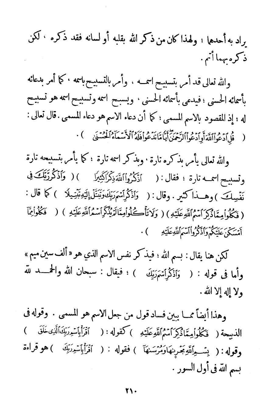 يُرَادُ بِهِ أَحَدُهُمَا؛ وَلِهَذَا كَانَ مِنْ ذَكَرَ اللَّهِ بِقَلْبِهِ أَوْ لِسَانِهِ فَقَدْ ذَكَرَهُ لَكِنْ ذَكَرَهُ بِهِمَا أَتَمُّ. وَاَللَّهُ تَعَالَى قَدْ أَمَرَ بِتَسْبِيحِ اسْمِهِ وَأَمَرَ بِالتَّسْبِيحِ بِاسْمِهِ كَمَا أَمَرَ بِدُعَائِهِ بِأَسْمَائِهِ الْحُسْنَى؛ فَيُدْعَى بِأَسْمَائِهِ الْحُسْنَى وَيُسَبَّحُ اسْمُهُ وَتَسْبِيحُ اسْمِهِ هُوَ تَسْبِيحٌ لَهُ؛ إذْ الْمَقْصُودُ بِالِاسْمِ الْمُسَمَّى؛ كَمَا أَنَّ دُعَاءَ الِاسْمِ هُوَ دُعَاءُ الْمُسَمَّى. قَالَ تَعَالَى: {قُلِ ادْعُوا اللَّهَ أَوِ ادْعُوا الرَّحْمَنَ أَيًّا مَا تَدْعُوا فَلَهُ الْأَسْمَاءُ الْحُسْنَى} . وَاَللَّهُ تَعَالَى يَأْمُرُ بِذِكْرِهِ تَارَةً وَبِذِكْرِ اسْمِهِ تَارَةً؛ كَمَا يَأْمُرُ بِتَسْبِيحِهِ تَارَةً وَتَسْبِيحِ اسْمِهِ تَارَةً؛ فَقَالَ: {اذْكُرُوا اللَّهَ ذِكْرًا كَثِيرًا} {وَاذْكُرْ رَبَّكَ فِي نَفْسِكَ} وَهَذَا كَثِيرٌ. وَقَالَ: {وَاذْكُرِ اسْمَ رَبِّكَ وَتَبَتَّلْ إلَيْهِ تَبْتِيلًا} كَمَا قَالَ: {فَكُلُوا مِمَّا ذُكِرَ اسْمُ اللَّهِ عَلَيْهِ} {وَلَا تَأْكُلُوا مِمَّا لَمْ يُذْكَرِ اسْمُ اللَّهِ عَلَيْهِ} {فَكُلُوا مِمَّا أَمْسَكْنَ عَلَيْكُمْ وَاذْكُرُوا اسْمَ اللَّهِ عَلَيْهِ} . لَكِنْ هُنَا يُقَالُ: بِسْمِ اللَّهِ؛ فَيَذْكُرُ نَفْسَ الِاسْمِ الَّذِي هُوَ " أَلِف سِينٌ مِيمٌ " وَأَمَّا فِي قَوْلِهِ: {وَاذْكُرِ اسْمَ رَبِّكَ} فَيُقَالُ: سُبْحَانَ اللَّهِ وَالْحَمْدُ لِلَّهِ وَلَا إلَهَ إلَّا اللَّهُ. وَهَذَا أَيْضًا مِمَّا يُبَيِّنُ فَسَادَ قَوْل مَنْ جَعَلَ الِاسْمَ هُوَ الْمُسَمَّى. وَقَوْلُهُ فِي الذَّبِيحَةِ {فَكُلُوا مِمَّا ذُكِرَ اسْمُ اللَّهِ عَلَيْهِ} كَقَوْلِهِ: {اقْرَأْ بِاسْمِ رَبِّكَ الَّذِي خَلَقَ} وَقَوْلُهُ: {بِسْمِ اللَّهِ مَجْرَاهَا وَمُرْسَاهَا} فَقَوْلُهُ: {اقْرَأْ بِاسْمِ رَبِّكَ} هُوَ قِرَاءَةُ بِسْمِ اللَّهِ فِي أَوَّلِ السُّوَرِ.
