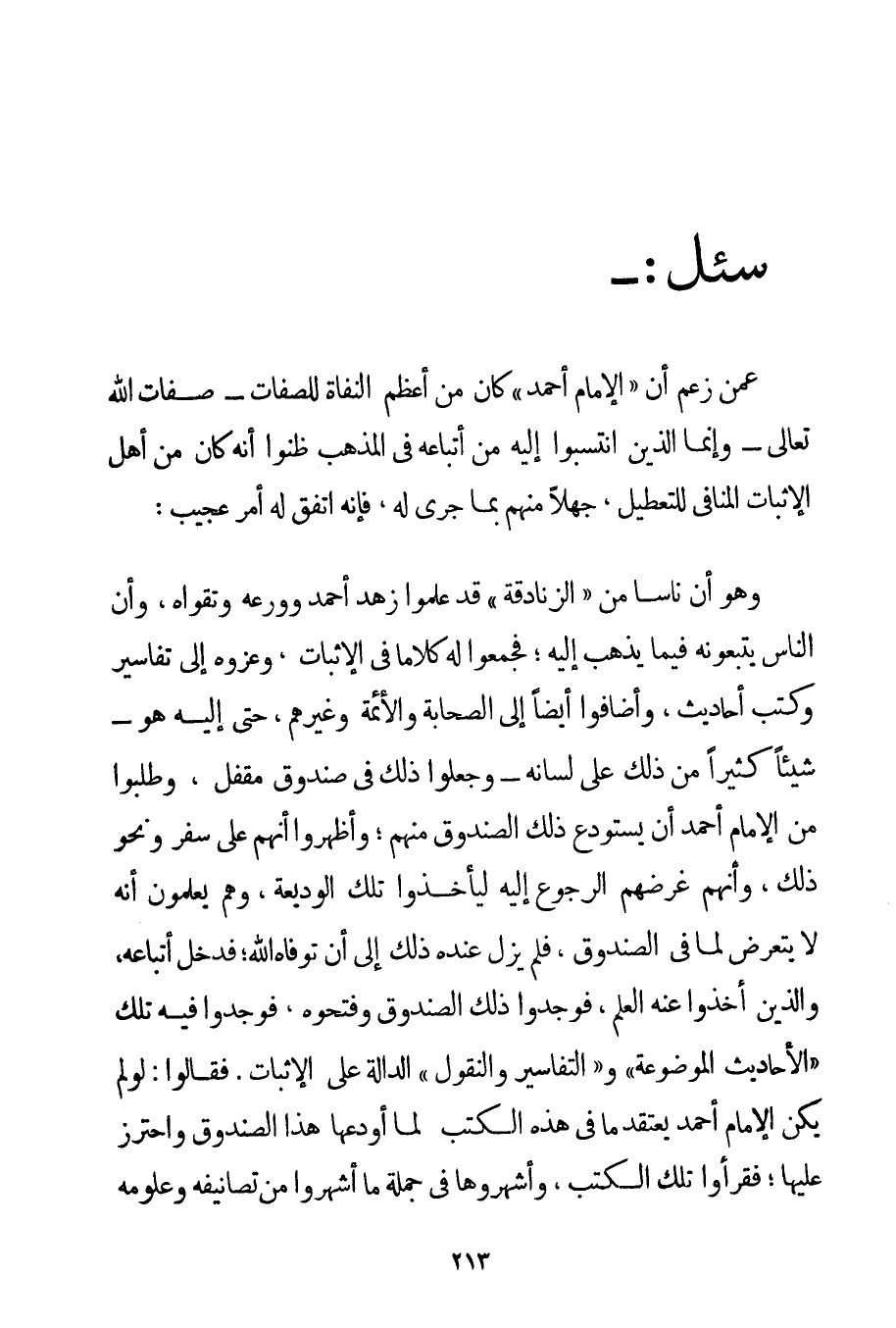 عَمَّنْ زَعَمَ أَنَّ " الْإِمَامَ أَحْمَد " كَانَ مِنْ أَعْظَمِ الْنُّفَاةِ لِلصِّفَاتِ - صِفَاتِ اللَّهِ تَعَالَى - وَإِنَّمَا الَّذِينَ انْتَسَبُوا إلَيْهِ مِنْ أَتْبَاعِهِ فِي الْمَذْهَبِ ظَنُّوا أَنَّهُ كَانَ مِنْ أَهْلِ الْإِثْبَاتِ الْمُنَافِي لِلتَّعْطِيلِ جَهْلًا مِنْهُمْ بِمَا جَرَى لَهُ فَإِنَّهُ اتَّفَقَ لَهُ أَمْرٌ عَجِيبٌ: وَهُوَ أَنَّ نَاسًا مِنْ " الزَّنَادِقَةِ " قَدْ عَلِمُوا زُهْدَ أَحْمَد وَوَرَعَهُ وَتَقْوَاهُ وَأَنَّ النَّاسَ يَتْبَعُونَهُ فِيمَا يَذْهَبُ إلَيْهِ؛ فَجَمَعُوا لَهُ كَلَامًا فِي الْإِثْبَاتِ وَعَزَوْهُ إلَى تَفَاسِيرَ وَكُتُبِ أَحَادِيثَ وَأَضَافُوا أَيْضًا إلَى الصَّحَابَةِ وَالْأَئِمَّةِ وَغَيْرِهِمْ حَتَّى إلَيْهِ هُوَ - شَيْئًا كَثِيرًا مِنْ ذَلِكَ عَلَى لِسَانِهِ - وَجَعَلُوا ذَلِكَ فِي صُنْدُوقٍ مُقْفَلٍ وَطَلَبُوا مِنْ الْإِمَامِ أَحْمَد أَنْ يَسْتَوْدِعَ ذَلِكَ الصُّنْدُوقَ مِنْهُمْ؛ وَأَظْهَرُوا أَنَّهُمْ عَلَى سَفَرٍ وَنَحْوُ ذَلِكَ وَأَنَّهُمْ غَرَضُهُمْ الرُّجُوعُ إلَيْهِ لِيَأْخُذُوا تِلْكَ الْوَدِيعَةَ وَهُمْ يَعْلَمُونَ أَنَّهُ لَا يَتَعَرَّضُ لِمَا فِي الصُّنْدُوقِ فَلَمْ يَزَلْ عِنْدَهُ ذَلِكَ إلَى أَنْ تَوَفَّاهُ اللَّهُ؛ فَدَخَلَ أَتْبَاعُهُ وَاَلَّذِينَ أَخَذُوا عَنْهُ الْعِلْمَ فَوَجَدُوا ذَلِكَ الصُّنْدُوقَ وَفَتَحُوهُ فَوَجَدُوا فِيهِ تِلْكَ " الْأَحَادِيثَ الْمَوْضُوعَةَ " وَ " التَّفَاسِيرَ وَالنُّقُولَ " الدَّالَّةَ عَلَى الْإِثْبَاتِ. فَقَالُوا: لَوْ لَمْ يَكُنْ الْإِمَامُ أَحْمَد يَعْتَقِدُ مَا فِي هَذِهِ الْكُتُبِ لَمَا أَوْدَعَهَا هَذَا الصُّنْدُوقَ وَاحْتَرَزَ عَلَيْهَا؛ فَقَرَءُوا تِلْكَ الْكُتُبَ وَأَشْهَرُوهَا فِي جُمْلَةِ مَا أَشْهَرُوا مِنْ تَصَانِيفِهِ وَعُلُومِهِ