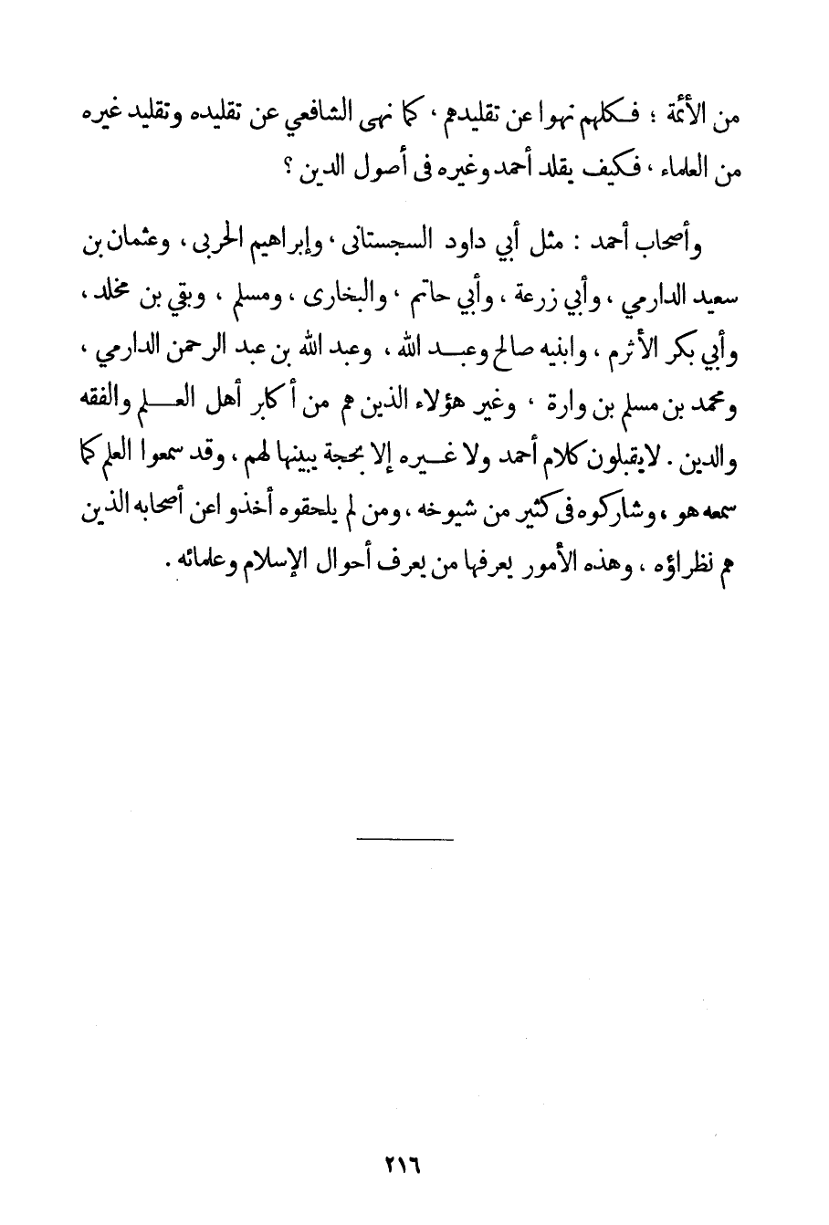 مِنْ الْأَئِمَّةِ؛ فَكُلُّهُمْ نَهَوْا عَنْ تَقْلِيدِهِمْ كَمَا نَهَى الشَّافِعِيُّ عَنْ تَقْلِيدِهِ وَتَقْلِيدِ غَيْرِهِ مِنْ الْعُلَمَاءِ فَكَيْفَ يُقَلَّدُ أَحْمَد وَغَيْرُهُ فِي أُصُولِ الدِّينِ؟ وَأَصْحَابُ أَحْمَد: مِثْلُ أَبِي دَاوُد السجستاني وَإِبْرَاهِيمَ الْحَرْبِيِّ وَعُثْمَانَ بْنِ سَعِيدٍ الدارمي وَأَبِي زُرْعَةَ وَأَبِي حَاتِمٍ وَالْبُخَارِيِّ وَمُسْلِمٍ وبقي بْنِ مخلد وَأَبِي بَكْرٍ الْأَثْرَمِ وَابْنَيْهِ صَالِحٍ وَعَبْدِ اللَّهِ وَعَبْدِ اللَّهِ بْنِ عَبْدِ الرَّحْمَنِ الدارمي وَمُحَمَّدِ بْنِ مُسْلِمِ بْنِ وارة وَغَيْرِ هَؤُلَاءِ الَّذِينَ هُمْ مَنْ أَكَابِرِ أَهْلِ الْعِلْمِ وَالْفِقْهِ وَالدِّينِ. لَا يَقْبَلُونَ كَلَامَ أَحْمَد وَلَا غَيْرِهِ إلَّا بِحُجَّةِ يُبَيِّنُهَا لَهُمْ وَقَدْ سَمِعُوا الْعِلْمَ كَمَا سَمِعَهُ هُوَ وَشَارَكُوهُ فِي كَثِيرٍ مِنْ شُيُوخِهِ وَمَنْ لَمْ يَلْحَقُوهُ أَخَذُوا عَنْ أَصْحَابِهِ الَّذِينَ هُمْ نُظَرَاؤُهُ وَهَذِهِ الْأُمُورُ يَعْرِفُهَا مَنْ يَعْرِفُ أَحْوَالَ الْإِسْلَامِ وَعُلَمَائِهِ.