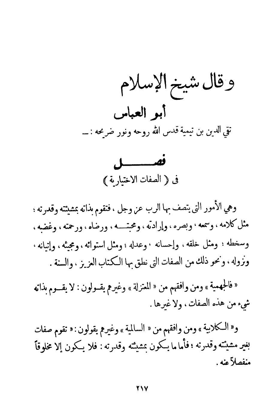 وَهِيَ الْأُمُورُ الَّتِي يَتَّصِفُ بِهَا الرَّبُّ عَزَّ وَجَلَّ فَتَقُومُ بِذَاتِهِ بِمَشِيئَتِهِ وَقُدْرَتِهِ؛ مِثْلُ كَلَامِهِ وَسَمْعِهِ وَبَصَرِهِ وَإِرَادَتِهِ وَمَحَبَّتِهِ وَرِضَاهُ وَرَحْمَتِهِ وَغَضَبِهِ وَسَخَطِهِ؛ وَمِثْلُ خَلْقِهِ وَإِحْسَانِهِ وَعَدْلِهِ؛ وَمِثْلُ اسْتِوَائِهِ وَمَجِيئِهِ وَإِتْيَانِهِ وَنُزُولِهِ وَنَحْوُ ذَلِكَ مِنْ الصِّفَاتِ الَّتِي نَطَقَ بِهَا الْكِتَابُ الْعَزِيزُ وَالسُّنَّةُ. " فالْجَهْمِيَّة " وَمَنْ وَافَقَهُمْ مِنْ " الْمُعْتَزِلَةِ " وَغَيْرِهِمْ يَقُولُونَ: لَا يَقُومُ بِذَاتِهِ شَيْءٌ مِنْ هَذِهِ الصِّفَاتِ وَلَا غَيْرِهَا. وَ " الْكُلَّابِيَة " وَمَنْ وَافَقَهُمْ مِنْ " السالمية " وَغَيْرِهِمْ يَقُولُونَ: " تَقُومُ صِفَاتٌ بِغَيْرِ مَشِيئَتِهِ وَقُدْرَتِهِ؛ فَأَمَّا مَا يَكُونُ بِمَشِيئَتِهِ وَقُدْرَتِهِ: فَلَا يَكُونُ إلَّا مَخْلُوقًا مُنْفَصِلًا عَنْهُ ".