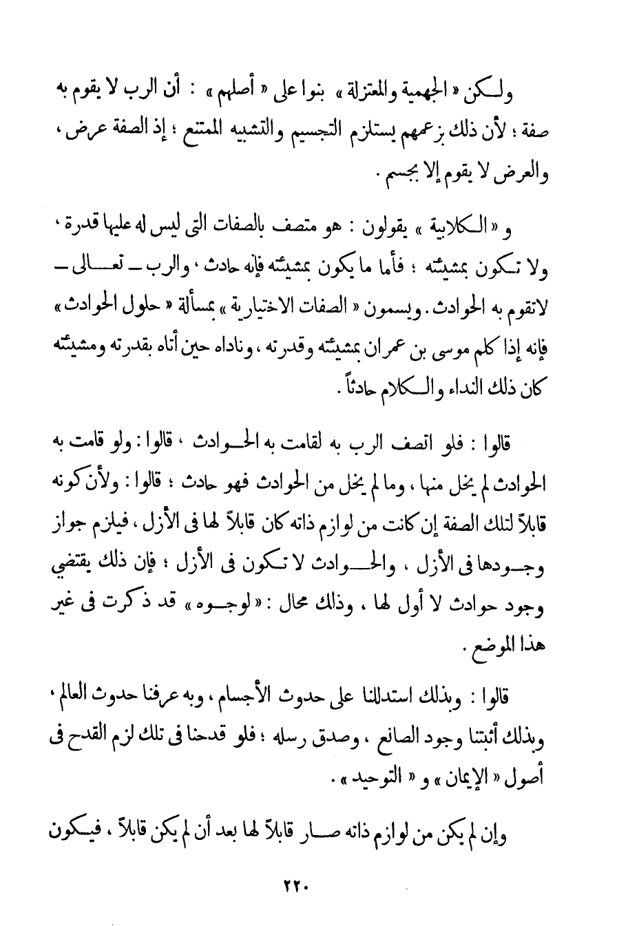 وَلَكِنَّ " الْجَهْمِيَّة وَالْمُعْتَزِلَةَ " بَنَوْا عَلَى " أَصْلِهِمْ ": أَنَّ الرَّبَّ لَا يَقُومُ بِهِ صِفَةٌ؛ لِأَنَّ ذَلِكَ بِزَعْمِهِمْ يَسْتَلْزِمُ التَّجْسِيمَ وَالتَّشْبِيهَ الْمُمْتَنِعَ؛ إذْ الصِّفَةُ عَرَضٌ وَالْعَرَضُ لَا يَقُومُ إلَّا بِجِسْمِ. وَ " الْكُلَّابِيَة " يَقُولُونَ: هُوَ مُتَّصِفٌ بِالصِّفَاتِ الَّتِي لَيْسَ لَهُ عَلَيْهَا قُدْرَةٌ وَلَا تَكُونُ بِمَشِيئَتِهِ؛ فَأَمَّا مَا يَكُونُ بِمَشِيئَتِهِ فَإِنَّهُ حَادِثٌ وَالرَّبُّ - تَعَالَى - لَا تَقُومُ بِهِ الْحَوَادِثُ. وَيُسَمُّونَ " الصِّفَاتِ الِاخْتِيَارِيَّةَ " بِمَسْأَلَةِ " حُلُولِ الْحَوَادِثِ " فَإِنَّهُ إذَا كَلَّمَ مُوسَى بْنَ عِمْرَانَ بِمَشِيئَتِهِ وَقُدْرَتِهِ وَنَادَاهُ حِينَ أَتَاهُ بِقُدْرَتِهِ وَمَشِيئَتِهِ كَانَ ذَلِكَ النِّدَاءُ وَالْكَلَامُ حَادِثًا. قَالُوا: فَلَوْ اتَّصَفَ الرَّبُّ بِهِ لَقَامَتْ بِهِ الْحَوَادِثُ قَالُوا: وَلَوْ قَامَتْ بِهِ الْحَوَادِثُ لَمْ يَخْلُ مِنْهَا وَمَا لَمْ يَخْلُ مِنْ الْحَوَادِثِ فَهُوَ حَادِثٌ؛ قَالُوا: وَلِأَنَّ كَوْنَهُ قَابِلًا لِتِلْكَ الصِّفَةِ إنْ كَانَتْ مِنْ لَوَازِمِ ذَاتِهِ كَانَ قَابِلًا لَهَا فِي الْأَزَلِ فَيَلْزَمُ جَوَازُ وُجُودِهَا فِي الْأَزَلِ وَالْحَوَادِثُ لَا تَكُونُ فِي الْأَزَلِ؛ فَإِنَّ ذَلِكَ يَقْتَضِي وُجُودَ حَوَادِثَ لَا أَوَّلَ لَهَا وَذَلِكَ مُحَالٌ: " لِوُجُوهِ " قَدْ ذُكِرَتْ فِي غَيْرِ هَذَا الْمَوْضِعِ. قَالُوا: وَبِذَلِكَ اسْتَدْلَلْنَا عَلَى حُدُوثِ الْأَجْسَامِ وَبِهِ عَرَفْنَا حُدُوثَ الْعَالَمِ وَبِذَلِكَ أَثْبَتْنَا وُجُودَ الْمَانِعِ وَصِدْقَ رُسُلِهِ؛ فَلَوْ قَدَحْنَا فِي تِلْكَ لَزِمَ الْقَدْحُ فِي أُصُولِ " الْإِيمَانِ " وَ " التَّوْحِيدِ ". وَإِنْ لَمْ يَكُنْ مِنْ لَوَازِمِ ذَاتِهِ صَارَ قَابِلًا لَهَا بَعْدَ أَنْ لَمْ يَكُنْ قَابِلًا فَيَكُونُ