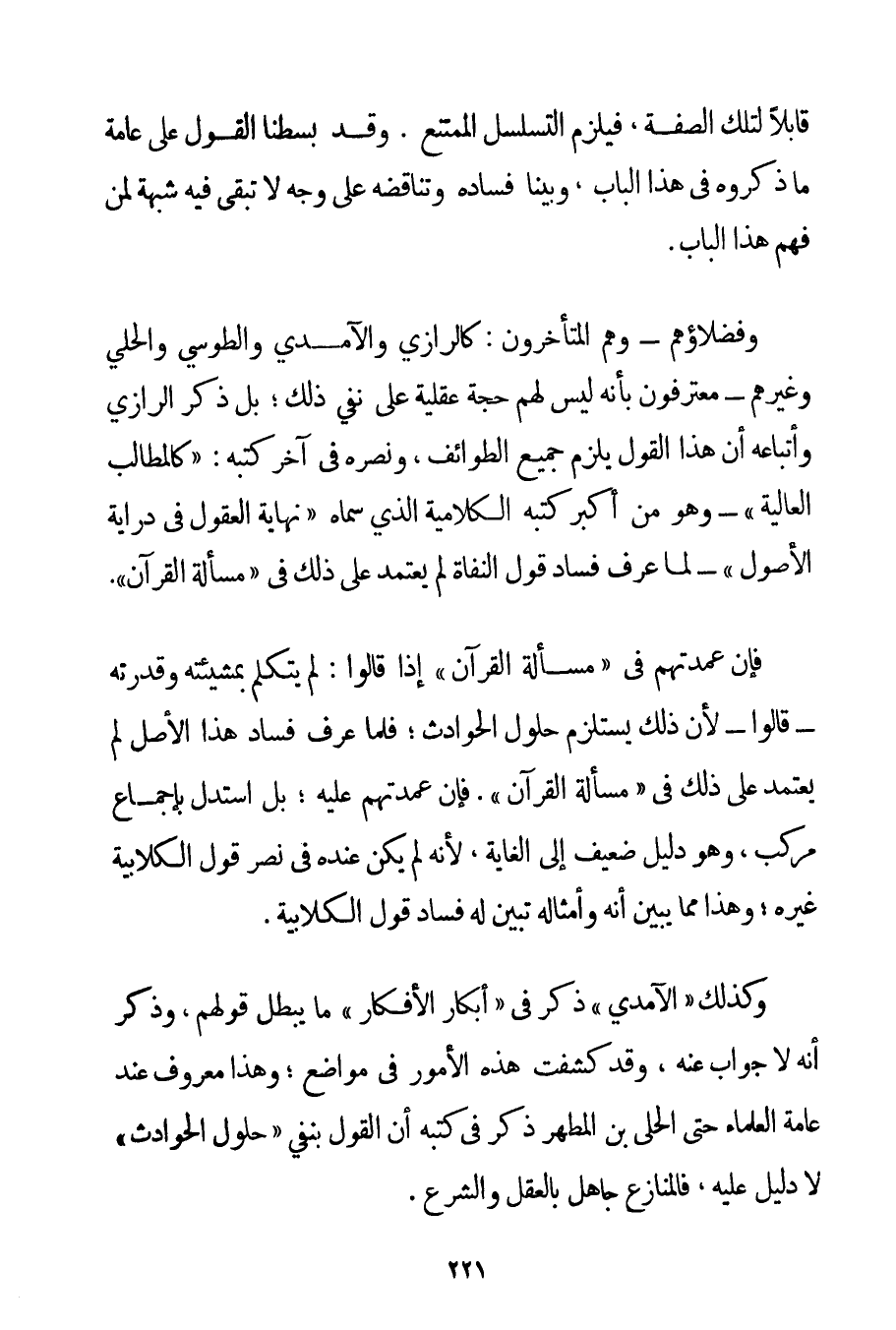 قَابِلًا لِتِلْكَ الصِّفَةِ فَيَلْزَمُ التَّسَلْسُلُ الْمُمْتَنِعُ. وَقَدْ بَسَطْنَا الْقَوْلَ عَلَى عَامَّةِ مَا ذَكَرُوهُ فِي هَذَا الْبَابِ وَبَيَّنَّا فَسَادَهُ وَتَنَاقُضَهُ عَلَى وَجْهٍ لَا تَبْقَى فِيهِ شُبْهَةٌ لِمَنْ فَهِمَ هَذَا الْبَابَ. وَفُضَلَاؤُهُمْ - وَهُمْ الْمُتَأَخِّرُونَ: كالرَّازِي والآمدي والطوسي وَالْحُلِيِّ وَغَيْرِهِمْ - مُعْتَرِفُونَ بِأَنَّهُ لَيْسَ لَهُمْ حُجَّةٌ عَقْلِيَّةٌ عَلَى نَفْيِ ذَلِكَ؛ بَلْ ذَكَرَ الرَّازِي وَأَتْبَاعُهُ أَنَّ هَذَا الْقَوْلَ يَلْزَمُ جَمِيعَ الطَّوَائِفِ وَنَصَرَهُ فِي آخِرِ كُتُبِهِ: " كَالْمَطَالِبِ الْعَالِيَةِ " - وَهُوَ مِنْ أَكْبَرِ كُتُبِهِ الْكَلَامِيَّةِ الَّذِي سَمَّاهُ " نِهَايَةَ الْعُقُولِ فِي دِرَايَةِ الْأُصُولِ " - لَمَّا عَرَفَ فَسَادَ قَوْلِ الْنُّفَاةِ لَمْ يَعْتَمِدْ عَلَى ذَلِكَ فِي " مَسْأَلَةِ الْقُرْآنِ ". فَإِنَّ عُمْدَتَهُمْ فِي " مَسْأَلَةِ الْقُرْآنِ " إذَا قَالُوا: لَمْ يَتَكَلَّمْ بِمَشِيئَتِهِ وَقُدْرَتِهِ - قَالُوا - لِأَنَّ ذَلِكَ يَسْتَلْزِمُ حُلُولَ الْحَوَادِثِ؛ فَلَمَّا عَرَفَ فَسَادَ هَذَا الْأَصْلِ لَمْ يَعْتَمِدْ عَلَى ذَلِكَ فِي " مَسْأَلَةِ الْقُرْآنِ ". فَإِنَّ عُمْدَتَهُمْ عَلَيْهِ؛ بَلْ اسْتَدَلَّ بِإِجْمَاعِ مُرَكَّبٍ وَهُوَ دَلِيلٌ ضَعِيفٌ إلَى الْغَايَةِ لِأَنَّهُ لَمْ يَكُنْ عِنْدَهُ فِي نَصْرِ قَوْلِ الْكُلَّابِيَة غَيْرُهُ؛ وَهَذَا مِمَّا يُبَيِّنُ أَنَّهُ وَأَمْثَالُهُ تَبَيَّنَ لَهُ فَسَادُ قَوْلِ الْكُلَّابِيَة. وَكَذَلِكَ " الآمدي " ذَكَرَ فِي " أَبْكَارِ الْأَفْكَارِ " مَا يُبْطِلُ قَوْلَهُمْ وَذَكَرَ أَنَّهُ لَا جَوَابَ عَنْهُ وَقَدْ كَشَفْت هَذِهِ الْأُمُورَ فِي مَوَاضِعَ؛ وَهَذَا مَعْرُوفٌ عِنْدَ عَامَّةِ الْعُلَمَاءِ حَتَّى الْحِلِيُّ بْنُ الْمُطَهَّرِ ذَكَرَ فِي كُتُبِهِ أَنَّ الْقَوْلَ بِنَفْيِ " حُلُولِ الْحَوَادِثِ " لَا دَلِيلَ عَلَيْهِ فَالْمُنَازِعُ جَاهِلٌ بِالْعَقْلِ وَالشَّرْعِ.