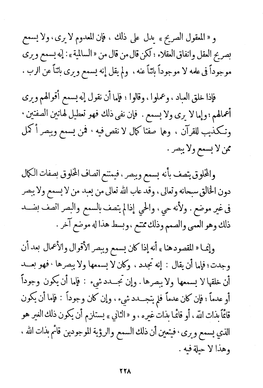 وَ " الْمَعْقُولُ الصَّرِيحُ " يَدُلُّ عَلَى ذَلِكَ فَإِنَّ الْمَعْدُومَ لَا يَرَى وَلَا يَسْمَعُ بِصَرِيحِ الْعَقْلِ وَاتِّفَاقِ الْعُقَلَاءِ؛ لَكِنْ قَالَ مَنْ قَالَ مِنْ " السالمية ": إنَّهُ يَسْمَعُ وَيَرَى مَوْجُودًا فِي عِلْمِهِ لَا مَوْجُودًا بَائِنًا عَنْهُ وَلَمْ يَقُلْ إنَّهُ يَسْمَعُ وَيَرَى بَائِنًا عَنْ الرَّبِّ. فَإِذَا خَلَقَ الْعِبَادَ وَعَمِلُوا وَقَالُوا؛ فَإِمَّا أَنْ نَقُولَ إنَّهُ يَسْمَعُ أَقْوَالَهُمْ وَيَرَى أَعْمَالَهُمْ؛ وَإِمَّا لَا يَرَى وَلَا يَسْمَعُ. فَإِنْ نَفَى ذَلِكَ فَهُوَ تَعْطِيلٌ لِهَاتَيْنِ الصِّفَتَيْنِ وَتَكْذِيبٌ لِلْقُرْآنِ وَهُمَا صِفَتَا كَمَالٍ لَا نَقْصَ فِيهِ فَمَنْ يَسْمَعُ وَيُبْصِرُ أَكْمَلُ مِمَّنْ لَا يَسْمَعُ وَلَا يُبْصِرُ. وَالْمَخْلُوقُ يَتَّصِفُ بِأَنَّهُ يَسْمَعُ وَيُبْصِرُ فَيَمْتَنِعُ اتِّصَافُ الْمَخْلُوقِ بِصِفَاتِ الْكَمَالِ دُونَ الْخَالِقِ سُبْحَانَهُ وَتَعَالَى وَقَدْ عَابَ اللَّهُ تَعَالَى مَنْ يَعْبُدُ مَنْ لَا يَسْمَعُ وَلَا يُبْصِرُ فِي غَيْرِ مَوْضِعٍ؛ وَلِأَنَّهُ حَيٌّ وَالْحَيُّ إذَا لَمْ يَتَّصِفْ بِالسَّمْعِ وَالْبَصَرِ اتَّصَفَ بِضِدِّ ذَلِكَ وَهُوَ الْعَمَى وَالصَّمَمُ وَذَلِكَ مُمْتَنِعٌ وَبَسْطُ هَذَا لَهُ مَوْضِعٌ آخَرُ. وَإِنَّمَا " الْمَقْصُودُ هُنَا " أَنَّهُ إذَا كَانَ يَسْمَعُ وَيُبْصِرُ الْأَقْوَالَ وَالْأَعْمَالَ بَعْدَ أَنْ وُجِدَتْ؛ فَإِمَّا أَنْ يُقَالَ: إنَّهُ تَجَدُّدٌ وَكَانَ لَا يَسْمَعُهَا وَلَا يُبْصِرُهَا فَهُوَ بَعْدَ أَنْ خَلَقَهَا لَا يَسْمَعُهَا وَلَا يُبْصِرُهَا. وَإِنْ تَجَدَّدَ شَيْءٌ: فَإِمَّا أَنْ يَكُونَ وُجُودًا أَوْ عَدَمًا؛ فَإِنْ كَانَ عَدَمًا فَلَمْ يَتَجَدَّدْ شَيْءٌ وَإِنْ كَانَ وُجُودًا: فَإِمَّا أَنْ يَكُونَ قَائِمًا بِذَاتِ اللَّهِ أَوْ قَائِمًا بِذَاتِ غَيْرِهِ وَ " الثَّانِي " يَسْتَلْزِمُ أَنْ يَكُونَ ذَلِكَ الْغَيْرُ هُوَ الَّذِي يَسْمَعُ وَيَرَى فَيَتَعَيَّنُ أَنَّ ذَلِكَ السَّمْعَ وَالرُّؤْيَةَ الْمَوْجُودَيْنِ قَائِمٌ بِذَاتِ اللَّهِ وَهَذَا لَا حِيلَةَ فِيهِ.