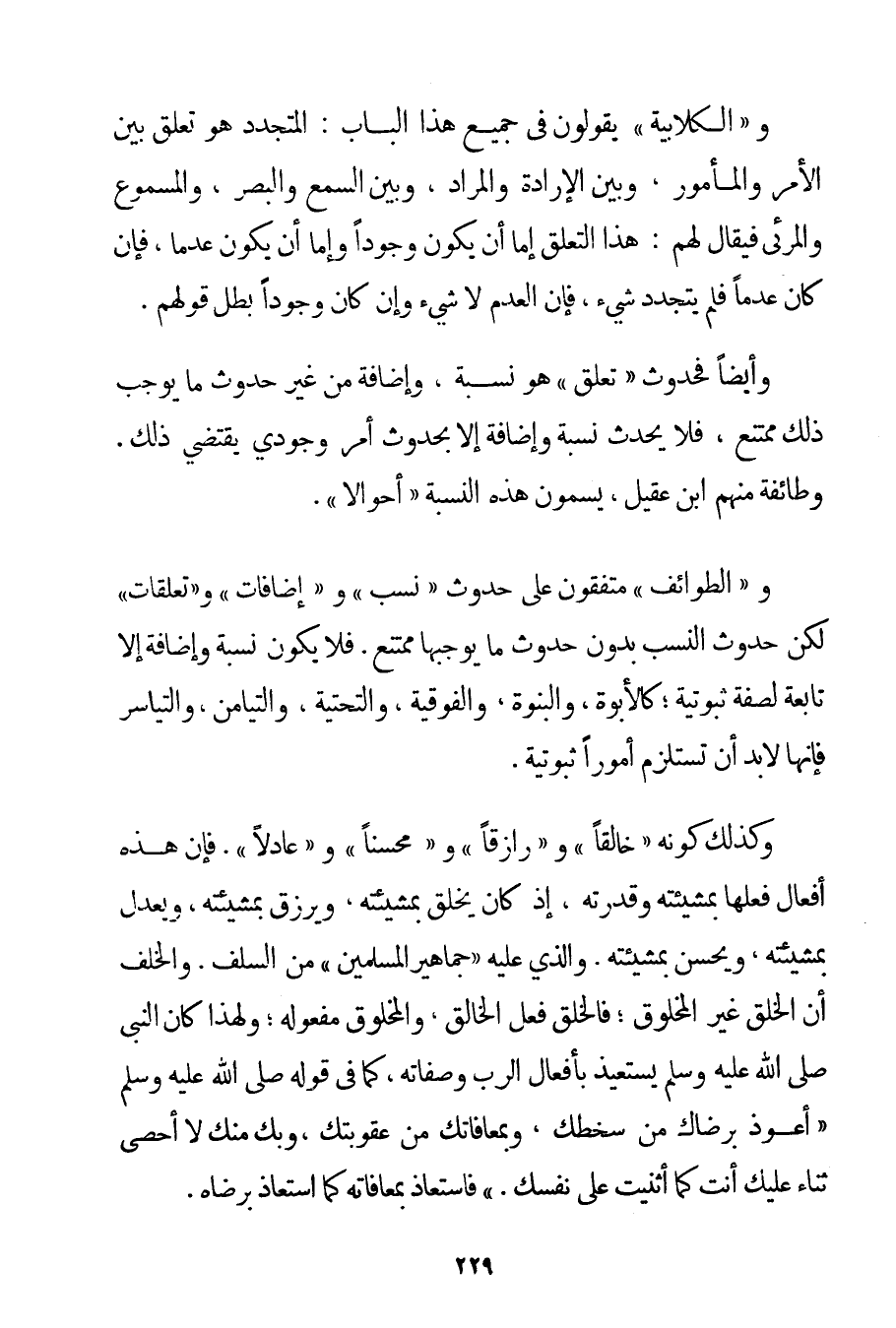 وَ " الْكُلَّابِيَة " يَقُولُونَ فِي جَمِيعِ هَذَا الْبَابِ: الْمُتَجَدِّدُ هُوَ تَعَلُّقٌ بَيْنَ الْأَمْرِ وَالْمَأْمُورِ وَبَيْنَ الْإِرَادَةِ وَالْمُرَادِ وَبَيْنَ السَّمْعِ وَالْبَصَرِ وَالْمَسْمُوعِ وَالْمَرْئِيِّ فَيُقَالُ لَهُمْ: هَذَا التَّعَلُّقُ إمَّا أَنْ يَكُونَ وُجُودًا وَإِمَّا أَنْ يَكُونَ عَدَمًا فَإِنْ كَانَ عَدَمًا فَلَمْ يَتَجَدَّدْ شَيْءٌ فَإِنَّ الْعَدَمَ لَا شَيْءَ وَإِنْ كَانَ وُجُودًا بَطَلَ قَوْلُهُمْ. وَأَيْضًا فَحُدُوثُ " تَعَلُّقٍ " هُوَ نِسْبَةٌ وَإِضَافَةٌ مِنْ غَيْرِ حُدُوثِ مَا يُوجِبُ ذَلِكَ مُمْتَنِعٌ فَلَا يَحْدُثُ نِسْبَةً وَإِضَافَةً إلَّا بِحُدُوثِ أَمْرٍ وُجُودِيٍّ يَقْتَضِي ذَلِكَ. وَطَائِفَةٌ مِنْهُمْ ابْنُ عَقِيلٍ يُسَمُّونَ هَذِهِ النِّسْبَةَ " أَحْوَالًا ". وَ " الطَّوَائِفُ " مُتَّفِقُونَ عَلَى حُدُوثِ " نِسَبٍ " وَ " إضَافَاتٍ " وَ " تَعَلُّقَاتٍ " لَكِنْ حُدُوثُ النَّسَبِ بِدُونِ حُدُوثِ مَا يُوجِبُهَا مُمْتَنِعٌ. فَلَا يَكُونُ نِسْبَةً وَإِضَافَةً إلَّا تَابِعَةً لِصِفَةِ ثُبُوتِيَّةٍ؛ كَالْأُبُوَّةِ وَالْبُنُوَّةِ وَالْفَوْقِيَّةِ وَالتَّحْتِيَّةِ وَالتَّيَامُنِ وَالتَّيَاسُرِ فَإِنَّهَا لَا بُدَّ أَنْ تَسْتَلْزِمَ أُمُورًا ثُبُوتِيَّةً. وَكَذَلِكَ كَوْنُهُ " خَالِقًا " وَ " رَازِقًا " وَ " مُحْسِنًا " وَ " عَادِلًا " فَإِنَّ هَذِهِ أَفْعَالٌ فَعَلَهَا بِمَشِيئَتِهِ وَقُدْرَتِهِ إذْ كَانَ يَخْلُقُ بِمَشِيئَتِهِ وَيَرْزُقُ بِمَشِيئَتِهِ. وَيَعْدِلُ بِمَشِيئَتِهِ وَيُحْسِنُ بِمَشِيئَتِهِ. وَاَلَّذِي عَلَيْهِ " جَمَاهِيرُ الْمُسْلِمِينَ " مِنْ السَّلَفِ. وَالْخَلَفِ أَنَّ الْخَلْقَ غَيْرُ الْمَخْلُوقِ؛ فَالْخَلْقُ فِعْلُ الْخَالِقِ وَالْمَخْلُوقُ مَفْعُولُهُ؛ وَلِهَذَا كَانَ النَّبِيُّ صَلَّى اللَّهُ عَلَيْهِ وَسَلَّمَ يَسْتَعِيذُ بِأَفْعَالِ الرَّبِّ وَصِفَاتِهِ كَمَا فِي قَوْلِهِ صَلَّى اللَّهُ عَلَيْهِ وَسَلَّمَ " {أَعُوذُ بِرِضَاك مِنْ سَخَطِك وَبِمُعَافَاتِك مِنْ عُقُوبَتِك وَبِك مِنْك لَا أُحْصِي ثَنَاءً عَلَيْك أَنْتَ كَمَا أَثْنَيْت عَلَى نَفْسِك.} " فَاسْتَعَاذَ بِمُعَافَاتِهِ كَمَا اسْتَعَاذَ بِرِضَاهُ.