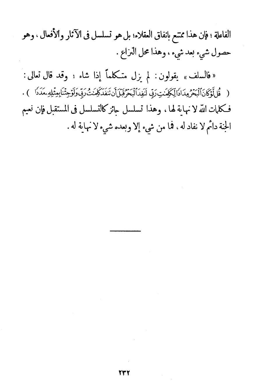 الْفَاعِلَةِ؛ فَإِنَّ هَذَا مُمْتَنِعٌ بِاتِّفَاقِ الْعُقَلَاءِ؛ بَلْ هُوَ تَسَلْسُلٌ فِي الْآثَارِ وَالْأَفْعَالِ وَهُوَ حُصُولُ شَيْءٍ بَعْدَ شَيْءٍ وَهَذَا مَحَلُّ النِّزَاعِ. " فَالسَّلَفُ " يَقُولُونَ: لَمْ يَزَلْ مُتَكَلِّمًا إذَا شَاءَ؛ وَقَدْ قَالَ تَعَالَى: {قُلْ لَوْ كَانَ الْبَحْرُ مِدَادًا لِكَلِمَاتِ رَبِّي لَنَفِدَ الْبَحْرُ قَبْلَ أَنْ تَنْفَدَ كَلِمَاتُ رَبِّي وَلَوْ جِئْنَا بِمِثْلِهِ مَدَدًا} . فَكَلِمَاتُ اللَّهِ لَا نِهَايَةَ لَهَا وَهَذَا تَسَلْسُلٌ جَائِزٌ كَالتَّسَلْسُلِ فِي الْمُسْتَقْبَلِ فَإِنَّ نَعِيمَ الْجَنَّةِ دَائِمٌ لَا نَفَادَ لَهُ فَمَا مِنْ شَيْءٍ إلَّا وَبَعْدَهُ شَيْءٌ لَا نِهَايَةَ لَهُ.