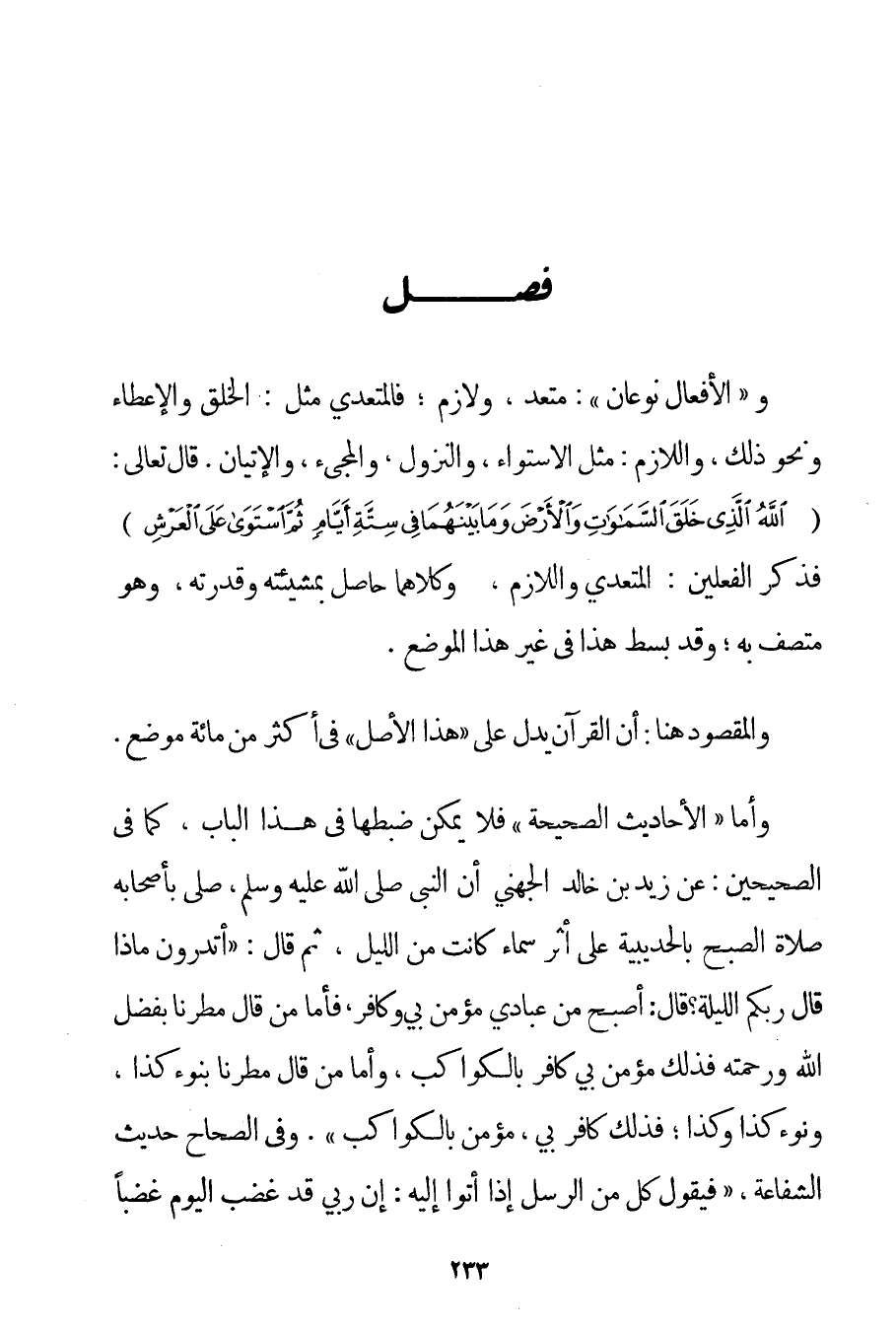 وَ " الْأَفْعَالُ نَوْعَانِ ": مُتَعَدٍّ وَلَازِمٌ. فَالْمُتَعَدِّي مِثْلُ: الْخَلْقِ وَالْإِعْطَاءِ وَنَحْوِ ذَلِكَ وَاللَّازِمُ: مِثْلُ الِاسْتِوَاءِ وَالنُّزُولِ وَالْمَجِيءِ وَالْإِتْيَانِ. قَالَ تَعَالَى: {هُوَ الَّذِي خَلَقَ السَّمَاوَاتِ وَالْأَرْضَ وَمَا بَيَْنَهُمَا فِي سِتَّةِ أَيَّامٍ ثُمَّ اسْتَوَى عَلَى الْعَرْشِ} فَذَكَرَ الْفِعْلَيْنِ: الْمُتَعَدِّي وَاللَّازِمَ وَكِلَاهُمَا حَاصِلٌ بِمَشِيئَتِهِ وَقُدْرَتِهِ وَهُوَ مُتَّصِفٌ بِهِ؛ وَقَدْ بُسِطَ هَذَا فِي غَيْرِ هَذَا الْمَوْضِعِ. وَالْمَقْصُودُ هُنَا: أَنَّ الْقُرْآنَ يَدُلُّ عَلَى " هَذَا الْأَصْلِ " فِي أَكْثَرِ مِنْ مِائَةِ مَوْضِعٍ. وَأَمَّا " الْأَحَادِيثُ الصَّحِيحَةِ " فَلَا يُمْكِنُ ضَبْطُهَا فِي هَذَا الْبَابِ كَمَا فِي الصَّحِيحَيْنِ: عَنْ زَيْدِ بْنِ خَالِدٍ الجهني {أَنَّ النَّبِيَّ صَلَّى اللَّهُ عَلَيْهِ وَسَلَّمَ صَلَّى بِأَصْحَابِهِ صَلَاةَ الصُّبْحِ بالحديبية عَلَى أَثَرِ سَمَاءٍ كَانَتْ مِنْ اللَّيْلِ ثُمَّ قَالَ: أَتَدْرُونَ مَاذَا قَالَ رَبُّكُمْ اللَّيْلَةَ؟ قَالَ: أَصْبَحَ مِنْ عِبَادِي مُؤْمِنٌ بِي وَكَافِرٌ فَأَمَّا مَنْ قَالَ مُطِرْنَا بِفَضْلِ اللَّهِ وَرَحْمَتِهِ فَذَلِكَ مُؤْمِنٌ بِي كَافِرٌ بِالْكَوَاكِبِ وَأَمَّا مَنْ قَالَ مُطِرْنَا بِنَوْءِ كَذَا وَنَوْءِ كَذَا وَكَذَا؛ فَذَلِكَ كَافِرٌ بِي مُؤْمِنٌ بِالْكَوَاكِبِ} ". وَفِي الصِّحَاحِ حَدِيثُ الشَّفَاعَةِ " {فَيَقُولُ كُلٌّ مِنْ الرُّسُلِ إذَا أَتَوْا إلَيْهِ: إنَّ رَبِّي قَدْ غَضِبَ الْيَوْمَ غَضَبًا