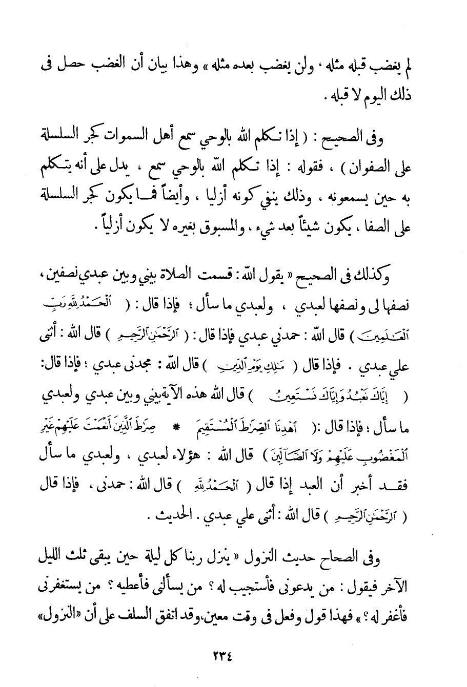 لَمْ يَغْضَبْ قَبْلَهُ مِثْلَهُ وَلَنْ يَغْضَبْ بَعْدَهُ مِثْلَهُ} " وَهَذَا بَيَانُ أَنَّ الْغَضَبَ حَصَلَ فِي ذَلِكَ الْيَوْمِ لَا قَبْلَهُ. وَفِي الصَّحِيحِ: ( {إذَا تَكَلَّمَ اللَّهُ بِالْوَحْيِ سَمِعَ أَهْلُ السَّمَوَاتِ كَجَرِّ السِّلْسِلَةِ عَلَى الصَّفْوَانِ} فَقَوْلُهُ: إذَا تَكَلَّمَ اللَّهُ بِالْوَحْيِ سَمِعَ يَدُلُّ عَلَى أَنَّهُ يَتَكَلَّمُ بِهِ حِينَ يَسْمَعُونَهُ وَذَلِكَ يَنْفِي كَوْنَهُ أَزَلِيًّا وَأَيْضًا فَمَا يَكُونُ كَجَرِّ السِّلْسِلَةِ عَلَى الصَّفَا يَكُونُ شَيْئًا بَعْدَ شَيْءٍ وَالْمَسْبُوقُ بِغَيْرِهِ لَا يَكُونُ أَزَلِيًّا. وَكَذَلِكَ فِي الصَّحِيحِ " {يَقُولُ اللَّهُ: قَسَمْت الصَّلَاةَ بَيْنِي وَبَيْنَ عَبْدِي نِصْفَيْنِ نِصْفُهَا لِي وَنِصْفُهَا لِعَبْدِي وَلِعَبْدِي مَا سَأَلَ؛ فَإِذَا قَالَ: {الْحَمْدُ لِلَّهِ رَبِّ الْعَالَمِينَ} قَالَ اللَّهُ: حَمِدَنِي عَبْدِي فَإِذَا قَالَ: {الرَّحْمَنِ الرَّحِيمِ} قَالَ اللَّهُ: أَثْنَى عَلَيَّ عَبْدِي. فَإِذَا قَالَ {مَالِكِ يَوْمِ الدِّينِ} قَالَ اللَّهُ: مَجَّدَنِي عَبْدِي؛ فَإِذَا قَالَ: {إيَّاكَ نَعْبُدُ وَإِيَّاكَ نَسْتَعِينُ} قَالَ اللَّهُ هَذِهِ الْآيَةُ بَيْنِي وَبَيْنَ عَبْدِي وَلِعَبْدِي مَا سَأَلَ؛ فَإِذَا قَالَ: {اهْدِنَا الصِّرَاطَ الْمُسْتَقِيمَ} {صِرَاطَ الَّذِينَ أَنْعَمْتَ عَلَيْهِمْ غَيْرِ الْمَغْضُوبِ عَلَيْهِمْ وَلَا الضَّالِّينَ} قَالَ اللَّهُ: هَؤُلَاءِ لِعَبْدِي وَلِعَبْدِي مَا سَأَلَ} فَقَدْ أَخْبَرَ أَنَّ الْعَبْدَ إذَا قَالَ {الْحَمْدُ لِلَّهِ} قَالَ اللَّهُ: حَمِدَنِي فَإِذَا قَالَ {الرَّحْمَنِ الرَّحِيمِ} قَالَ اللَّهُ: أَثْنَى عَلَيَّ عَبْدِي الْحَدِيثُ. وَفِي الصِّحَاحِ حَدِيثُ النُّزُولِ " {يَنْزِلُ رَبُّنَا كُلَّ لَيْلَةٍ حِينَ يَبْقَى ثُلْثُ اللَّيْلِ الْآخِرُ فَيَقُولُ: مَنْ يَدْعُونِي فَأَسْتَجِيبَ لَهُ؟ مَنْ يَسْأَلُنِي فَأُعْطِيَهُ؟ مَنْ يَسْتَغْفِرُنِي فَأَغْفِرَ لَهُ؟} " فَهَذَا قَوْلٌ وَفِعْلٌ فِي وَقْتٍ مُعَيَّنٍ وَقَدْ اتَّفَقَ السَّلَفُ عَلَى أَنَّ " النُّزُولَ "