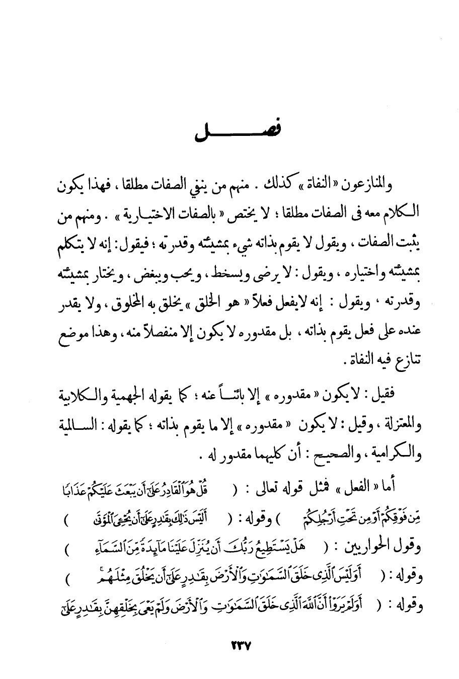 وَالْمُنَازِعُونَ " الْنُّفَاةِ " كَذَلِكَ. مِنْهُمْ مَنْ يَنْفِي الصِّفَاتِ مُطْلَقًا فَهَذَا يَكُونُ الْكَلَامُ مَعَهُ فِي الصِّفَاتِ مُطْلَقًا؛ لَا يَخْتَصُّ " بِالصِّفَاتِ الِاخْتِيَارِيَّةِ ". وَمِنْهُمْ مَنْ يُثْبِتُ الصِّفَاتِ وَيَقُولُ لَا يَقُومُ بِذَاتِهِ شَيْءٌ بِمَشِيئَتِهِ وَقُدْرَتِهِ؛ فَيَقُولُ: إنَّهُ لَا يَتَكَلَّمُ بِمَشِيئَتِهِ وَاخْتِيَارِهِ وَيَقُولُ: لَا يَرْضَى وَيَسْخَطُ وَيُحِبُّ وَيُبْغِضُ وَيَخْتَارُ بِمَشِيئَتِهِ وَقُدْرَتِهِ وَيَقُولُ: إنَّهُ لَا يَفْعَلُ فِعْلًا " هُوَ الْخَلْقُ " يَخْلُقُ بِهِ الْمَخْلُوقَ وَلَا يَقْدِرُ عِنْدَهُ عَلَى فِعْلٍ يَقُومُ بِذَاتِهِ بَلْ مَقْدُورُهُ لَا يَكُونُ إلَّا مُنْفَصِلًا مِنْهُ وَهَذَا مَوْضِعٌ تَنَازَعَ فِيهِ الْنُّفَاةِ. فَقِيلَ: لَا يَكُونُ " مَقْدُورُهُ " إلَّا بَائِنًا عَنْهُ؛ كَمَا يَقُولُهُ الْجَهْمِيَّة والْكُلَّابِيَة وَالْمُعْتَزِلَةُ وَقِيلَ: لَا يَكُونُ " مَقْدُورُهُ " إلَّا مَا يَقُومُ بِذَاتِهِ؛ كَمَا يَقُولُهُ: السالمية والكَرَّامِيَة وَالصَّحِيحُ: أَنَّ كِلَيْهِمَا مَقْدُورٌ لَهُ. أَمَّا " الْفِعْلُ " فَمِثْلُ قَوْله تَعَالَى {قُلْ هُوَ الْقَادِرُ عَلَى أَنْ يَبْعَثَ عَلَيْكُمْ عَذَابًا مِنْ فَوْقِكُمْ أَوْ مِنْ تَحْتِ أَرْجُلِكُمْ} وَقَوْلِهِ: {أَلَيْسَ ذَلِكَ بِقَادِرٍ عَلَى أَنْ يُحْيِيَ الْمَوْتَى} وَقَوْلِ الْحَوَارِيِّينَ: {هَلْ يَسْتَطِيعُ رَبُّكَ أَنْ يُنَزِّلَ عَلَيْنَا مَائِدَةً مِنَ السَّمَاءِ} وَقَوْلِهِ: {أَوَلَيْسَ الَّذِي خَلَقَ السَّمَاوَاتِ وَالْأَرْضَ بِقَادِرٍ عَلَى أَنْ يَخْلُقَ مِثْلَهُمْ} وَقَوْلِهِ: {أَوَلَمْ يَرَوْا أَنَّ اللَّهَ الَّذِي خَلَقَ السَّمَاوَاتِ وَالْأَرْضَ وَلَمْ يَعْيَ
