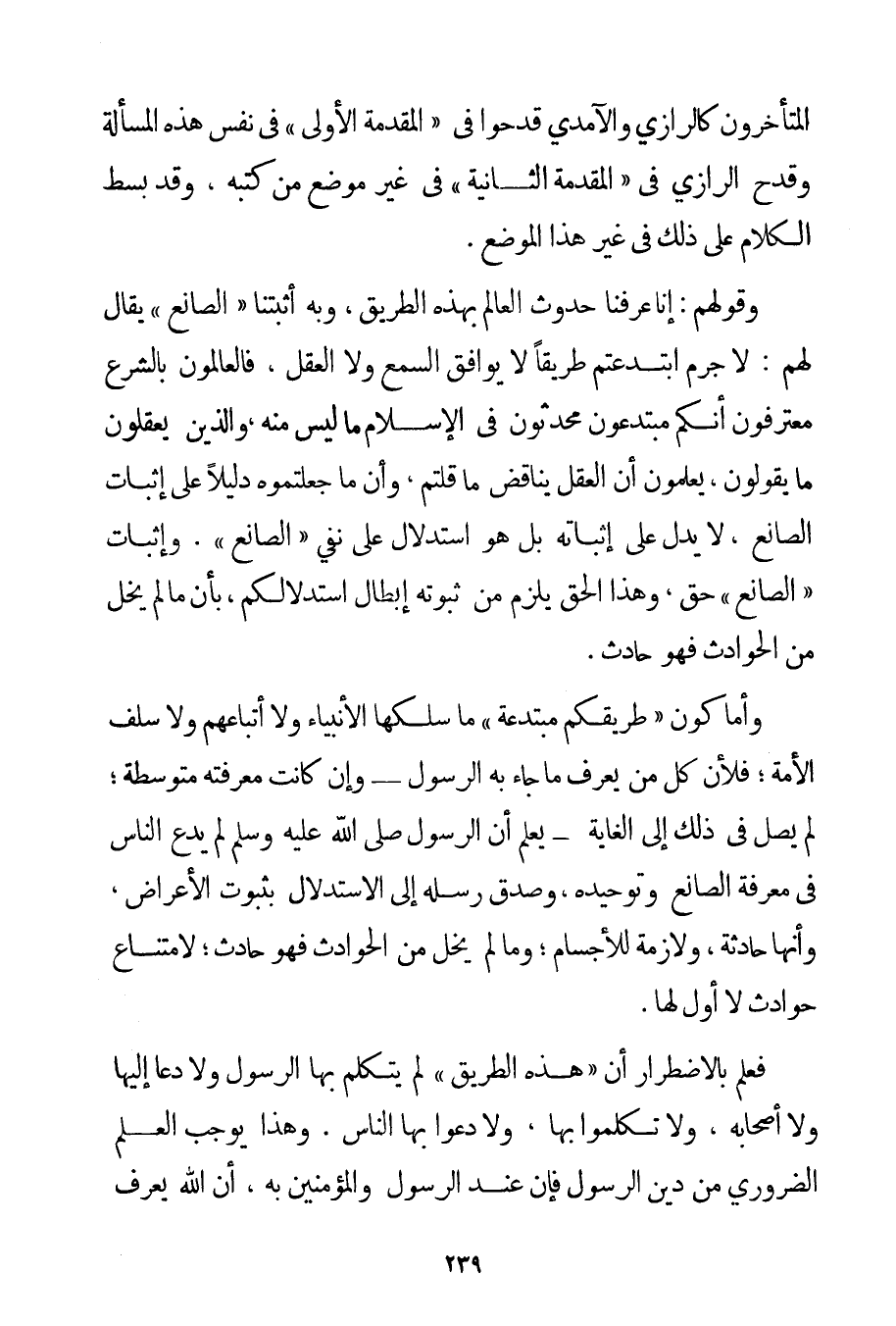 الْمُتَأَخِّرُونَ كالرَّازِي والآمدي قَدَحُوا فِي " الْمُقَدِّمَةِ الْأُولَى " فِي نَفْسِ هَذِهِ الْمَسْأَلَةِ وَقَدَحَ الرَّازِي فِي " الْمُقَدِّمَةِ الثَّانِيَةِ " فِي غَيْرِ مَوْضِعٍ مِنْ كُتُبِهِ وَقَدْ بُسِطَ الْكَلَامُ عَلَى ذَلِكَ فِي غَيْرِ هَذَا الْمَوْضِعِ. وَقَوْلُهُمْ: إنَّا عَرَفْنَا حُدُوثَ الْعَالَمِ بِهَذِهِ الطَّرِيقِ وَبِهِ أَثْبَتْنَا " الصَّانِعَ " يُقَالُ لَهُمْ: لَا جَرَمَ ابْتَدَعْتُمْ طَرِيقًا لَا يُوَافِقُ السَّمْعَ وَلَا الْعَقْلَ فَالْعَالِمُونَ بِالشَّرْعِ مُعْتَرِفُونَ أَنَّكُمْ مُبْتَدِعُونَ مُحْدِثُونَ فِي الْإِسْلَامِ مَا لَيْسَ مِنْهُ وَاَلَّذِينَ يَعْقِلُونَ مَا يَقُولُونَ يَعْلَمُونَ أَنَّ الْعَقْلَ يُنَاقِضُ مَا قُلْتُمْ وَأَنَّ مَا جَعَلْتُمُوهُ دَلِيلًا عَلَى إثْبَاتِ الصَّانِعِ لَا يَدُلُّ عَلَى إثْبَاتِهِ بَلْ هُوَ اسْتِدْلَالٌ عَلَى نَفْيِ " الصَّانِعِ ". وَإِثْبَاتُ " الصَّانِعِ " حَقٌّ وَهَذَا الْحَقُّ يَلْزَمُ مِنْ ثُبُوتِهِ إبْطَالُ اسْتِدْلَالِكُمْ بِأَنَّ مَا لَمْ يَخْلُ مِنْ الْحَوَادِثِ فَهُوَ حَادِثٌ. وَأَمَّا كَوْنُ " طَرِيقِكُمْ مُبْتَدَعَةً " مَا سَلَكَهَا الْأَنْبِيَاءُ وَلَا أَتْبَاعُهُمْ وَلَا سَلَفُ الْأُمَّةِ؛ فَلِأَنَّ كُلَّ مَنْ يَعْرِفُ مَا جَاءَ بِهِ الرَّسُولُ - وَإِنْ كَانَتْ مَعْرِفَتُهُ مُتَوَسِّطَةً؛ لَمْ يَصِلْ فِي ذَلِكَ إلَى الْغَايَةِ - - يَعْلَمُ أَنَّ الرَّسُولَ صَلَّى اللَّهُ عَلَيْهِ وَسَلَّمَ لَمْ يَدْعُ النَّاسَ فِي مَعْرِفَةِ الصَّانِعِ وَتَوْحِيدِهِ وَصِدْقِ رُسُلِهِ إلَى الِاسْتِدْلَالِ بِثُبُوتِ الْأَعْرَاضِ وَأَنَّهَا حَادِثَةٌ وَلَازِمَةٌ لِلْأَجْسَامِ؛ وَمَا لَمْ يَخْلُ مِنْ الْحَوَادِثِ فَهُوَ حَادِثٌ؛ لِامْتِنَاعِ حَوَادِثَ لَا أَوَّلَ لَهَا. فَعُلِمَ بِالِاضْطِرَارِ أَنَّ " هَذِهِ الطَّرِيقَ " لَمْ يَتَكَلَّمْ بِهَا الرَّسُولُ وَلَا دَعَا إلَيْهَا وَلَا أَصْحَابُهُ وَلَا تَكَلَّمُوا بِهَا وَلَا دَعَوْا بِهَا النَّاسَ. وَهَذَا يُوجِبُ الْعِلْمَ الضَّرُورِيَّ مِنْ دِينِ الرَّسُولِ فَإِنَّ عِنْدَ الرَّسُولِ وَالْمُؤْمِنِينَ بِهِ أَنَّ اللَّهَ يُعْرَفُ