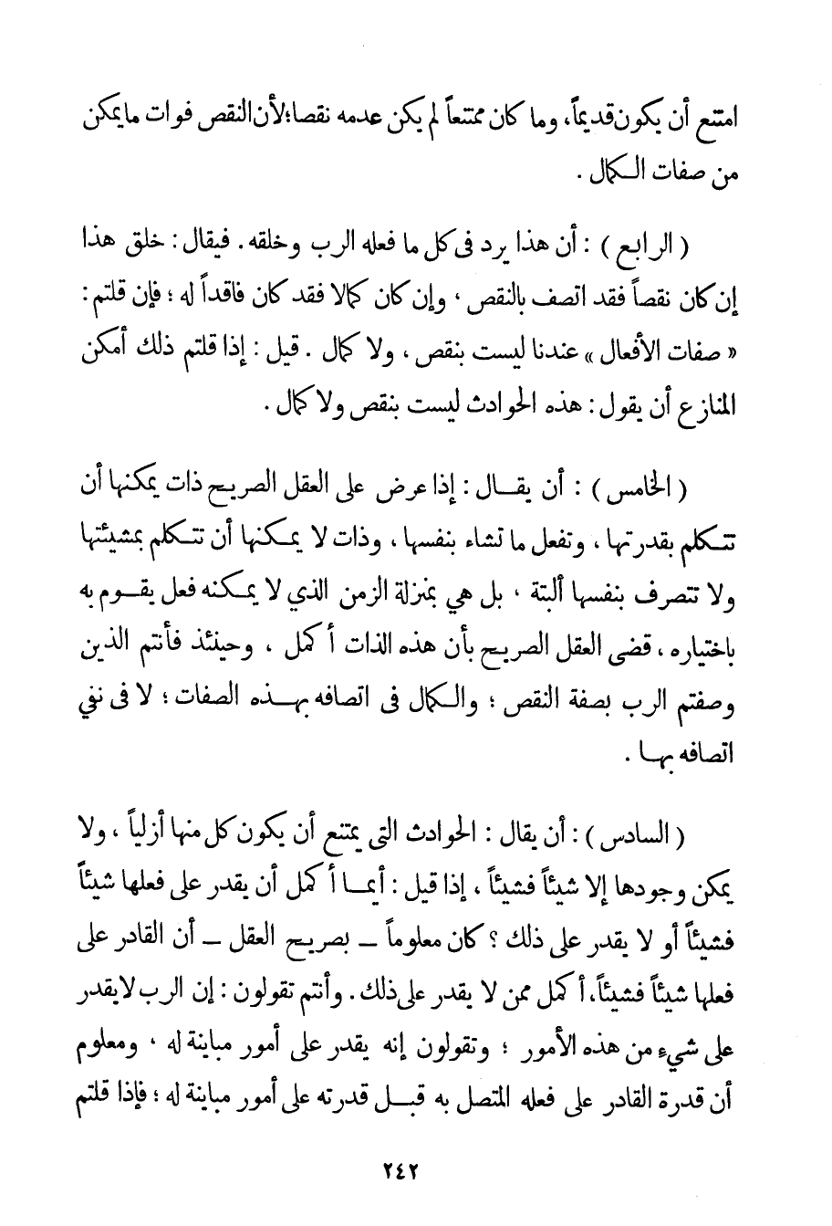 امْتَنَعَ أَنْ يَكُونَ قَدِيمًا وَمَا كَانَ مُمْتَنِعًا لَمْ يَكُنْ عَدَمُهُ نَقْصًا؛ لِأَنَّ النَّقْصَ فَوَاتُ مَا يُمْكِنُ مِنْ صِفَاتِ الْكَمَالِ. (الرَّابِعُ: أَنَّ هَذَا يَرِدُ فِي كُلِّ مَا فَعَلَهُ الرَّبُّ وَخَلَقَهُ. فَيُقَالُ: خَلَقَ هَذَا إنْ كَانَ نَقْصًا فَقَدْ اتَّصَفَ بِالنَّقْصِ وَإِنْ كَانَ كَمَالًا فَقَدْ كَانَ فَاقِدًا لَهُ؛ فَإِنْ قُلْتُمْ: " صِفَاتُ الْأَفْعَالِ " عِنْدَنَا لَيْسَتْ بِنَقْصِ وَلَا كَمَالٍ. قِيلَ: إذَا قُلْتُمْ ذَلِكَ أَمْكَنَ الْمُنَازِعَ أَنْ يَقُولَ: هَذِهِ الْحَوَادِثُ لَيْسَتْ بِنَقْصِ وَلَا كَمَالٍ. (الْخَامِسُ: أَنْ يُقَالَ: إذَا عَرَضَ عَلَى الْعَقْلِ الصَّرِيحِ ذَاتٌ يُمْكِنُهَا أَنْ تَتَكَلَّمَ بِقُدْرَتِهَا وَتَفْعَلَ مَا تَشَاءُ بِنَفْسِهَا وَذَاتٌ لَا يُمْكِنُهَا أَنْ تَتَكَلَّمَ بِمَشِيئَتِهَا وَلَا تَتَصَرَّفَ بِنَفْسِهَا أَلْبَتَّةَ بَلْ هِيَ بِمَنْزِلَةِ الزَّمَنِ الَّذِي لَا يُمْكِنُهُ فِعْلٌ يَقُومُ بِهِ بِاخْتِيَارِهِ قَضَى الْعَقْلُ الصَّرِيحُ بِأَنَّ هَذِهِ الذَّاتَ أَكْمَلُ وَحِينَئِذٍ فَأَنْتُمْ الَّذِينَ وَصَفْتُمْ الرَّبَّ بِصِفَةِ النَّقْصِ؛ وَالْكَمَالُ فِي اتِّصَافِهِ بِهَذِهِ الصِّفَاتِ؛ لَا فِي نَفْيِ اتِّصَافِهِ بِهَا. (السَّادِسُ: أَنْ يُقَالَ: الْحَوَادِثُ الَّتِي يَمْتَنِعُ أَنْ يَكُونَ كُلٌّ مِنْهَا أَزَلِيًّا وَلَا يُمْكِنُ وُجُودُهَا إلَّا شَيْئًا فَشَيْئًا إذَا قِيلَ: أَيُّمَا أَكْمَلُ أَنْ يَقْدِرَ عَلَى فِعْلِهَا شَيْئًا فَشَيْئًا أَوْ لَا يَقْدِرَ عَلَى ذَلِكَ؟ كَانَ مَعْلُومًا - بِصَرِيحِ الْعَقْلِ - أَنَّ الْقَادِرَ عَلَى فِعْلِهَا شَيْئًا فَشَيْئًا أَكْمَلُ مِمَّنْ لَا يَقْدِرُ عَلَى ذَلِكَ. وَأَنْتُمْ تَقُولُونَ: إنَّ الرَّبَّ لَا يَقْدِرُ عَلَى شَيْءٍ مِنْ هَذِهِ الْأُمُورِ؛ وَتَقُولُونَ إنَّهُ يَقْدِرُ عَلَى أُمُورٍ مُبَايِنَةٍ لَهُ وَمَعْلُومٌ أَنَّ قُدْرَةَ الْقَادِرِ عَلَى فِعْلِهِ الْمُتَّصِلِ بِهِ قَبْلَ قُدْرَتِهِ عَلَى أُمُورٍ مُبَايِنَةٍ لَهُ؛ فَإِذَا قُلْتُمْ