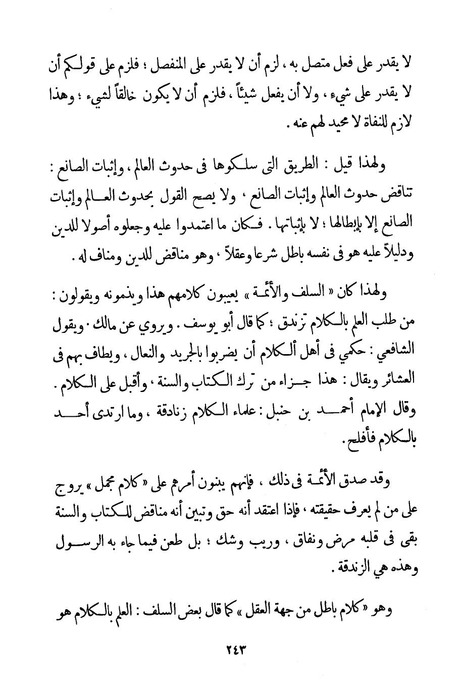 لَا يَقْدِرُ عَلَى فِعْلٍ مُتَّصِلٍ بِهِ لَزِمَ أَنْ لَا يَقْدِرَ عَلَى الْمُنْفَصِلِ؛ فَلَزِمَ عَلَى قَوْلِكُمْ أَنْ لَا يَقْدِرَ عَلَى شَيْءٍ وَلَا أَنْ يَفْعَلَ شَيْئًا فَلَزِمَ أَنْ لَا يَكُونَ خَالِقًا لِشَيْءِ؛ وَهَذَا لَازِمٌ للنفاة لَا مَحِيدَ لَهُمْ عَنْهُ. وَلِهَذَا قِيلَ: الطَّرِيقُ الَّتِي سَلَكُوهَا فِي حُدُوثِ الْعَالَمِ وَإِثْبَاتِ الصَّانِعِ: تُنَاقِضُ حُدُوثَ الْعَالَمِ وَإِثْبَاتِ الصَّانِعِ وَلَا يَصِحُّ الْقَوْلُ بِحُدُوثِ الْعَالَمِ وَإِثْبَاتِ الصَّانِعِ إلَّا بِإِبْطَالِهَا؛ لَا بِإِثْبَاتِهَا. فَكَانَ مَا اعْتَمَدُوا عَلَيْهِ وَجَعَلُوهُ أُصُولًا لِلدِّينِ وَدَلِيلًا عَلَيْهِ هُوَ فِي نَفْسِهِ بَاطِلٌ شَرْعًا وَعَقْلًا وَهُوَ مُنَاقِضٌ لِلدِّينِ وَمُنَافٍ لَهُ. وَلِهَذَا كَانَ " السَّلَفُ وَالْأَئِمَّةُ " يَعِيبُونَ كَلَامَهُمْ هَذَا وَيَذُمُّونَهُ وَيَقُولُونَ: مَنْ طَلَبَ الْعِلْمَ بِالْكَلَامِ تَزَنْدَقَ؛ كَمَا قَالَ أَبُو يُوسُفَ. وَيَرْوِي عَنْ مَالِكٍ. وَيَقُولُ الشَّافِعِيُّ: حُكْمِي فِي أَهْلِ الْكَلَامِ أَنْ يُضْرَبُوا بِالْجَرِيدِ وَالنِّعَالِ وَيُطَافَ بِهِمْ فِي الْعَشَائِرِ وَيُقَالَ: هَذَا جَزَاءُ مَنْ تَرَكَ الْكِتَابَ وَالسُّنَّةَ وَأَقْبَلَ عَلَى الْكَلَامِ. وَقَالَ الْإِمَامُ أَحْمَدُ بْنُ حَنْبَلٍ: عُلَمَاءُ الْكَلَامِ زَنَادِقَةٌ وَمَا ارْتَدَى أَحَدٌ بِالْكَلَامِ فَأَفْلَحَ. وَقَدْ صَدَقَ الْأَئِمَّةُ فِي ذَلِكَ فَإِنَّهُمْ يَبْنُونَ أَمْرَهُمْ عَلَى " كَلَامٍ مُجْمَلٍ " يَرُوجُ عَلَى مَنْ لَمْ يَعْرِفْ حَقِيقَتَهُ فَإِذَا اعْتَقَدَ أَنَّهُ حَقٌّ وَتَبَيَّنَ أَنَّهُ مُنَاقِضٌ لِلْكِتَابِ وَالسُّنَّةِ بَقِيَ فِي قَلْبِهِ مَرَضٌ وَنِفَاقٌ وَرَيْبٌ وَشَكٌّ؛ بَلْ طَعَنَ فِيمَا جَاءَ بِهِ الرَّسُولُ وَهَذِهِ هِيَ الزَّنْدَقَةُ. وَهُوَ " كَلَامٌ بَاطِلٌ مِنْ جِهَةِ الْعَقْلِ " كَمَا قَالَ بَعْضُ السَّلَفِ: الْعِلْمُ بِالْكَلَامِ هُوَ