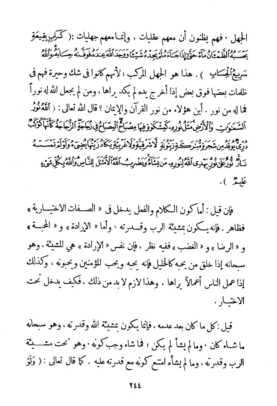 الْجَهْلُ فَهُمْ يَظُنُّونَ أَنَّ مَعَهُمْ عَقْلِيَّاتٌ وَإِنَّمَا مَعَهُمْ جهليات: {كَسَرَابٍ بِقِيعَةٍ يَحْسَبُهُ الظَّمْآنُ مَاءً حَتَّى إذَا جَاءَهُ لَمْ يَجِدْهُ شَيْئًا وَوَجَدَ اللَّهَ عِنْدَهُ فَوَفَّاهُ حِسَابَهُ وَاللَّهُ سَرِيعُ الْحِسَابِ} . هَذَا هُوَ الْجَهْلُ الْمُرَكَّبُ؛ لِأَنَّهُمْ كَانُوا فِي شَكٍّ وَحِيرَةٍ فَهُمْ فِي ظُلُمَاتٍ بَعْضُهَا فَوْقَ بَعْضٍ إذَا أَخْرَجَ يَدَهُ لَمْ يَكَدْ يَرَاهَا وَمَنْ لَمْ يَجْعَلْ اللَّهُ لَهُ نُورًا فَمَا لَهُ مِنْ نُورٍ. أَيْنَ هَؤُلَاءِ مِنْ نُورِ الْقُرْآنِ وَالْإِيمَانِ؟ قَالَ اللَّهُ تَعَالَى: {اللَّهُ نُورُ السَّمَاوَاتِ وَالْأَرْضِ مَثَلُ نُورِهِ كَمِشْكَاةٍ فِيهَا مِصْبَاحٌ الْمِصْبَاحُ فِي زُجَاجَةٍ الزُّجَاجَةُ كَأَنَّهَا كَوْكَبٌ دُرِّيٌّ يُوقَدُ مِنْ شَجَرَةٍ مُبَارَكَةٍ زَيْتُونَةٍ لَا شَرْقِيَّةٍ وَلَا غَرْبِيَّةٍ يَكَادُ زَيْتُهَا يُضِيءُ وَلَوْ لَمْ تَمْسَسْهُ نَارٌ نُورٌ عَلَى نُورٍ يَهْدِي اللَّهُ لِنُورِهِ مَنْ يَشَاءُ وَيَضْرِبُ اللَّهُ الْأَمْثَالَ لِلنَّاسِ وَاللَّهُ بِكُلِّ شَيْءٍ عَلِيمٌ} . فَإِنْ قِيلَ: أَمَّا كَوْنُ الْكَلَامِ وَالْفِعْلِ يَدْخُلُ فِي " الصِّفَاتِ الِاخْتِيَارِيَّةِ " فَظَاهِرٌ. فَإِنَّهُ يَكُونُ بِمَشِيئَةِ الرَّبِّ وَقُدْرَتِهِ وَأَمَّا " الْإِرَادَةُ " وَ " الْمَحَبَّةُ " وَ " الرِّضَا " وَ " الْغَضَبُ " فَفِيهِ نَظَرٌ فَإِنَّ نَفْسَ " الْإِرَادَةِ " هِيَ الْمَشِيئَةُ وَهُوَ سُبْحَانَهُ إذَا خَلَقَ مَنْ يُحِبُّهُ كَالْخَلِيلِ فَإِنَّهُ يُحِبُّهُ وَيُحِبُّ الْمُؤْمِنِينَ وَيُحِبُّونَهُ وَكَذَلِكَ إذَا عَمِلَ النَّاسُ أَعْمَالًا يَرَاهَا وَهَذَا لَازِمٌ لَا بُدَّ مِنْ ذَلِكَ فَكَيْفَ يَدْخُلُ تَحْتَ الِاخْتِيَارِ. قِيلَ: كُلُّ مَا كَانَ بَعْدَ عَدَمِهِ فَإِنَّمَا يَكُونُ بِمَشِيئَةِ اللَّهِ وَقُدْرَتِهِ وَهُوَ سُبْحَانَهُ مَا شَاءَ كَانَ وَمَا لَمْ يَشَأْ لَمْ يَكُنْ؛ فَمَا شَاءَ وَجَبَ كَوْنُهُ وَهُوَ تَحْتَ مَشِيئَةِ الرَّبِّ وَقُدْرَتِهِ وَمَا لَمْ يَشَأْهُ امْتَنَعَ كَوْنُهُ مَعَ قُدْرَتِهِ عَلَيْهِ، كَمَا قَالَ تَعَالَى: