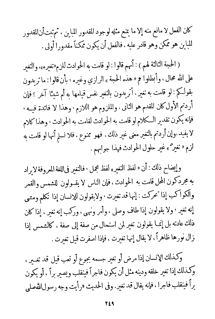 كَانَ الْفِعْلُ لَا مَانِعَ مِنْهُ إلَّا مَا يَمْنَعُ مِثْلُهُ لِوُجُودِ الْمَقْدُورِ الْمُبَايِنِ ثُمَّ ثَبَتَ أَنَّ الْمَقْدُورَ الْمُبَايِنَ هُوَ مُمْكِنٌ وَهُوَ قَادِرٌ عَلَيْهِ فَالْفِعْلُ أَنْ يَكُونَ مُمْكِنًا مَقْدُورًا أَوْلَى. (الْحُجَّةُ الثَّالِثَةُ لَهُمْ: أَنَّهُمْ قَالُوا: لَوْ قَامَتْ بِهِ الْحَوَادِثُ لَلَزِمَ " تَغَيُّرُهُ " وَالتَّغَيُّرُ عَلَى اللَّهِ مُحَالٌ وَأَبْطَلُوا هُمْ " هَذِهِ الْحُجَّةَ " الرَّازِي وَغَيْرُهُ؛ بِأَنْ قَالُوا: مَا تُرِيدُونَ بِقَوْلِكُمْ: لَوْ قَامَتْ بِهِ تَغَيَّرَ أَتُرِيدُونَ بِالتَّغَيُّرِ نَفْسَ قِيَامِهَا بِهِ أَمْ شَيْئًا آخَرَ؟ فَإِنْ أَرَدْتُمْ الْأَوَّلَ كَانَ الْمُقَدَّمُ هُوَ الثَّانِي وَالْمَلْزُومُ هُوَ اللَّازِمُ وَهَذَا لَا فَائِدَةَ فِيهِ فَإِنَّهُ يَكُونُ تَقْدِيرُ الْكَلَامِ لَوْ قَامَتْ بِهِ الْحَوَادِثُ لَقَامَتْ بِهِ الْحَوَادِثُ وَهَذَا كَلَامٌ لَا يُفِيدُ وَإِنْ أَرَدْتُمْ بِالتَّغَيُّرِ مَعْنًى غَيْرَ ذَلِكَ فَهُوَ مَمْنُوعٌ فَلَا نُسَلِّمُ أَنَّهَا لَوْ قَامَتْ بِهِ لَزِمَ " تَغَيُّرٌ " غَيْرُ حُلُولِ الْحَوَادِثِ فَهَذَا جَوَابُهُمْ. وَإِيضَاحُ ذَلِكَ: أَنَّ " لَفْظَ التَّغَيُّرِ " لَفْظٌ مُجْمَلٌ فَالتَّغَيُّرُ فِي اللُّغَةِ الْمَعْرُوفَةِ لَا يُرَادُ بِهِ مُجَرَّدُ كَوْنِ الْمَحَلِّ قَامَتْ بِهِ الْحَوَادِثُ فَإِنَّ النَّاسَ لَا يَقُولُونَ لِلشَّمْسِ وَالْقَمَرِ وَالْكَوَاكِبِ إذَا تَحَرَّكَتْ: إنَّهَا قَدْ تَغَيَّرَتْ وَلَا يَقُولُونَ لِلْإِنْسَانِ إذَا تَكَلَّمَ وَمَشَى إنَّهُ تَغَيَّرَ وَلَا يَقُولُونَ إذَا طَافَ وَصَلَّى وَأَمَرَ وَنَهَى وَرَكِبَ إنَّهُ تَغَيَّرَ إذَا كَانَ ذَلِكَ عَادَتُهُ بَلْ إنَّمَا يَقُولُونَ تَغَيَّرَ لِمَنْ اسْتَحَالَ مِنْ صِفَةٍ إلَى صِفَةٍ كَالشَّمْسِ إذَا زَالَ نُورُهَا ظَاهِرًا لَا يُقَالُ إنَّهَا تَغَيَّرَتْ فَإِذَا اصْفَرَّتْ قِيلَ تَغَيَّرَتْ. وَكَذَلِكَ الْإِنْسَانُ إذَا مَرِضَ أَوْ تَغَيَّرَ جِسْمُهُ بِجُوعِ أَوْ تَعَبٍ قِيلَ قَدْ تَغَيَّرَ وَكَذَلِكَ إذَا تَغَيَّرَ خُلُقُهُ وَدِينُهُ مِثْلُ أَنْ يَكُونَ فَاجِرًا فَيَنْقَلِبَ وَيَصِيرَ بَرًّا أَوْ يَكُونَ بَرًّا فَيَنْقَلِبَ فَاجِرًا فَإِنَّهُ يُقَالُ قَدْ تَغَيَّرَ. وَفِي الْحَدِيثِ {رَأَيْت وَجْهَ رَسُولِ اللَّهِ