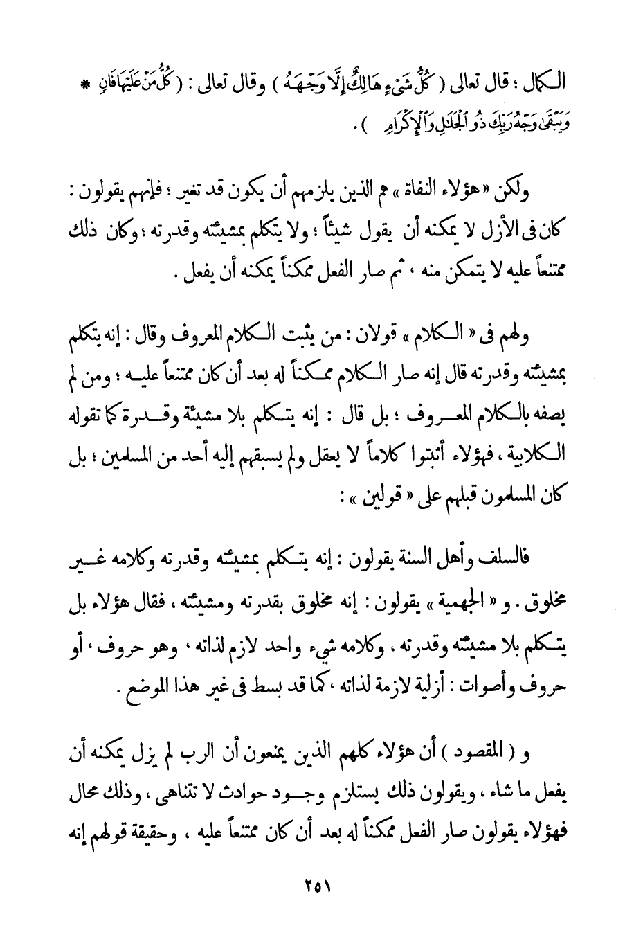 الْكَمَالِ؛ قَالَ تَعَالَى {كُلُّ شَيْءٍ هَالِكٌ إلَّا وَجْهَهُ} وَقَالَ تَعَالَى: {كُلُّ مَنْ عَلَيْهَا فَانٍ} {وَيَبْقَى وَجْهُ رَبِّكَ ذُو الْجَلَالِ وَالْإِكْرَامِ} . وَلَكِنْ " هَؤُلَاءِ الْنُّفَاةِ " هُمْ الَّذِينَ يَلْزَمُهُمْ أَنْ يَكُونَ قَدْ تَغَيَّرَ؛ فَإِنَّهُمْ يَقُولُونَ: كَانَ فِي الْأَزَلِ لَا يُمْكِنُهُ أَنْ يَقُولَ شَيْئًا؛ وَلَا يَتَكَلَّمَ بِمَشِيئَتِهِ وَقُدْرَتِهِ؛ وَكَانَ ذَلِكَ مُمْتَنِعًا عَلَيْهِ لَا يَتَمَكَّنُ مِنْهُ ثُمَّ صَارَ الْفِعْلُ مُمْكِنًا يُمْكِنُهُ أَنْ يَفْعَلَ. وَلَهُمْ فِي " الْكَلَامِ " قَوْلَانِ: مَنْ يُثْبِتُ الْكَلَامَ الْمَعْرُوفَ وَقَالَ: إنَّهُ يَتَكَلَّمُ بِمَشِيئَتِهِ وَقُدْرَتِهِ قَالَ إنَّهُ صَارَ الْكَلَامُ مُمْكِنًا لَهُ بَعْدَ أَنْ كَانَ مُمْتَنِعًا عَلَيْهِ؛ وَمَنْ لَمْ يَصِفْهُ بِالْكَلَامِ الْمَعْرُوفِ؛ بَلْ قَالَ: إنَّهُ يَتَكَلَّمُ بِلَا مَشِيئَةٍ وَقُدْرَةٍ كَمَا تَقُولُهُ الْكُلَّابِيَة فَهَؤُلَاءِ أَثْبَتُوا كَلَامًا لَا يُعْقَلُ وَلَمْ يَسْبِقْهُمْ إلَيْهِ أَحَدٌ مِنْ الْمُسْلِمِينَ؛ بَلْ كَانَ الْمُسْلِمُونَ قَبْلَهُمْ عَلَى " قَوْلَيْنِ ": فَالسَّلَفُ وَأَهْلُ السُّنَّةِ يَقُولُونَ: إنَّهُ يَتَكَلَّمُ بِمَشِيئَتِهِ وَقُدْرَتِهِ وَكَلَامُهُ غَيْرُ مَخْلُوقٍ. وَ " الْجَهْمِيَّة " يَقُولُونَ: إنَّهُ مَخْلُوقٌ بِقُدْرَتِهِ وَمَشِيئَتِهِ فَقَالَ هَؤُلَاءِ بَلْ يَتَكَلَّمُ بِلَا مَشِيئَتِهِ وَقُدْرَتِهِ وَكَلَامُهُ شَيْءٌ وَاحِدٌ لَازِمٌ لِذَاتِهِ وَهُوَ حُرُوفٌ أَوْ حُرُوفٌ وَأَصْوَاتٌ: أَزَلِيَّةٌ لَازِمَةٌ لِذَاتِهِ كَمَا قَدْ بُسِطَ فِي غَيْرِ هَذَا الْمَوْضِعِ. وَ (الْمَقْصُودُ أَنَّ هَؤُلَاءِ كُلَّهُمْ الَّذِينَ يَمْنَعُونَ أَنَّ الرَّبَّ لَمْ يَزَلْ يُمْكِنُهُ أَنْ يَفْعَلَ مَا شَاءَ وَيَقُولُونَ ذَلِكَ يَسْتَلْزِمُ وُجُودَ حَوَادِثَ لَا تَتَنَاهَى وَذَلِكَ مُحَالٌ فَهَؤُلَاءِ يَقُولُونَ صَارَ الْفِعْلُ مُمْكِنًا لَهُ بَعْدَ أَنْ كَانَ مُمْتَنِعًا عَلَيْهِ وَحَقِيقَةُ قَوْلِهِمْ إنَّهُ