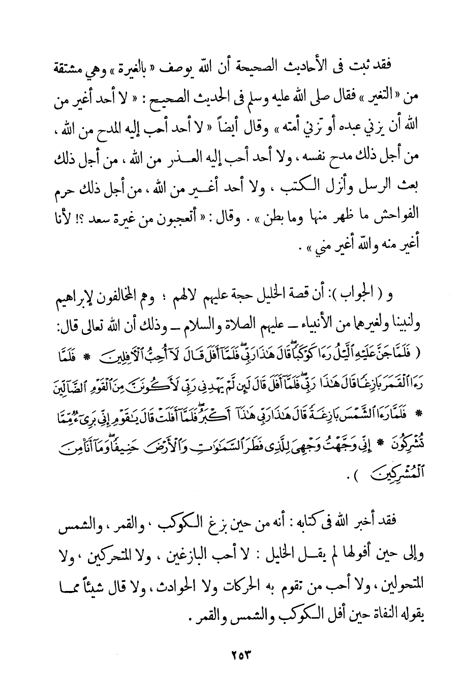 فَقَدْ ثَبَتَ فِي الْأَحَادِيثِ الصَّحِيحَةِ أَنَّ اللَّهَ يُوصَفُ " بِالْغَيْرَةِ " وَهِيَ مُشْتَقَّةٌ مِنْ " التَّغَيُّرِ " فَقَالَ صَلَّى اللَّهُ عَلَيْهِ وَسَلَّمَ فِي الْحَدِيثِ الصَّحِيحِ: " {لَا أَحَدَ أَغْيَرُ مِنْ اللَّهِ أَنْ يَزْنِيَ عَبْدُهُ أَوْ تَزْنِيَ أَمَتُهُ} " وَقَالَ أَيْضًا " {لَا أَحَدَ أَحَبُّ إلَيْهِ الْمَدْحُ مِنْ اللَّهِ مِنْ أَجْلِ ذَلِكَ مَدَحَ نَفْسَهُ وَلَا أَحَدَ أَحَبُّ إلَيْهِ الْعُذْرُ مِنْ اللَّهِ مِنْ أَجْلِ ذَلِكَ بَعَثَ الرُّسُلَ وَأَنْزَلَ الْكُتُبَ وَلَا أَحَدَ أَغْيَرُ مِنْ اللَّهِ مِنْ أَجْلِ ذَلِكَ حَرَّمَ الْفَوَاحِشَ مَا ظَهَرَ مِنْهَا وَمَا بَطَنَ} ". وَقَالَ: " {أَتَعْجَبُونَ مِنْ غَيْرَةِ سَعْدٍ لَأَنَا أَغْيَرُ مِنْهُ وَاَللَّهُ أَغْيَرُ مِنِّي} . وَ (الْجَوَابُ: أَنَّ قِصَّةَ الْخَلِيلِ حُجَّةٌ عَلَيْهِمْ لَا لَهُمْ؛ وَهُمْ الْمُخَالِفُونَ لِإِبْرَاهِيمَ وَلِنَبِيِّنَا وَلِغَيْرِهِمَا مِنْ الْأَنْبِيَاءِ - عَلَيْهِمْ الصَّلَاةُ وَالسَّلَامُ - وَذَلِكَ أَنَّ اللَّهَ تَعَالَى قَالَ: {فَلَمَّا جَنَّ عَلَيْهِ اللَّيْلُ رَأَى كَوْكَبًا قَالَ هَذَا رَبِّي فَلَمَّا أَفَلَ قَالَ لَا أُحِبُّ الْآفِلِينَ} {فَلَمَّا رَأَى الْقَمَرَ بَازِغًا قَالَ هَذَا رَبِّي فَلَمَّا أَفَلَ قَالَ لَئِنْ لَمْ يَهْدِنِي رَبِّي لَأَكُونَنَّ مِنَ الْقَوْمِ الضَّالِّينَ} {فَلَمَّا رَأَى الشَّمْسَ بَازِغَةً قَالَ هَذَا رَبِّي هَذَا أَكْبَرُ فَلَمَّا أَفَلَتْ قَالَ يَا قَوْمِ إنِّي بَرِيءٌ مِمَّا تُشْرِكُونَ} {إنِّي وَجَّهْتُ وَجْهِيَ لِلَّذِي فَطَرَ السَّمَاوَاتِ وَالْأَرْضَ حَنِيفًا وَمَا أَنَا مِنَ الْمُشْرِكِينَ} . فَقَدْ أَخْبَرَ اللَّهُ فِي كِتَابِهِ: أَنَّهُ مِنْ حِينِ بَزَغَ الْكَوْكَبُ وَالْقَمَرُ وَالشَّمْسُ وَإِلَى حِينِ أُفُولِهَا لَمْ يَقُلْ الْخَلِيلُ: لَا أُحِبُّ الْبَازِغِينَ وَلَا الْمُتَحَرِّكِينَ وَلَا الْمُتَحَوِّلِينَ وَلَا أُحِبُّ مَنْ تَقُومُ بِهِ الْحَرَكَاتُ وَلَا الْحَوَادِثُ وَلَا قَالَ شَيْئًا مِمَّا يَقُولُهُ الْنُّفَاةِ حِينَ أَفَلَ الْكَوْكَبُ وَالشَّمْسُ وَالْقَمَرُ.