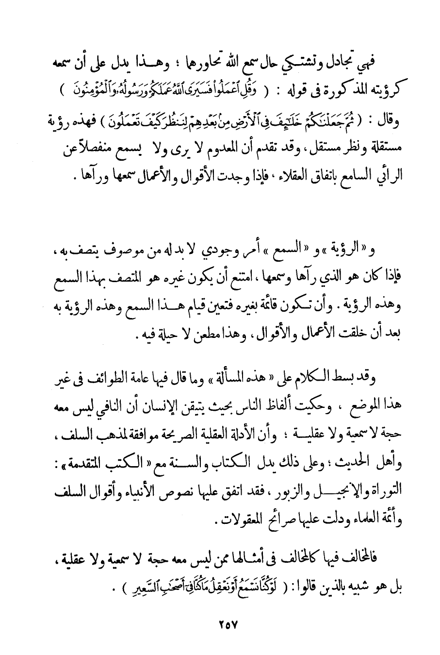 فَهِيَ تُجَادِلُ وَتَشْتَكِي حَالَ سَمْعِ اللَّهِ تَحَاوُرَهُمَا؛ وَهَذَا يَدُلُّ عَلَى أَنَّ سَمْعَهُ كَرُؤْيَتِهِ الْمَذْكُورَةِ فِي قَوْلِهِ: {وَقُلِ اعْمَلُوا فَسَيَرَى اللَّهُ عَمَلَكُمْ وَرَسُولُهُ وَالْمُؤْمِنُونَ} وَقَالَ: {ثُمَّ جَعَلْنَاكُمْ خَلَائِفَ فِي الْأَرْضِ مِنْ بَعْدِهِمْ لِنَنْظُرَ كَيْفَ تَعْمَلُونَ} فَهَذِهِ رُؤْيَةٌ مُسْتَقِلَّةٌ وَنَظَرٌ مُسْتَقِلٌّ وَقَدْ تَقَدَّمَ أَنَّ الْمَعْدُومَ لَا يَرَى وَلَا يَسْمَعُ مُنْفَصِلًا عَنْ الرَّائِي السَّامِعِ بِاتِّفَاقِ الْعُقَلَاءِ فَإِذَا وُجِدَتْ الْأَقْوَالُ وَالْأَعْمَالُ سَمِعَهَا وَرَآهَا. وَ " الرُّؤْيَةُ " وَ " السَّمْعُ " أَمْرٌ وُجُودِيٌّ لَا بُدَّ لَهُ مِنْ مَوْصُوفٍ يَتَّصِفُ بِهِ فَإِذَا كَانَ هُوَ الَّذِي رَآهَا وَسَمِعَهَا امْتَنَعَ أَنْ يَكُونَ غَيْرُهُ هُوَ الْمُتَّصِفُ بِهَذَا السَّمْعِ وَهَذِهِ الرُّؤْيَةِ. وَأَنْ تَكُونَ قَائِمَةً بِغَيْرِهِ فَتَعَيَّنَ قِيَامُ هَذَا السَّمْعِ وَهَذِهِ الرُّؤْيَةِ بِهِ بَعْدَ أَنْ خُلِقَتْ الْأَعْمَالُ وَالْأَقْوَالُ وَهَذَا مَطْعَنٌ لَا حِيلَةَ فِيهِ. وَقَدْ بُسِطَ الْكَلَامُ عَلَى " هَذِهِ الْمَسْأَلَةِ " وَمَا قَالَ فِيهَا عَامَّةُ الطَّوَائِفِ فِي غَيْرِ هَذَا الْمَوْضِعِ وَحُكِيَتْ أَلْفَاظُ النَّاسِ بِحَيْثُ يَتَيَقَّنُ الْإِنْسَانُ أَنَّ النَّافِيَ لَيْسَ مَعَهُ حُجَّةٌ لَا سَمْعِيَّةٌ وَلَا عَقْلِيَّةٌ؛ وَأَنَّ الْأَدِلَّةَ الْعَقْلِيَّةَ الصَّرِيحَةَ مُوَافِقَةٌ لِمَذْهَبِ السَّلَفِ وَأَهْلِ الْحَدِيثِ؛ وَعَلَى ذَلِكَ يَدُلُّ الْكِتَابُ وَالسُّنَّةُ مَعَ " الْكُتُبِ الْمُتَقَدِّمَةِ ": التَّوْرَاةِ وَالْإِنْجِيلِ وَالزَّبُورِ فَقَدْ اتَّفَقَ عَلَيْهَا نُصُوصُ الْأَنْبِيَاءِ وَأَقْوَالُ السَّلَفِ وَأَئِمَّةُ الْعُلَمَاءِ وَدَلَّتْ عَلَيْهَا صَرَائِحُ الْمَعْقُولَاتِ. فَالْمُخَالِفُ فِيهَا كَالْمُخَالِفِ فِي أَمْثَالِهَا مِمَّنْ لَيْسَ مَعَهُ حُجَّةٌ لَا سَمْعِيَّةٌ وَلَا عَقْلِيَّةٌ بَلْ هُوَ شَبِيهٌ بالذين قَالُوا: {لَوْ كُنَّا نَسْمَعُ أَوْ نَعْقِلُ مَا كُنَّا فِي أَصْحَابِ السَّعِيرِ} .