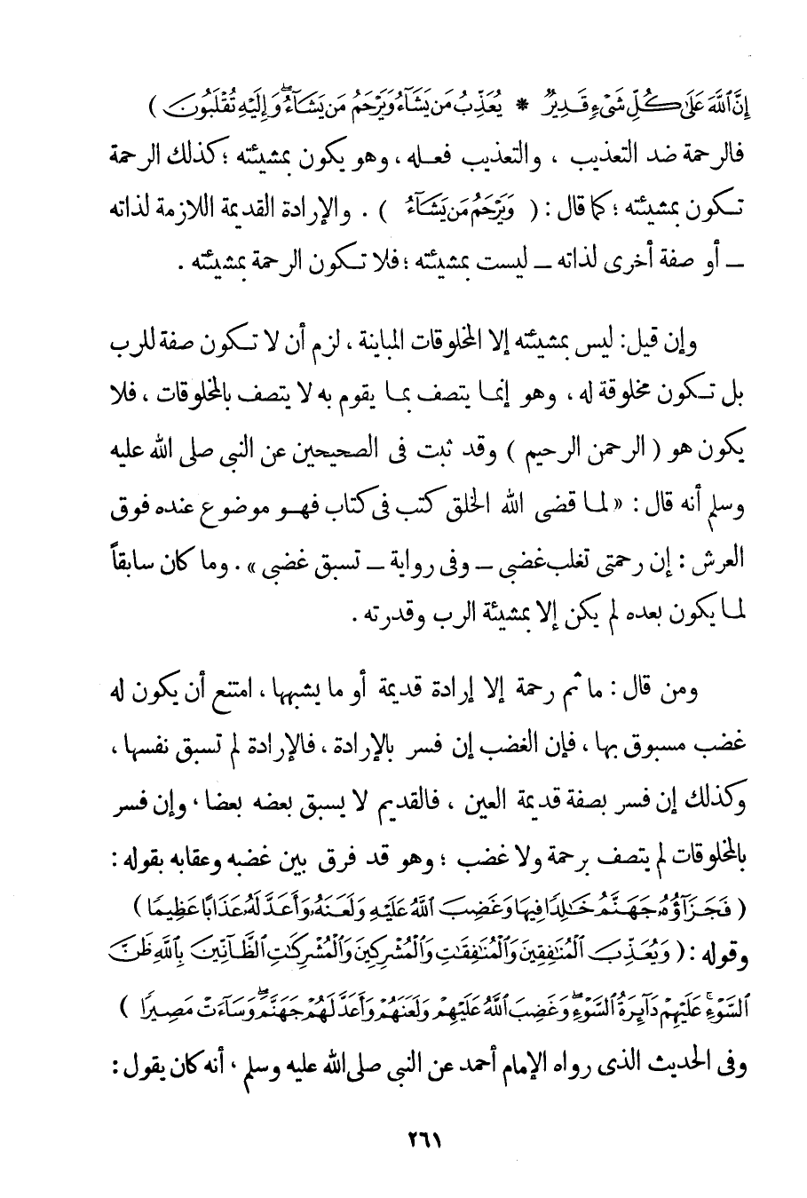 إنَّ اللَّهَ عَلَى كُلِّ شَيْءٍ قَدِيرٌ} {يُعَذِّبُ مَنْ يَشَاءُ وَيَرْحَمُ مَنْ يَشَاءُ وَإِلَيْهِ تُقْلَبُونَ} فَالرَّحْمَةُ ضِدُّ التَّعْذِيبِ وَالتَّعْذِيبُ فِعْلُهُ وَهُوَ يَكُونُ بِمَشِيئَتِهِ؛ كَذَلِكَ الرَّحْمَةُ تَكُونُ بِمَشِيئَتِهِ؛ كَمَا قَالَ: {وَيَرْحَمُ مَنْ يَشَاءُ} . وَالْإِرَادَةُ الْقَدِيمَةُ اللَّازِمَةُ لِذَاتِهِ - أَوْ صِفَةٌ أُخْرَى لِذَاتِهِ - لَيْسَتْ بِمَشِيئَتِهِ؛ فَلَا تَكُونُ الرَّحْمَةُ بِمَشِيئَتِهِ. وَإِنْ قِيلَ: لَيْسَ بِمَشِيئَتِهِ إلَّا الْمَخْلُوقَاتُ الْمُبَايِنَةُ لَزِمَ أَنْ لَا تَكُونَ صِفَةً لِلرَّبِّ بَلْ تَكُونُ مَخْلُوقَةً لَهُ وَهُوَ إنَّمَا يَتَّصِفُ بِمَا يَقُومُ بِهِ لَا يَتَّصِفُ بِالْمَخْلُوقَاتِ فَلَا يَكُونُ هُوَ الرَّحْمَنُ الرَّحِيمُ وَقَدْ ثَبَتَ فِي الصَّحِيحَيْنِ عَنْ النَّبِيِّ صَلَّى اللَّهُ عَلَيْهِ وَسَلَّمَ أَنَّهُ قَالَ: " {لَمَّا قَضَى اللَّهُ الْخَلْقَ كَتَبَ فِي كِتَابٍ فَهُوَ مَوْضُوعٌ عِنْدَهُ فَوْقَ الْعَرْشِ: إنَّ رَحْمَتِي تَغْلِبُ غَضَبِي} - وَفِي رِوَايَةٍ - تَسْبِقُ غَضَبِي ". وَمَا كَانَ سَابِقًا لِمَا يَكُونُ بَعْدَهُ لَمْ يَكُنْ إلَّا بِمَشِيئَةِ الرَّبِّ وَقُدْرَتِهِ. وَمَنْ قَالَ: مَا ثَمَّ رَحْمَةٌ إلَّا إرَادَةٌ قَدِيمَةٌ أَوْ مَا يُشْبِهُهَا امْتَنَعَ أَنْ يَكُونَ لَهُ غَضَبٌ مَسْبُوقٌ بِهَا فَإِنَّ الْغَضَبَ إنْ فُسِّرَ بِالْإِرَادَةِ فَالْإِرَادَةُ لَمْ تَسْبِقْ نَفْسَهَا وَكَذَلِكَ إنْ فُسِّرَ بِصِفَةِ قَدِيمَةِ الْعَيْنِ فَالْقَدِيمُ لَا يَسْبِقُ بَعْضُهُ بَعْضًا وَإِنْ فُسِّرَ بِالْمَخْلُوقَاتِ لَمْ يَتَّصِفْ بِرَحْمَةِ وَلَا غَضَبٍ؛ وَهُوَ قَدْ فَرَّقَ بَيْنَ غَضَبِهِ وَعِقَابِهِ بِقَوْلِهِ: {فَجَزَاؤُهُ جَهَنَّمُ خَالِدًا فِيهَا وَغَضِبَ اللَّهُ عَلَيْهِ وَلَعَنَهُ وَأَعَدَّ لَهُ عَذَابًا عَظِيمًا} وَقَوْلُهُ: {وَيُعَذِّبَ الْمُنَافِقِينَ وَالْمُنَافِقَاتِ وَالْمُشْرِكِينَ وَالْمُشْرِكَاتِ الظَّانِّينَ بِاللَّهِ ظَنَّ السَّوْءِ عَلَيْهِمْ دَائِرَةُ السَّوْءِ وَغَضِبَ اللَّهُ عَلَيْهِمْ وَلَعَنَهُمْ وَأَعَدَّ لَهُمْ جَهَنَّمَ وَسَاءَتْ مَصِيرًا} وَفِي الْحَدِيثِ الَّذِي رَوَاهُ الْإِمَامُ أَحْمَد عَنْ النَّبِيِّ صَلَّى اللَّهُ عَلَيْهِ وَسَلَّمَ أَنَّهُ كَانَ يَقُولُ: