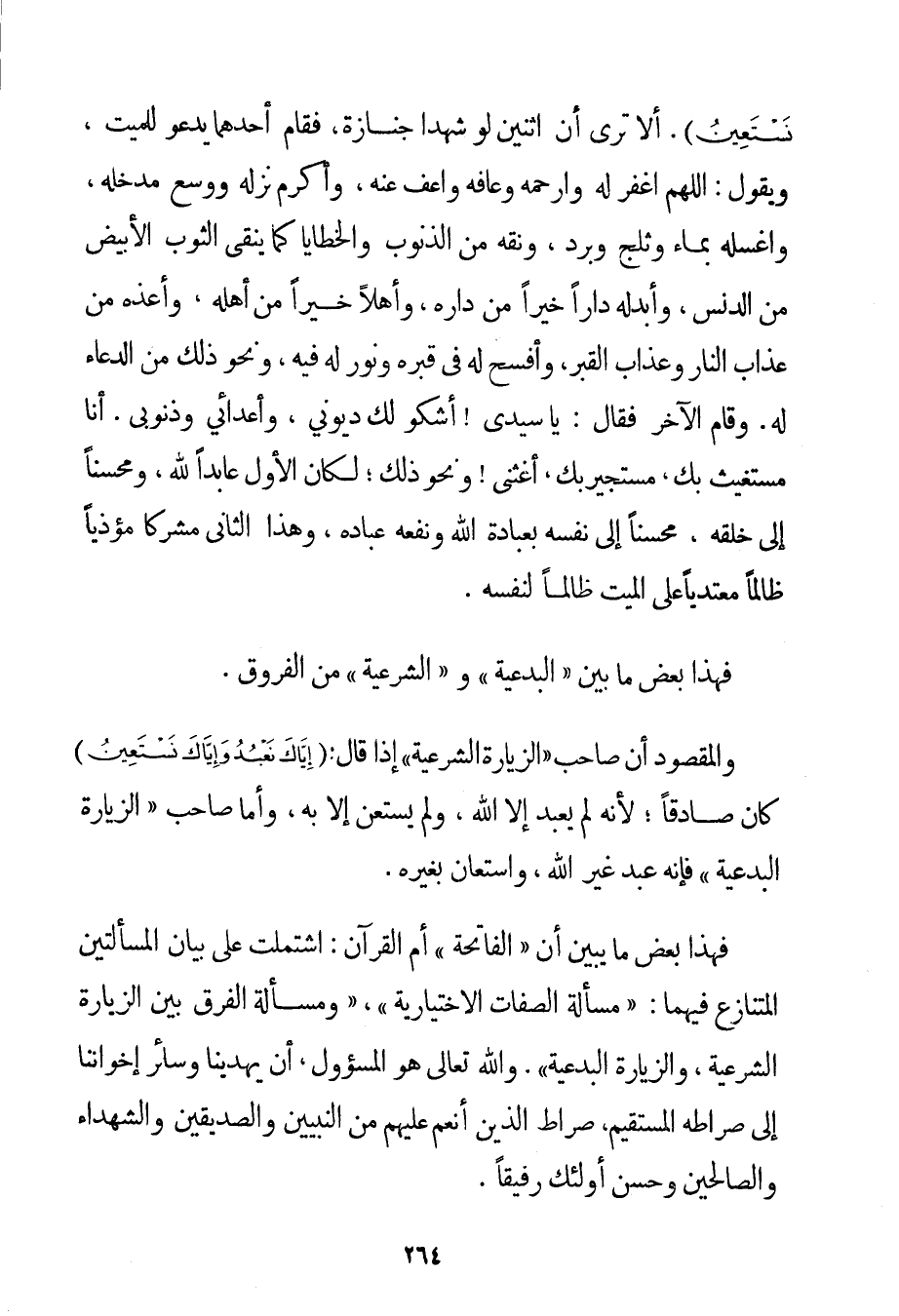 نَسْتَعِينُ} . أَلَا تَرَى أَنَّ اثْنَيْنِ لَوْ شَهِدَا جِنَازَةً فَقَامَ أَحَدُهُمَا يَدْعُو لِلْمَيِّتِ وَيَقُولُ: اللَّهُمَّ اغْفِرْ لَهُ وَارْحَمْهُ وَعَافِهِ وَاعْفُ عَنْهُ وَأَكْرِمْ نُزُلَهُ وَوَسِّعْ مُدْخَلَهُ وَاغْسِلْهُ بِمَاءِ وَثَلْجٍ وَبَرَدٍ وَنَقِّهِ مِنْ الذُّنُوبِ وَالْخَطَايَا كَمَا يُنَقَّى الثَّوْبُ الْأَبْيَضُ مِنْ الدَّنَسِ وَأَبْدِلْهُ دَارًا خَيْرًا مِنْ دَارِهِ وَأَهْلًا خَيْرًا مِنْ أَهْلِهِ وَأَعِذْهُ مِنْ عَذَابِ النَّارِ وَعَذَابِ الْقَبْرِ وَأَفْسِحْ لَهُ فِي قَبْرِهِ وَنَوِّرْ لَهُ فِيهِ وَنَحْوُ ذَلِكَ مِنْ الدُّعَاءِ لَهُ. وَقَامَ الْآخَرُ فَقَالَ: يَا سَيِّدِي أَشْكُو لَك دُيُونِي وَأَعْدَائِي وَذُنُوبِي. أَنَا مُسْتَغِيثٌ بِك مُسْتَجِيرٌ بِك أَغِثْنِي وَنَحْوُ ذَلِكَ؛ لَكَانَ الْأَوَّلُ عَابِدًا لِلَّهِ وَمُحْسِنًا إلَى خَلْقِهِ مُحْسِنًا إلَى نَفْسِهِ بِعِبَادَةِ اللَّهِ وَنَفْعِهِ عِبَادَهُ وَهَذَا الثَّانِي مُشْرِكًا مُؤْذِيًا ظَالِمًا مُعْتَدِيًا عَلَى الْمَيِّتِ ظَالِمًا لِنَفْسِهِ. فَهَذَا بَعْضُ مَا بَيْنَ " الْبِدْعِيَّةِ " وَ " الشَّرْعِيَّةِ " مِنْ الْفُرُوقِ. وَالْمَقْصُودُ أَنَّ صَاحِبَ " الزِّيَارَةِ الشَّرْعِيَّةِ " إذَا قَالَ: {إيَّاكَ نَعْبُدُ وَإِيَّاكَ نَسْتَعِينُ} كَانَ صَادِقًا؛ لِأَنَّهُ لَمْ يَعْبُدْ إلَّا اللَّهَ وَلَمْ يَسْتَعِنْ إلَّا بِهِ وَأَمَّا صَاحِبُ " الزِّيَارَةِ الْبِدْعِيَّةِ " فَإِنَّهُ عَبَدَ غَيْرَ اللَّهِ وَاسْتَعَانَ بِغَيْرِهِ. فَهَذَا بَعْضُ مَا يُبَيِّنُ أَنَّ " الْفَاتِحَةَ " أُمُّ الْقُرْآنِ: اشْتَمَلَتْ عَلَى بَيَانِ الْمَسْأَلَتَيْنِ الْمُتَنَازَعِ فِيهِمَا: " مَسْأَلَةِ الصِّفَاتِ الِاخْتِيَارِيَّةِ " " وَمَسْأَلَةِ الْفَرْقِ بَيْنَ الزِّيَارَةِ الشَّرْعِيَّةِ وَالزِّيَارَةِ الْبِدْعِيَّةِ ". وَاَللَّهُ تَعَالَى هُوَ الْمَسْئُولُ أَنْ يَهْدِيَنَا وَسَائِرَ إخْوَانِنَا إلَى صِرَاطِهِ الْمُسْتَقِيمِ صِرَاطِ الَّذِينَ أَنْعَمَ عَلَيْهِمْ مِنْ النَّبِيِّينَ وَالصِّدِّيقِينَ وَالشُّهَدَاءِ وَالصَّالِحِينَ وَحَسُنَ أُولَئِكَ رَفِيقًا.