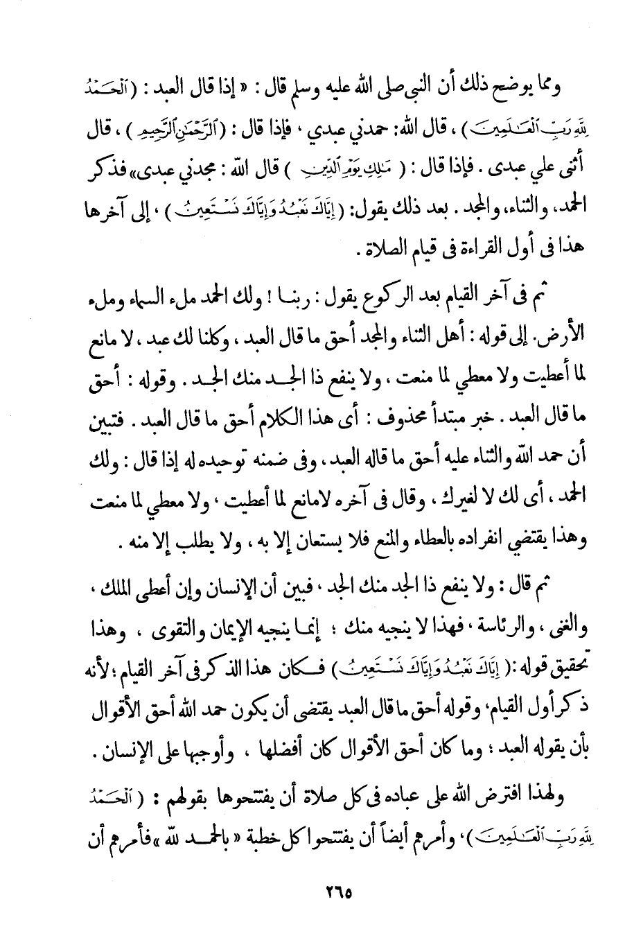 وَمِمَّا يُوَضِّحُ ذَلِكَ أَنَّ النَّبِيَّ صَلَّى اللَّهُ عَلَيْهِ وَسَلَّمَ قَالَ: {إذَا قَالَ الْعَبْدُ: {الْحَمْدُ لِلَّهِ رَبِّ الْعَالَمِينَ} قَالَ اللَّهُ: حَمِدَنِي عَبْدِي فَإِذَا قَالَ: {الرَّحْمَنِ الرَّحِيمِ} قَالَ أَثْنَى عَلَيَّ عَبْدِي. فَإِذَا قَالَ: {مَالِكِ يَوْمِ الدِّينِ} قَالَ اللَّهُ: مَجَّدَنِي عَبْدِي فَذَكَرَ الْحَمْدَ وَالثَّنَاءَ وَالْمَجْدَ. بَعْدَ ذَلِكَ يَقُولُ: {إيَّاكَ نَعْبُدُ وَإِيَّاكَ نَسْتَعِينُ} إلَى آخِرِهَا هَذَا فِي أَوَّلِ الْقِرَاءَةِ فِي قِيَامِ الصَّلَاةِ. ثُمَّ فِي آخِرِ الْقِيَامِ بَعْدَ الرُّكُوعِ يَقُولُ: رَبَّنَا وَلَك الْحَمْدُ مِلْءَ السَّمَاءِ وَمِلْءَ الْأَرْضِ. إلَى قَوْلِهِ: أَهْلَ الثَّنَاءِ وَالْمَجْدِ أَحَقُّ مَا قَالَ الْعَبْدُ وَكُلُّنَا لَك عَبْدٌ لَا مَانِعَ لِمَا أَعْطَيْت وَلَا مُعْطِيَ لِمَا مَنَعْت وَلَا يَنْفَعُ ذَا الْجَدِّ مِنْك الْجَدُّ} . وَقَوْلُهُ: أَحَقُّ مَا قَالَ الْعَبْدُ. خَبَرُ مُبْتَدَأٍ مَحْذُوفٍ: أَيْ هَذَا الْكَلَامُ أَحَقُّ مَا قَالَ الْعَبْدُ. فَتَبَيَّنَ أَنَّ حَمْدَ اللَّهِ وَالثَّنَاءَ عَلَيْهِ أَحَقُّ مَا قَالَهُ الْعَبْدُ وَفِي ضِمْنِهِ تَوْحِيدُهُ لَهُ إذَا قَالَ: وَلَك الْحَمْدُ أَيْ لَك لَا لِغَيْرِك وَقَالَ فِي آخِرِهِ لَا مَانِعَ لِمَا أَعْطَيْت وَلَا مُعْطِيَ لِمَا مَنَعْت وَهَذَا يَقْتَضِي انْفِرَادَهُ بِالْعَطَاءِ وَالْمَنْعِ فَلَا يُسْتَعَانُ إلَّا بِهِ وَلَا يُطْلَبُ إلَّا مِنْهُ. ثُمَّ قَالَ: وَلَا يَنْفَعُ ذَا الْجَدِّ مِنْك الْجَدُّ فَبَيَّنَ أَنَّ الْإِنْسَانَ وَإِنْ أُعْطِيَ الْمُلْكَ وَالْغِنَى وَالرِّئَاسَةَ فَهَذَا لَا يُنْجِيهِ مِنْك؛ إنَّمَا يُنْجِيهِ الْإِيمَانُ وَالتَّقْوَى وَهَذَا تَحْقِيقُ قَوْلِهِ: {إيَّاكَ نَعْبُدُ وَإِيَّاكَ نَسْتَعِينُ} فَكَانَ هَذَا الذِّكْرُ فِي آخِرِ الْقِيَامِ؛ لِأَنَّهُ ذَكَرَ أَوَّلَ الْقِيَامِ وَقَوْلُهُ أَحَقُّ مَا قَالَ الْعَبْدُ يَقْتَضِي أَنْ يَكُونَ حَمْدُ اللَّهِ أَحَقَّ الْأَقْوَالِ بِأَنْ يَقُولَهُ الْعَبْدُ؛ وَمَا كَانَ أَحَقَّ الْأَقْوَالِ كَانَ أَفْضَلَهَا وَأَوْجَبَهَا عَلَى الْإِنْسَانِ. وَلِهَذَا افْتَرَضَ اللَّهُ عَلَى عِبَادِهِ فِي كُلِّ صَلَاةٍ أَنْ يَفْتَتِحُوهَا بِقَوْلِهِمْ: {الْحَمْدُ لِلَّهِ رَبِّ الْعَالَمِينَ} وَأَمَرَهُمْ أَيْضًا أَنْ يَفْتَتِحُوا كُلَّ خُطْبَةٍ " بالحمد لِلَّهِ " فَأَمَرَهُمْ أَنْ