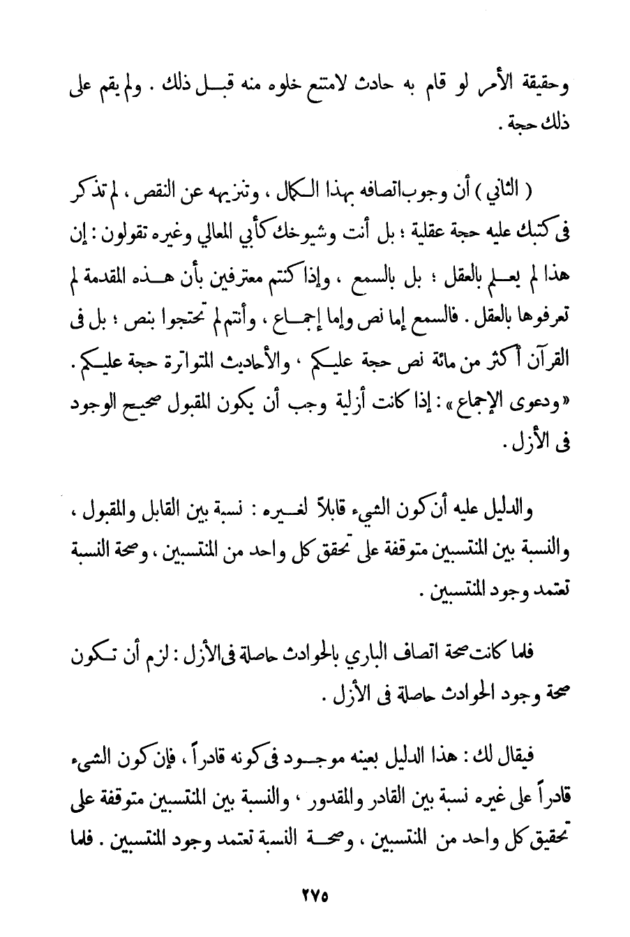وَحَقِيقَةُ الْأَمْرِ لَوْ قَامَ بِهِ حَادِثٌ لَامْتَنَعَ خُلُوُّهُ مِنْهُ قَبْلَ ذَلِكَ. وَلَمْ يَقُمْ عَلَى ذَلِكَ حُجَّةٌ. (الثَّانِي أَنَّ وُجُوبَ اتِّصَافِهِ بِهَذَا الْكَمَالِ وَتَنْزِيهُهُ عَنْ النَّقْصِ لَمْ تَذْكُرْ فِي كُتُبِك عَلَيْهِ حُجَّةً عَقْلِيَّةً؛ بَلْ أَنْتَ وَشُيُوخُك كَأَبِي الْمَعَالِي وَغَيْرِهِ تَقُولُونَ: إنَّ هَذَا لَمْ يُعْلَمْ بِالْعَقْلِ؛ بَلْ بِالسَّمْعِ وَإِذَا كُنْتُمْ مُعْتَرِفِينَ بِأَنَّ هَذِهِ الْمُقَدِّمَةَ لَمْ تَعْرِفُوهَا بِالْعَقْلِ. فَالسَّمْعُ إمَّا نَصٌّ وَإِمَّا إجْمَاعٌ وَأَنْتُمْ لَمْ تَحْتَجُّوا بِنَصِّ؛ بَلْ فِي الْقُرْآنِ أَكْثَرُ مِنْ مِائَةِ نَصٍّ حُجَّةً عَلَيْكُمْ وَالْأَحَادِيثُ الْمُتَوَاتِرَةُ حُجَّةٌ عَلَيْكُمْ. " وَدَعْوَى الْإِجْمَاعِ ": إذَا كَانَتْ أَزَلِيَّةً وَجَبَ أَنْ يَكُونَ الْمَقْبُولُ صَحِيحَ الْوُجُودِ فِي الْأَزَلِ. وَالدَّلِيلُ عَلَيْهِ أَنَّ كَوْنَ الشَّيْءِ قَابِلًا لِغَيْرِهِ: نِسْبَةً بَيْنَ الْقَابِلِ وَالْمَقْبُولِ وَالنِّسْبَةُ بَيْنَ الْمُنْتَسِبِينَ مُتَوَقِّفَةٌ عَلَى تَحَقُّقِ كُلِّ وَاحِدٍ مِنْ الْمُنْتَسِبِينَ وَصِحَّةُ النِّسْبَةِ تَعْتَمِدُ وُجُودَ الْمُنْتَسِبِينَ. فَلَمَّا كَانَتْ صِحَّةُ اتِّصَافِ الْبَارِي بِالْحَوَادِثِ حَاصِلَةً فِي الْأَزَلِ: لَزِمَ أَنْ تَكُونَ صِحَّةُ وُجُودِ الْحَوَادِثِ حَاصِلَةً فِي الْأَزَلِ. فَيُقَالُ لَك: هَذَا الدَّلِيلُ بِعَيْنِهِ مَوْجُودٌ فِي كَوْنِهِ قَادِرًا فَإِنَّ كَوْنَ الشَّيْءِ قَادِرًا عَلَى غَيْرِهِ نِسْبَةً بَيْنَ الْقَادِرِ وَالْمَقْدُورِ وَالنِّسْبَةُ بَيْنَ الْمُنْتَسِبِينَ مُتَوَقِّفَةٌ عَلَى تَحْقِيقِ كُلِّ وَاحِدٍ مِنْ الْمُنْتَسِبِينَ وَصِحَّةُ النِّسْبَةِ تَعْتَمِدُ وُجُودَ الْمُنْتَسِبِينَ. فَلَمَّا