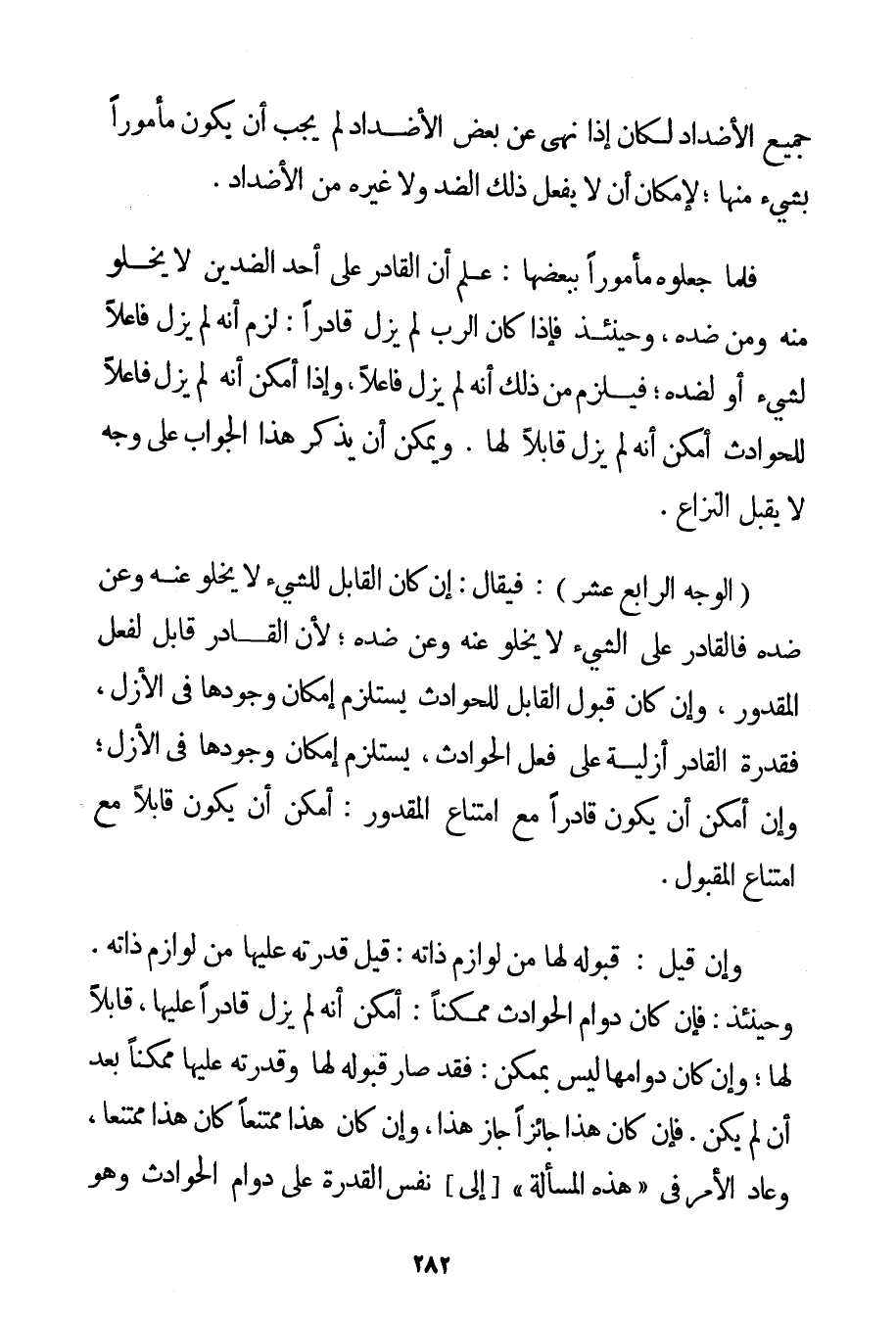 جَمِيعِ الْأَضْدَادِ لَكَانَ إذَا نَهَى عَنْ بَعْضِ الْأَضْدَادِ لَمْ يَجِبْ أَنْ يَكُونَ مَأْمُورًا بِشَيْءِ مِنْهَا؛ لِإِمْكَانِ أَنْ لَا يَفْعَلَ ذَلِكَ الضِّدَّ وَلَا غَيْرَهُ مِنْ الْأَضْدَادِ. فَلَمَّا جَعَلُوهُ مَأْمُورًا بِبَعْضِهَا: عُلِمَ أَنَّ الْقَادِرَ عَلَى أَحَدِ الضِّدَّيْنِ لَا يَخْلُو مِنْهُ وَمِنْ ضِدِّهِ وَحِينَئِذٍ فَإِذَا كَانَ الرَّبُّ لَمْ يَزَلْ قَادِرًا: لَزِمَ أَنَّهُ لَمْ يَزَلْ فَاعِلًا لِشَيْءِ أَوْ لِضِدِّهِ؛ فَيَلْزَمُ مِنْ ذَلِكَ أَنَّهُ لَمْ يَزَلْ فَاعِلًا وَإِذَا أَمْكَنَ أَنَّهُ لَمْ يَزَلْ فَاعِلًا لِلْحَوَادِثِ أَمْكَنَ أَنَّهُ لَمْ يَزَلْ قَابِلًا لَهَا. وَيُمْكِنُ أَنْ يُذْكَرَ هَذَا الْجَوَابُ عَلَى وَجْهٍ لَا يَقْبَلُ النِّزَاعَ. (الْوَجْهُ الرَّابِعَ عَشَرَ: فَيُقَالُ: إنْ كَانَ الْقَابِلُ لِلشَّيْءِ لَا يَخْلُو عَنْهُ وَعَنْ ضِدِّهِ فَالْقَادِرُ عَلَى الشَّيْءِ لَا يَخْلُو عَنْهُ وَعَنْ ضِدِّهِ؛ لِأَنَّ الْقَادِرَ قَابِلٌ لِفِعْلِ الْمَقْدُورِ وَإِنْ كَانَ قَبُولُ الْقَابِلِ لِلْحَوَادِثِ يَسْتَلْزِمُ إمْكَانَ وُجُودِهَا فِي الْأَزَلِ فَقُدْرَةُ الْقَادِرِ أَزَلِيَّةٌ عَلَى فِعْلِ الْحَوَادِثِ يَسْتَلْزِمُ إمْكَانَ وُجُودِهَا فِي الْأَزَلِ؛ وَإِنْ أَمْكَنَ أَنْ يَكُونَ قَادِرًا مَعَ امْتِنَاعِ الْمَقْدُورِ: أَمْكَنَ أَنْ يَكُونَ قَابِلًا مَعَ امْتِنَاعِ الْمَقْبُولِ. وَإِنْ قِيلَ: قَبُولُهُ لَهَا مِنْ لَوَازِمِ ذَاتِهِ: قِيلَ قُدْرَتُهُ عَلَيْهَا مِنْ لَوَازِمِ ذَاتِهِ. وَحِينَئِذٍ: فَإِنْ كَانَ دَوَامُ الْحَوَادِثِ مُمْكِنًا: أَمْكَنَ أَنَّهُ لَمْ يَزَلْ قَادِرًا عَلَيْهَا قَابِلًا لَهَا؛ وَإِنْ كَانَ دَوَامُهَا لَيْسَ بِمُمْكِنِ: فَقَدْ صَارَ قَبُولُهُ لَهَا وَقُدْرَتُهُ عَلَيْهَا مُمْكِنًا بَعْدَ أَنْ لَمْ يَكُنْ. فَإِنْ كَانَ هَذَا جَائِزًا جَازَ هَذَا وَإِنْ كَانَ هَذَا مُمْتَنِعًا كَانَ هَذَا مُمْتَنِعًا وَعَادَ الْأَمْرُ فِي " هَذِهِ الْمَسْأَلَةِ " إلَى نَفْسِ الْقُدْرَةِ عَلَى دَوَامِ الْحَوَادِثِ وَهُوَ "