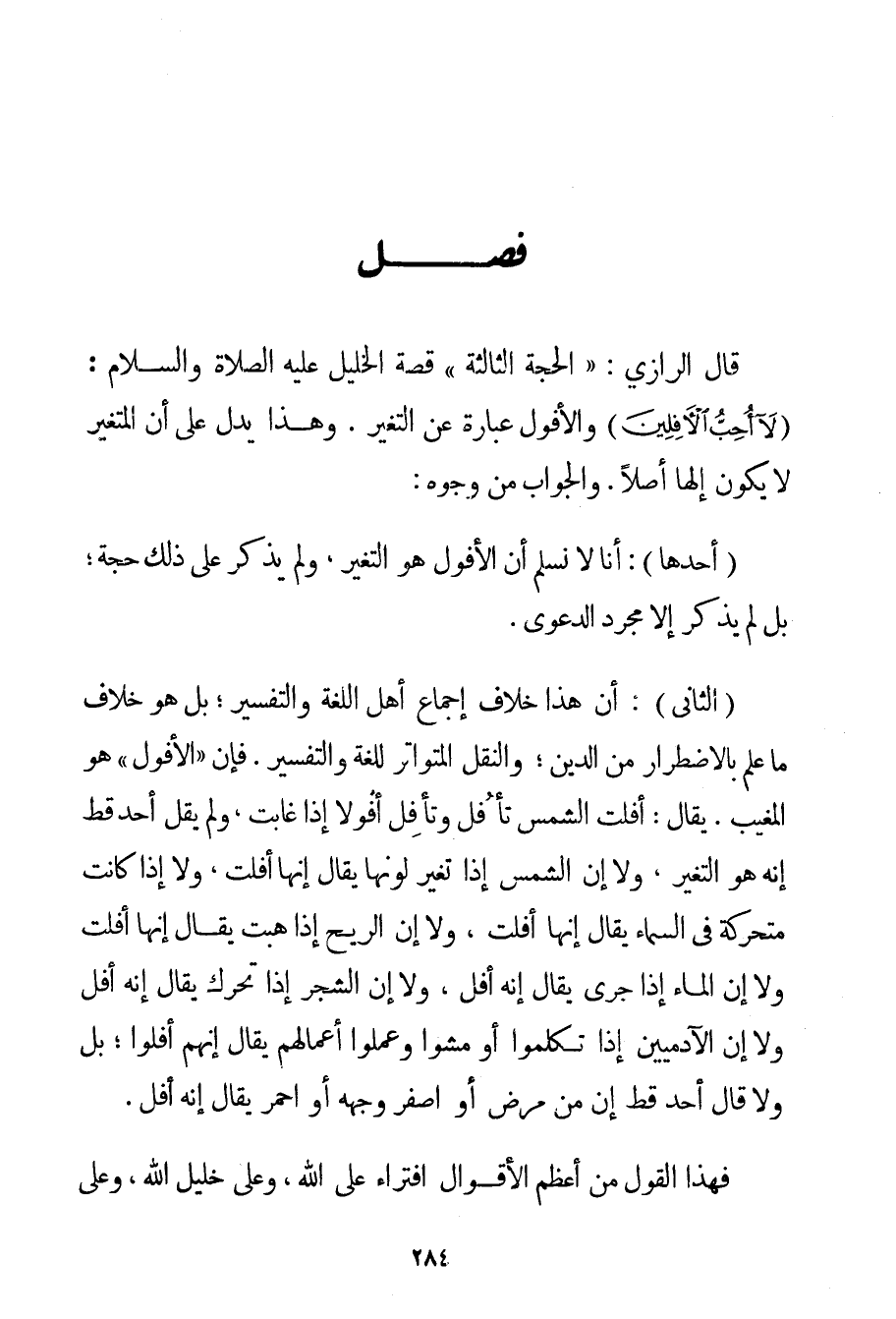 قَالَ الرَّازِي: " الْحُجَّةُ الثَّالِثَةُ " قِصَّةُ الْخَلِيلِ: {لَا أُحِبُّ الْآفِلِينَ} وَالْأُفُولُ عِبَارَةٌ عَنْ التَّغَيُّرِ. وَهَذَا يَدُلُّ عَلَى أَنَّ الْمُتَغَيِّرَ لَا يَكُونُ إلَهًا أَصْلًا. وَالْجَوَابُ مِنْ وُجُوهٍ: