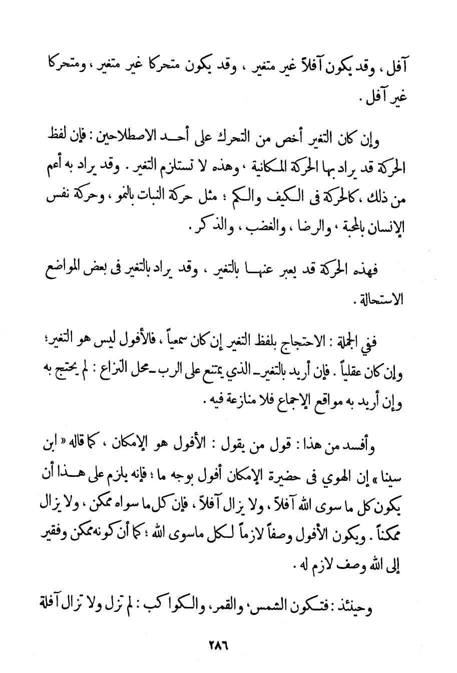 آفِلٍ وَقَدْ يَكُونُ آفِلًا غَيْرَ مُتَغَيِّرٍ وَقَدْ يَكُونُ مُتَحَرِّكًا غَيْرَ مُتَغَيِّرٍ وَمُتَحَرِّكًا غَيْرَ آفِلٍ. وَإِنْ كَانَ التَّغَيُّرُ أَخَصَّ مِنْ التَّحَرُّكِ عَلَى أَحَدِ الِاصْطِلَاحَيْنِ: فَإِنَّ لَفْظَ الْحَرَكَةِ قَدْ يُرَادُ بِهَا الْحَرَكَةُ الْمَكَانِيَّةُ وَهَذِهِ لَا تَسْتَلْزِمُ التَّغَيُّرَ. وَقَدْ يُرَادُ بِهِ أَعَمُّ مِنْ ذَلِكَ كَالْحَرَكَةِ فِي الْكَيْفِ وَالْكَمِّ؛ مِثْلُ حَرَكَةِ النَّبَاتِ بِالنُّمُوِّ وَحَرَكَةِ نَفْسِ الْإِنْسَانِ بِالْمَحَبَّةِ وَالرِّضَا وَالْغَضَبِ وَالذِّكْرِ. فَهَذِهِ الْحَرَكَةُ قَدْ يُعَبَّرُ عَنْهَا بِالتَّغَيُّرِ وَقَدْ يُرَادُ بِالتَّغَيُّرِ فِي بَعْضِ الْمَوَاضِعِ الِاسْتِحَالَةُ. فَفِي الْجُمْلَةِ: الِاحْتِجَاجُ بِلَفْظِ التَّغَيُّرِ إنْ كَانَ سَمْعِيًّا فَالْأُفُولُ لَيْسَ هُوَ التَّغَيُّرَ؛ وَإِنْ كَانَ عَقْلِيًّا. فَإِنْ أُرِيدَ بِالتَّغَيُّرِ - الَّذِي يَمْتَنِعُ عَلَى الرَّبِّ - مَحَلُّ النِّزَاعِ: لَمْ يُحْتَجَّ بِهِ وَإِنْ أُرِيدَ بِهِ مَوَاقِعُ الْإِجْمَاعِ فَلَا مُنَازَعَةَ فِيهِ. وَأَفْسَدُ مِنْ هَذَا: قَوْلُ مَنْ يَقُولُ: الْأُفُولُ هُوَ الْإِمْكَانُ كَمَا قَالَهُ " ابْنُ سِينَا " إنَّ الْهُوِيَّ فِي حَضِيرَةِ الْإِمْكَانِ أُفُولٌ بِوَجْهِ مَا؛ فَإِنَّهُ يَلْزَمُ عَلَى هَذَا أَنْ يَكُونَ كُلُّ مَا سِوَى اللَّهِ آفِلًا وَلَا يَزَالُ آفِلًا فَإِنَّ كُلَّ مَا سِوَاهُ مُمْكِنٌ وَلَا يَزَالُ مُمْكِنًا. وَيَكُونُ الْأُفُولُ وَصْفًا لَازِمًا لِكُلِّ مَا سِوَى اللَّهِ؛ كَمَا أَنَّ كَوْنَهُ مُمْكِنًا وَفَقِيرًا إلَى اللَّهِ وَصْفٌ لَازِمٌ لَهُ. وَحِينَئِذٍ: فَتَكُونُ الشَّمْسُ وَالْقَمَرُ وَالْكَوَاكِبُ: لَمْ تَزَلْ وَلَا تَزَالُ آفِلَةً