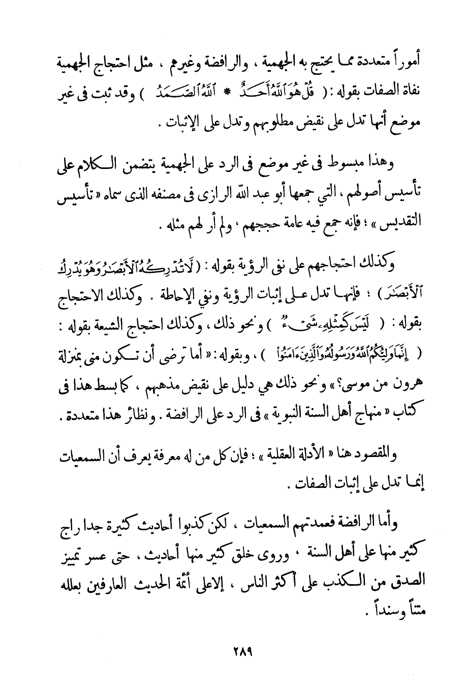 أُمُورًا مُتَعَدِّدَةً مِمَّا يَحْتَجُّ بِهِ الْجَهْمِيَّة وَالرَّافِضَةُ وَغَيْرُهُمْ مِثْلُ احْتِجَاجِ الْجَهْمِيَّة نفاة الصِّفَاتِ بِقَوْلِهِ: {قُلْ هُوَ اللَّهُ أَحَدٌ} {اللَّهُ الصَّمَدُ} وَقَدْ ثَبَتَ فِي غَيْرِ مَوْضِعٍ أَنَّهَا تَدُلُّ عَلَى نَقِيضِ مَطْلُوبِهِمْ وَتَدُلُّ عَلَى الْإِثْبَاتِ. وَهَذَا مَبْسُوطٌ فِي غَيْرِ مَوْضِعٍ فِي الرَّدِّ عَلَى الْجَهْمِيَّة يَتَضَمَّنُ الْكَلَامَ عَلَى تَأْسِيسِ أُصُولِهِمْ الَّتِي جَمَعَهَا أَبُو عَبْدِ اللَّهِ الرَّازِي فِي مُصَنَّفِهِ الَّذِي سَمَّاهُ " تَأْسِيسَ التَّقْدِيسِ "؛ فَإِنَّهُ جَمَعَ فِيهِ عَامَّةَ حُجَجِهِمْ وَلَمْ أَرَ لَهُمْ مِثْلَهُ. وَكَذَلِكَ احْتِجَاجَهُمْ عَلَى نَفْيِ الرُّؤْيَةِ بِقَوْلِهِ: {لَا تُدْرِكُهُ الْأَبْصَارُ وَهُوَ يُدْرِكُ الْأَبْصَارَ} فَإِنَّهَا تَدُلُّ عَلَى إثْبَاتِ الرُّؤْيَةِ وَنَفْيِ الْإِحَاطَةِ. وَكَذَلِكَ الِاحْتِجَاجُ بِقَوْلِهِ: {لَيْسَ كَمِثْلِهِ شَيْءٌ} وَنَحْوِ ذَلِكَ وَكَذَلِكَ احْتِجَاجُ الشِّيعَةِ بِقَوْلِهِ: {إنَّمَا وَلِيُّكُمُ اللَّهُ وَرَسُولُهُ وَالَّذِينَ آمَنُوا} وَبِقَوْلِهِ: " {أَمَا تَرْضَى أَنْ تَكُونَ مِنِّي بِمَنْزِلَةِ هَارُونَ مِنْ مُوسَى؟} " وَنَحْوِ ذَلِكَ هِيَ دَلِيلٌ عَلَى نَقِيضِ مَذْهَبِهِمْ كَمَا بُسِطَ هَذَا فِي كِتَابِ " مِنْهَاجِ أَهْلِ السُّنَّةِ النَّبَوِيَّةِ " فِي الرَّدِّ عَلَى الرَّافِضَةِ. وَنَظَائِرُ هَذَا مُتَعَدِّدَةٌ. وَالْمَقْصُودُ هُنَا " الْأَدِلَّةُ الْعَقْلِيَّةُ "؛ فَإِنَّ كُلَّ مَنْ لَهُ مَعْرِفَةٌ يَعْرِفُ أَنَّ السَّمْعِيَّاتِ إنَّمَا تَدُلُّ عَلَى إثْبَاتِ الصِّفَاتِ. وَأَمَّا الرَّافِضَةُ فَعُمْدَتُهُمْ السَّمْعِيَّاتُ لَكِنْ كَذَّبُوا أَحَادِيثَ كَثِيرَةً جِدًّا رَاجَ كَثِيرٌ مِنْهَا عَلَى أَهْلِ السُّنَّةِ " وَرَوَى خَلْقٌ كَثِيرٌ مِنْهَا أَحَادِيثَ حَتَّى عَسُرَ تَمْيِيزُ الصِّدْقِ مِنْ الْكَذِبِ عَلَى أَكْثَرِ النَّاسِ إلَّا عَلَى أَئِمَّةِ الْحَدِيثِ الْعَارِفِينَ بِعِلَلِهِ مَتْنًا وَسَنَدًا.