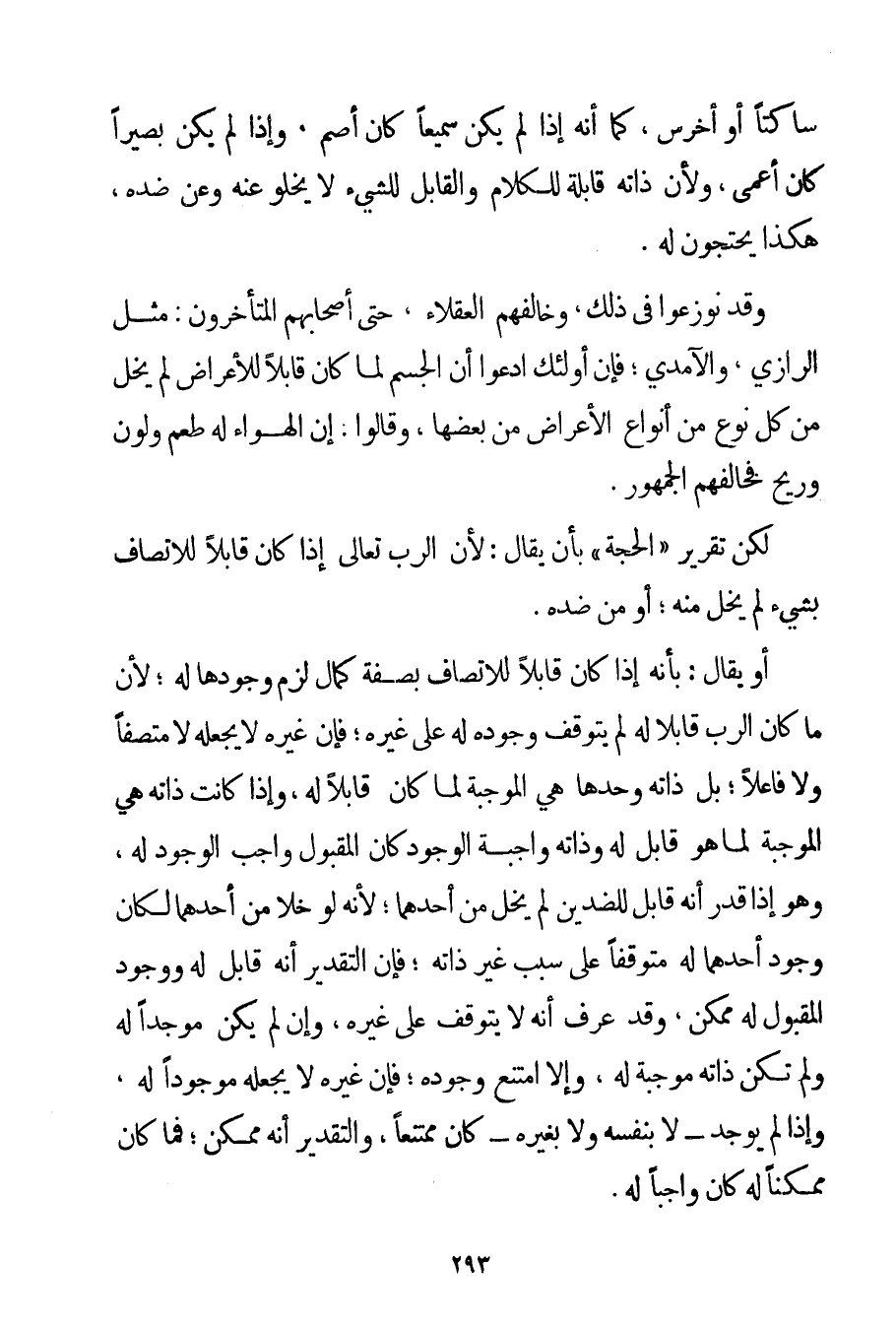 سَاكِتًا أَوْ أَخْرَسَ كَمَا أَنَّهُ إذَا لَمْ يَكُنْ سَمِيعًا كَانَ أَصَمَّ وَإِذَا لَمْ يَكُنْ بَصِيرًا كَانَ أَعْمَى وَلِأَنَّ ذَاتَه قَابِلَةٌ لِلْكَلَامِ وَالْقَابِلُ لِلشَّيْءِ لَا يَخْلُو عَنْهُ وَعَنْ ضِدِّهِ هَكَذَا يَحْتَجُّونَ لَهُ. وَقَدْ نُوزِعُوا فِي ذَلِكَ وَخَالَفَهُمْ الْعُقَلَاءُ حَتَّى أَصْحَابُهُمْ الْمُتَأَخِّرُونَ: مِثْلُ الرَّازِي والآمدي؛ فَإِنَّ أُولَئِكَ ادَّعَوْا أَنَّ الْجِسْمَ لَمَّا كَانَ قَابِلًا لِلْأَعْرَاضِ لَمْ يَخْلُ مِنْ كُلِّ نَوْعٍ مِنْ أَنْوَاعِ الْأَعْرَاضِ مِنْ بَعْضِهَا وَقَالُوا: إنَّ الْهَوَاءَ لَهُ طَعْمٌ وَلَوْنٌ وَرِيحٌ فَخَالَفَهُمْ الْجُمْهُورُ. لَكِنْ تَقْرِيرُ " الْحُجَّةِ " بِأَنْ يُقَالَ: لِأَنَّ الرَّبَّ تَعَالَى إذَا كَانَ قَابِلًا لِلِاتِّصَافِ بِشَيْءِ لَمْ يَخْلُ مِنْهُ؛ أَوْ مِنْ ضِدِّهِ. أَوْ يُقَالَ: بِأَنَّهُ إذَا كَانَ قَابِلًا لِلِاتِّصَافِ بِصِفَةِ كَمَالٍ لَزِمَ وُجُودُهَا لَهُ؛ لِأَنَّ مَا كَانَ الرَّبُّ قَابِلًا لَهُ لَمْ يَتَوَقَّفْ وُجُودُهُ لَهُ عَلَى غَيْرِهِ؛ فَإِنَّ غَيْرَهُ لَا يَجْعَلُهُ لَا مُتَّصِفًا وَلَا فَاعِلًا؛ بَلْ ذَاتُهُ وَحْدَهَا هِيَ الْمُوجِبَةُ لِمَا كَانَ قَابِلًا لَهُ وَإِذَا كَانَتْ ذَاتُهُ هِيَ الْمُوجِبَةُ لِمَا هُوَ قَابِلٌ لَهُ وَذَاتُهُ وَاجِبَةُ الْوُجُودِ كَانَ الْمَقْبُولُ وَاجِبَ الْوُجُودِ لَهُ وَهُوَ إذَا قَدَّرَ أَنَّهُ قَابِلٌ لِلضِّدَّيْنِ لَمْ يَخْلُ مِنْ أَحَدِهِمَا؛ لِأَنَّهُ لَوْ خَلَا مِنْ أَحَدِهِمَا لَكَانَ وُجُودُ أَحَدِهِمَا لَهُ مُتَوَقِّفًا عَلَى سَبَبٍ غَيْرِ ذَاتِهِ؛ فَإِنَّ التَّقْدِيرَ أَنَّهُ قَابِلٌ لَهُ وَوُجُودُ الْمَقْبُولِ لَهُ مُمْكِنٌ وَقَدْ عُرِفَ أَنَّهُ لَا يَتَوَقَّفُ عَلَى غَيْرِهِ وَإِنْ لَمْ يَكُنْ مُوجِدًا لَهُ وَلَمْ تَكُنْ ذَاتُهُ مُوجِبَةً لَهُ وَإِلَّا امْتَنَعَ وَجُودُهُ؛ فَإِنَّ غَيْرَهُ لَا يَجْعَلُهُ مَوْجُودًا لَهُ وَإِذَا لَمْ يُوجَدْ - لَا بِنَفْسِهِ وَلَا بِغَيْرِهِ - كَانَ مُمْتَنِعًا وَالتَّقْدِيرُ أَنَّهُ مُمْكِنٌ؛ فَمَا كَانَ مُمْكِنًا لَهُ كَانَ وَاجِبًا لَهُ.