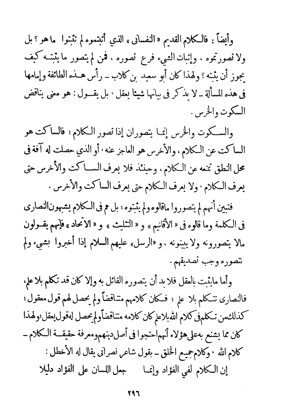 وَأَيْضًا: فَالْكَلَامُ الْقَدِيمُ " النَّفْسَانِيُّ " الَّذِي أَثْبَتُّمُوهُ لَمْ تُثْبِتُوا مَا هُوَ؟ بَلْ وَلَا تَصَوَّرْتُمُوهُ وَإِثْبَاتُ الشَّيْءِ فَرْعُ تَصَوُّرِهِ فَمَنْ لَمْ يَتَصَوَّرْ مَا يُثْبِتُهُ كَيْفَ يَجُوزُ أَنْ يُثْبِتَهُ؟ وَلِهَذَا كَانَ أَبُو سَعِيدِ بْنُ كُلَّابٍ - رَأْسُ هَذِهِ الطَّائِفَةِ وَإِمَامُهَا فِي هَذِهِ الْمَسْأَلَةِ - لَا يَذْكُرُ فِي بَيَانِهَا شَيْئًا يُعْقَلُ بَلْ يَقُولُ: هُوَ مَعْنًى يُنَاقِضُ السُّكُوتَ وَالْخَرَسَ. وَالسُّكُوتُ وَالْخَرَسُ إنَّمَا يُتَصَوَّرَانِ إذَا تُصَوِّرُ الْكَلَامُ؛ فَالسَّاكِتُ هُوَ السَّاكِتُ عَنْ الْكَلَامِ وَالْأَخْرَسُ هُوَ الْعَاجِزُ عَنْهُ أَوْ الَّذِي حَصَلَتْ لَهُ آفَةٌ فِي مَحَلِّ النُّطْقِ تَمْنَعُهُ عَنْ الْكَلَامِ وَحِينَئِذٍ فَلَا يَعْرِفُ السَّاكِتَ وَالْأَخْرَسَ حَتَّى يَعْرِفَ الْكَلَامَ وَلَا يَعْرِفُ الْكَلَامَ حَتَّى يَعْرِفَ السَّاكِتَ وَالْأَخْرَسَ. فَتَبَيَّنَ أَنَّهُمْ لَمْ يَتَصَوَّرُوا مَا قَالُوهُ وَلَمْ يُثْبِتُوهُ؛ بَلْ هُمْ فِي الْكَلَامِ يُشْبِهُونَ النَّصَارَى فِي الْكَلِمَةِ وَمَا قَالُوهُ فِي " الْأَقَانِيمِ " وَالتَّثْلِيثِ " وَالِاتِّحَادِ " فَإِنَّهُمْ يَقُولُونَ مَا لَا يَتَصَوَّرُونَهُ وَلَا يُبَيِّنُونَهُ وَ " الرُّسُلُ " عَلَيْهِمْ السَّلَامُ إذَا أَخْبَرُوا بِشَيْءِ وَلَمْ نَتَصَوَّرْهُ وَجَبَ تَصْدِيقُهُمْ. وَأَمَّا مَا يَثْبُتُ بِالْعَقْلِ فَلَا بُدَّ أَنْ يَتَصَوَّرَهُ الْقَائِلُ بِهِ وَإِلَّا كَانَ قَدْ تَكَلَّمَ بِلَا عِلْمٍ فَالنَّصَارَى تَتَكَلَّمُ بِلَا عِلْمٍ؛ فَكَانَ كَلَامُهُمْ مُتَنَاقِضًا وَلَمْ يَحْصُلْ لَهُمْ قَوْلٌ مَعْقُولٌ؛ كَذَلِكَ مَنْ تَكَلَّمَ فِي كَلَامِ اللَّهِ بِلَا عِلْمٍ كَانَ كَلَامُهُ مُتَنَاقِضًا وَلَمْ يَحْصُلْ لَهُ قَوْلٌ يُعْقَلُ؛ وَلِهَذَا كَانَ مِمَّا يُشَنَّعُ بِهِ عَلَى هَؤُلَاءِ أَنَّهُمْ احْتَجُّوا فِي أَصْلِ دِينِهِمْ وَمَعْرِفَةِ حَقِيقَةِ الْكَلَامِ - كَلَامِ اللَّهِ وَكَلَامِ جَمِيعِ الْخَلْقِ - بِقَوْلِ شَاعِرٍ نَصْرَانِيٍّ يُقَالُ لَهُ الْأَخْطَلُ:
