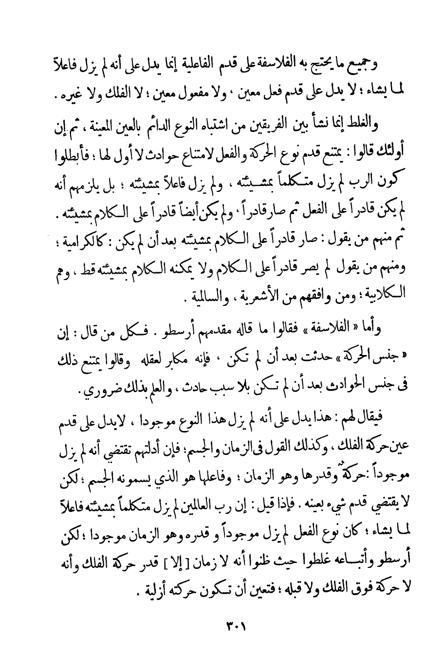 وَجَمِيعُ مَا يَحْتَجُّ بِهِ الْفَلَاسِفَةُ عَلَى قِدَمِ الْفَاعِلِيَّةُ إنَّمَا يَدُلُّ عَلَى أَنَّهُ لَمْ يَزَلْ فَاعِلًا لِمَا يَشَاءُ؛ لَا يَدُلُّ عَلَى قِدَمِ فِعْلٍ مُعَيَّنٍ وَلَا مَفْعُولٍ مُعَيَّنٍ؛ لَا الْفَلَكُ وَلَا غَيْرُهُ. وَالْغَلَطُ إنَّمَا نَشَأَ بَيْنَ الْفَرِيقَيْنِ مِنْ اشْتِبَاهِ النَّوْعِ الدَّائِمِ بِالْعَيْنِ الْمُعَيَّنَةِ ثُمَّ إنَّ أُولَئِكَ قَالُوا: يَمْتَنِعُ قِدَمُ نَوْعِ الْحَرَكَةِ وَالْفِعْلِ لِامْتِنَاعِ حَوَادِثَ لَا أَوَّلَ لَهَا؛ فَأَبْطَلُوا كَوْنَ الرَّبِّ لَمْ يَزَلْ مُتَكَلِّمًا بِمَشِيئَتِهِ وَلَمْ يَزَلْ فَاعِلًا بِمَشِيئَتِهِ؛ بَلْ يَلْزَمُهُمْ أَنَّهُ لَمْ يَكُنْ قَادِرًا عَلَى الْفِعْلِ ثُمَّ صَارَ قَادِرًا وَلَمْ يَكُنْ أَيْضًا قَادِرًا عَلَى الْكَلَامِ بِمَشِيئَتِهِ. ثُمَّ مِنْهُمْ مَنْ يَقُولُ: صَارَ قَادِرًا عَلَى الْكَلَامِ بِمَشِيئَتِهِ بَعْدَ أَنْ لَمْ يَكُنْ: كالكَرَّامِيَة؛ وَمِنْهُمْ مَنْ يَقُولُ لَمْ يَصِرْ قَادِرًا عَلَى الْكَلَامِ وَلَا يُمْكِنُهُ الْكَلَامُ بِمَشِيئَتِهِ قَطُّ وَهُمْ الْكُلَّابِيَة؛ وَمَنْ وَافَقَهُمْ مِنْ الْأَشْعَرِيَّةِ والسالمية. وَأَمَّا " الْفَلَاسِفَةُ " فَقَالُوا مَا قَالَهُ مُقَدِّمُهُمْ أَرِسْطُو. فَكُلُّ مَنْ قَالَ: إنَّ " جِنْسَ الْحَرَكَةِ " حَدَثَتْ بَعْدَ أَنْ لَمْ تَكُنْ فَإِنَّهُ مُكَابِرٌ لِعَقْلِهِ وَقَالُوا يَمْتَنِعُ ذَلِكَ فِي جِنْسِ الْحَوَادِثِ بَعْدَ أَنْ لَمْ تَكُنْ بِلَا سَبَبٍ حَادِثٍ وَالْعَلَمُ بِذَلِكَ ضَرُورِيٌّ. فَيُقَالُ لَهُمْ: هَذَا يَدُلُّ عَلَى أَنَّهُ لَمْ يَزَلْ هَذَا النَّوْعُ مَوْجُودًا لَا يَدُلُّ عَلَى قِدَمِ عَيْنِ حَرَكَةِ الْفَلَكِ وَكَذَلِكَ الْقَوْلُ فِي الزَّمَانِ وَالْجِسْمِ؛ فَإِنَّ أَدِلَّتَهُمْ تَقْتَضِي أَنَّهُ لَمْ يَزَلْ مَوْجُودًا: حَرَكَةً وَقَدْرَهَا وَهُوَ الزَّمَانُ؛ وَفَاعِلُهَا هُوَ الَّذِي يُسَمُّونَهُ الْجِسْمَ؛ لَكِنْ لَا يَقْتَضِي قِدَمَ شَيْءٍ بِعَيْنِهِ. فَإِذَا قِيلَ: إنَّ رَبَّ الْعَالَمِينَ لَمْ يَزَلْ مُتَكَلِّمًا بِمَشِيئَتِهِ فَاعِلًا لِمَا يَشَاءُ؛ كَانَ نَوْعُ الْفِعْلِ لَمْ يَزَلْ مَوْجُودًا وَقَدْرُهُ وَهُوَ الزَّمَانُ مَوْجُودًا؛ لَكِنَّ أَرِسْطُو وَأَتْبَاعَهُ غَلِطُوا حَيْثُ ظَنُّوا أَنَّهُ لَا زَمَانَ إلَّا قَدْرَ حَرَكَةِ الْفَلَكِ وَأَنَّهُ لَا حَرَكَةَ فَوْقَ الْفَلَكِ وَلَا قَبْلَهُ؛ فَتَعَيَّنَ أَنْ تَكُونَ حَرَكَتُهُ أَزَلِيَّةً.