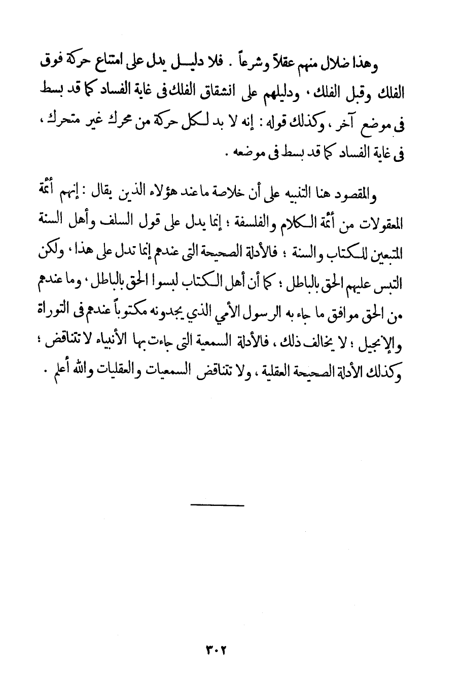وَهَذَا ضَلَالٌ مِنْهُمْ عَقْلًا وَشَرْعًا. فَلَا دَلِيلَ يَدُلُّ عَلَى امْتِنَاعِ حَرَكَةٍ فَوْقَ الْفَلَكِ وَقَبْلَ الْفَلَكِ وَدَلِيلُهُمْ عَلَى انْشِقَاقِ الْفَلَكِ فِي غَايَةِ الْفَسَادِ كَمَا قَدْ بُسِطَ فِي مَوْضِعٍ آخَرَ وَكَذَلِكَ قَوْلُهُ: إنَّهُ لَا بُدَّ لِكُلِّ حَرَكَةٍ مِنْ مُحَرِّكٍ غَيْرِ مُتَحَرِّكٍ فِي غَايَةِ الْفَسَادِ كَمَا قَدْ بُسِطَ فِي مَوْضِعِهِ. وَالْمَقْصُودُ هُنَا التَّنْبِيهُ عَلَى أَنَّ خُلَاصَةَ مَا عِنْدَ هَؤُلَاءِ الَّذِينَ يُقَالُ: إنَّهُمْ أَئِمَّةُ الْمَعْقُولَاتِ مِنْ أَئِمَّةِ الْكَلَامِ وَالْفَلْسَفَةِ. إنَّمَا يَدُلُّ عَلَى قَوْلِ السَّلَفِ وَأَهْلِ السُّنَّةِ الْمُتَّبِعِينَ لِلْكِتَابِ وَالسُّنَّةِ؛ فَالْأَدِلَّةُ الصَّحِيحَةُ الَّتِي عِنْدَهُمْ إنَّمَا تَدُلُّ عَلَى هَذَا وَلَكِنْ الْتَبَسَ عَلَيْهِمْ الْحَقُّ بِالْبَاطِلِ؛ كَمَا أَنَّ أَهْلَ الْكِتَابِ لَبِسُوا الْحَقَّ بِالْبَاطِلِ وَمَا عِنْدَهُمْ مِنْ الْحَقِّ مُوَافِقٌ مَا جَاءَ بِهِ الرَّسُولُ الْأُمِّيُّ الَّذِي يَجِدُونَهُ مَكْتُوبًا عِنْدَهُمْ فِي التَّوْرَاةِ وَالْإِنْجِيلِ؛ لَا يُخَالِفُ ذَلِكَ فَالْأَدِلَّةُ السَّمْعِيَّةُ الَّتِي جَاءَتْ بِهَا الْأَنْبِيَاءُ لَا تَتَنَاقَضُ؛ وَكَذَلِكَ الْأَدِلَّةُ الصَّحِيحَةُ الْعَقْلِيَّةُ وَلَا تَتَنَاقَضُ السَّمْعِيَّاتُ وَالْعَقْلِيَّاتُ وَاَللَّهُ أَعْلَمُ.