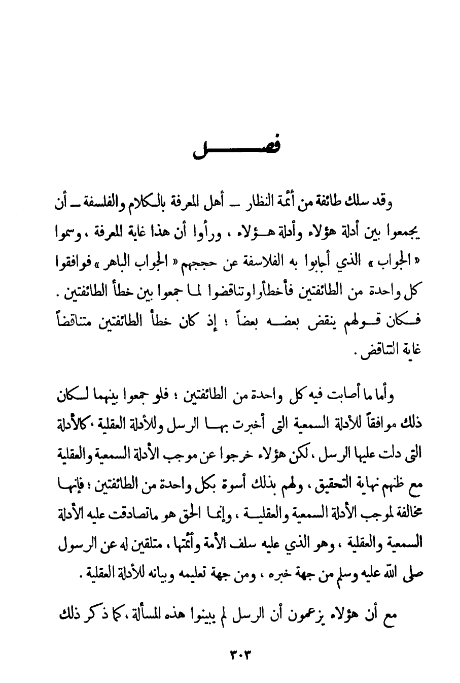 وَقَدْ سَلَكَ طَائِفَةٌ مِنْ أَئِمَّةِ النُّظَّارِ - أَهْلِ الْمَعْرِفَةِ بِالْكَلَامِ وَالْفَلْسَفَةِ - أَنْ يَجْمَعُوا بَيْنَ أَدِلَّةِ هَؤُلَاءِ وَأَدِلَّةِ هَؤُلَاءِ وَرَأَوْا أَنَّ هَذَا غَايَةُ الْمَعْرِفَةِ وَسَمَّوْا " الْجَوَابَ " الَّذِي أَجَابُوا بِهِ الْفَلَاسِفَةَ عَنْ حُجَجِهِمْ " الْجَوَابَ الْبَاهِرَ " فَوَافَقُوا كُلَّ وَاحِدَةٍ مِنْ الطَّائِفَتَيْنِ فَأَخْطَئُوا وَتَنَاقَضُوا لَمَّا جَمَعُوا بَيْنَ خَطَأِ الطَّائِفَتَيْنِ. فَكَانَ قَوْلُهُمْ يَنْقُضُ بَعْضُهُ بَعْضًا؛ إذْ كَانَ خَطَأُ الطَّائِفَتَيْنِ مُتَنَاقِضًا غَايَةَ التَّنَاقُضِ. وَأَمَّا مَا أَصَابَتْ فِيهِ كُلُّ وَاحِدَةٍ مِنْ الطَّائِفَتَيْنِ؛ فَلَوْ جَمَعُوا بَيْنَهُمَا لَكَانَ ذَلِكَ مُوَافِقًا لِلْأَدِلَّةِ السَّمْعِيَّةِ الَّتِي أَخْبَرَتْ بِهَا الرُّسُلُ وَلِلْأَدِلَّةِ الْعَقْلِيَّةِ كَالْأَدِلَّةِ الَّتِي دَلَّتْ عَلَيْهَا الرُّسُلُ لَكِنَّ هَؤُلَاءِ خَرَجُوا عَنْ مُوجَبِ الْأَدِلَّةِ السَّمْعِيَّةِ وَالْعَقْلِيَّةِ مَعَ ظَنِّهِمْ نِهَايَةَ التَّحْقِيقِ وَلَهُمْ بِذَلِكَ أُسْوَةٌ بِكُلِّ وَاحِدَةٍ مِنْ الطَّائِفَتَيْنِ؛ فَإِنَّهَا مُخَالِفَةٌ لِمُوجَبِ الْأَدِلَّةِ السَّمْعِيَّةِ وَالْعَقْلِيَّةِ وَإِنَّمَا الْحَقُّ هُوَ مَا تَصَادَقَتْ عَلَيْهِ الْأَدِلَّةُ السَّمْعِيَّةُ وَالْعَقْلِيَّةُ وَهُوَ الَّذِي عَلَيْهِ سَلَفُ الْأُمَّةِ وَأَئِمَّتُهَا مُتَلَقِّينَ لَهُ عَنْ الرَّسُولِ صَلَّى اللَّهُ عَلَيْهِ وَسَلَّمَ مِنْ جِهَةِ خَبَرِهِ وَمِنْ جِهَةِ تَعْلِيمِهِ وَبَيَانِهِ لِلْأَدِلَّةِ الْعَقْلِيَّةِ. مَعَ أَنَّ هَؤُلَاءِ يَزْعُمُونَ أَنَّ الرُّسُلَ لَمْ يُبَيِّنُوا هَذِهِ الْمَسْأَلَةَ كَمَا ذَكَرَ ذَلِكَ