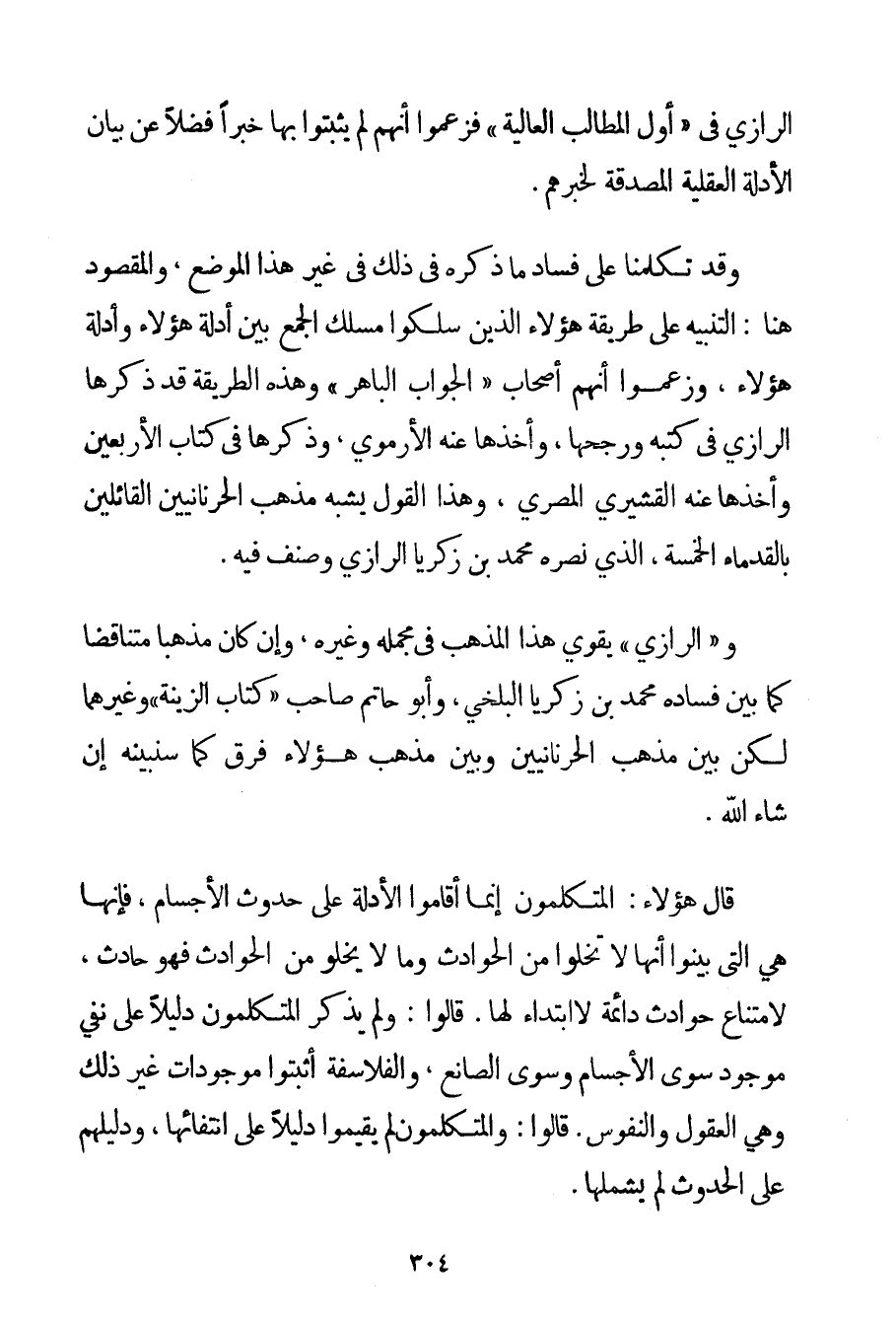 الرَّازِي فِي " أَوَّلِ الْمَطَالِبِ الْعَالِيَةِ " فَزَعَمُوا أَنَّهُمْ لَمْ يُثْبِتُوا بِهَا خَبَرًا فَضْلًا عَنْ بَيَانِ الْأَدِلَّةِ الْعَقْلِيَّةِ الْمُصَدِّقَةِ لِخَبَرِهِمْ. وَقَدْ تَكَلَّمْنَا عَلَى فَسَادِ مَا ذَكَرَهُ فِي ذَلِكَ فِي غَيْرِ هَذَا الْمَوْضِعِ وَالْمَقْصُودُ هُنَا: التَّنْبِيهُ عَلَى طَرِيقَةِ هَؤُلَاءِ الَّذِينَ سَلَكُوا مَسْلَكَ الْجَمْعِ بَيْنَ أَدِلَّةِ هَؤُلَاءِ وَأَدِلَّةِ هَؤُلَاءِ وَزَعَمُوا أَنَّهُمْ أَصْحَابُ " الْجَوَابِ الْبَاهِرِ " وَهَذِهِ الطَّرِيقَةُ قَدْ ذَكَرَهَا الرَّازِي فِي كُتُبِهِ وَرَجَّحَهَا وَأَخَذَهَا عَنْهُ الأرموي وَذَكَرَهَا فِي كِتَابِ الْأَرْبَعِينَ وَأَخَذَهَا عَنْهُ القشيري الْمِصْرِيُّ وَهَذَا الْقَوْلُ يُشْبِهُ مَذْهَبَ الحرنانيين الْقَائِلِينَ بِالْقُدَمَاءِ الْخَمْسَةِ الَّذِي نَصَرَهُ مُحَمَّدُ بْنُ زَكَرِيَّا الرَّازِي وَصَنَّفَ فِيهِ. وَالرَّازِي " يُقَوِّي هَذَا الْمَذْهَبَ فِي مُجْمَلِهِ وَغَيْرِهِ وَإِنْ كَانَ مَذْهَبًا مُتَنَاقِضًا كَمَا بَيَّنَ فَسَادَهُ مُحَمَّدُ بْنُ زَكَرِيَّا البلخي وَأَبُو حَاتِمٍ صَاحِبُ " كِتَابِ الزِّينَةِ " وَغَيْرُهُمَا لَكِنْ بَيْنَ مَذْهَبِ الحرنانيين وَبَيْنَ مَذْهَبِ هَؤُلَاءِ فَرْقٌ كَمَا سَنُبَيِّنُهُ إنْ شَاءَ اللَّهُ. قَالَ هَؤُلَاءِ: الْمُتَكَلِّمُونَ إنَّمَا أَقَامُوا الْأَدِلَّةَ عَلَى حُدُوثِ الْأَجْسَامِ فَإِنَّهَا هِيَ الَّتِي بَيَّنُوا أَنَّهَا لَا تَخْلُوا مِنْ الْحَوَادِثِ وَمَا لَا يَخْلُو مِنْ الْحَوَادِثِ فَهُوَ حَادِثٌ لِامْتِنَاعِ حَوَادِثَ دَائِمَةٍ لَا ابْتِدَاءَ لَهَا. قَالُوا: وَلَمْ يَذْكُرْ الْمُتَكَلِّمُونَ دَلِيلًا عَلَى نَفْيِ مَوْجُودٍ سِوَى الْأَجْسَامِ وَسِوَى الصَّانِعِ وَالْفَلَاسِفَةُ أَثْبَتُوا مَوْجُودَاتٍ غَيْرَ ذَلِكَ وَهِيَ الْعُقُولُ وَالنُّفُوسُ. قَالُوا: والمتكلمون لَمْ يُقِيمُوا دَلِيلًا عَلَى انْتِفَائِهَا وَدَلِيلُهُمْ عَلَى الْحُدُوثِ لَمْ يَشْمَلْهَا.