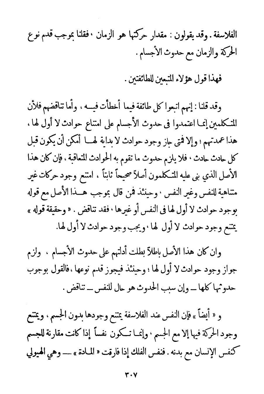 الْفَلَاسِفَةِ. وَقَدْ يَقُولُونَ: مِقْدَارُ حَرَكَتِهَا هُوَ الزَّمَانُ فَقُلْنَا بِمُوجَبِ قِدَمِ نَوْعِ الْحَرَكَةِ وَالزَّمَانِ مَعَ حُدُوثِ الْأَجْسَامِ. فَهَذَا قَوْلُ هَؤُلَاءِ الْمُتَّبِعِينَ لِلطَّائِفَتَيْنِ. وَقَدْ قُلْنَا: إنَّهُمْ اتَّبَعُوا كُلَّ طَائِفَةٍ فِيمَا أَخْطَأَتْ فِيهِ وَأَمَّا تَنَاقُضُهُمْ فَلِأَنَّ الْمُتَكَلِّمِينَ إنَّمَا اعْتَمَدُوا فِي حُدُوثِ الْأَجْسَامِ عَلَى امْتِنَاعِ حَوَادِثَ لَا أَوَّلَ لَهَا هَذَا عُمْدَتُهُمْ؛ وَإِلَّا فَمَتَى جَازَ وُجُودُ حَوَادِثَ لَا بِدَايَةَ لَهَا أَمْكَنَ أَنْ يَكُونَ قَبْلَ كُلِّ حَادِثٍ حَادِثٌ فَلَا يَلْزَمُ حُدُوثُ مَا تَقُومُ بِهِ الْحَوَادِثُ الْمُتَعَاقِبَةُ فَإِنْ كَانَ هَذَا الْأَصْلُ الَّذِي بَنَى عَلَيْهِ الْمُتَكَلِّمُونَ أَصْلًا صَحِيحًا ثَابِتًا امْتَنَعَ وُجُودُ حَرَكَاتٍ غَيْرِ مُتَنَاهِيَةٍ لِلنَّفْسِ وَغَيْرِ النَّفْسِ وَحِينَئِذٍ فَمَنْ قَالَ بِمُوجَبِ هَذَا الْأَصْلِ مَعَ قَوْلِهِ بِوُجُودِ حَوَادِثَ لَا أَوَّلَ لَهَا فِي النَّفْسِ أَوْ غَيْرِهَا فَقَدْ تَنَاقَضَ. " وَحَقِيقَةُ قَوْلِهِ " يَمْتَنِعُ وُجُودُ حَوَادِثَ لَا أَوَّلَ لَهَا وَيَجِبُ وُجُودُ حَوَادِثَ لَا أَوَّلَ لَهَا. وَإِنْ كَانَ هَذَا الْأَصْلُ بَاطِلًا بَطَلَتْ أَدِلَّتُهُمْ عَلَى حُدُوثِ الْأَجْسَامِ وَلَزِمَ جَوَازُ وُجُودِ حَوَادِثَ لَا أَوَّلَ لَهَا؛ وَحِينَئِذٍ فَيَجُوزُ قِدَمُ نَوْعِهَا فَالْقَوْلُ بِوُجُوبِ حُدُوثِهَا كُلِّهَا - وَأَنَّ سَبَبَ الْحُدُوثِ هُوَ حَالٌ لِلنَّفْسِ - تَنَاقُضٌ. وَ " أَيْضًا " فَإِنَّ النَّفْسَ عِنْدَ الْفَلَاسِفَةِ يَمْتَنِعُ وُجُودُهَا بِدُونِ الْجِسْمِ وَيَمْتَنِعُ وُجُودُ الْحَرَكَةِ فِيهَا إلَّا مَعَ الْجِسْمِ وَإِنَّمَا تَكُونُ نَفْسًا إذَا كَانَتْ مُقَارِنَةً لِلْجِسْمِ كَنَفْسِ الْإِنْسَانِ مَعَ بَدَنِهِ. فَنَفْسُ الْفَلَكِ إذَا فَارَقَتْ " الْمَادَّةَ " - وَهِيَ الْهَيُولى