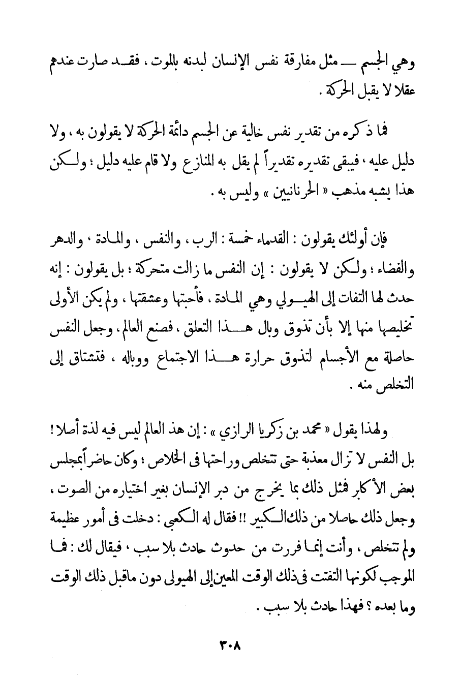 وَهِيَ الْجِسْمُ - مِثْلُ مُفَارَقَةِ نَفْسِ الْإِنْسَانِ لِبَدَنِهِ بِالْمَوْتِ فَقَدْ صَارَتْ عِنْدَهُمْ عَقْلًا لَا يَقْبَلُ الْحَرَكَةَ. فَمَا ذَكَرَهُ مِنْ تَقْدِيرِ نَفْسٍ خَالِيَةٍ عَنْ الْجِسْمِ دَائِمَةِ الْحَرَكَةِ لَا يَقُولُونَ بِهِ وَلَا دَلِيلَ عَلَيْهِ فَيَبْقَى تَقْدِيرُهُ تَقْدِيرًا لَمْ يَقُلْ بِهِ الْمُنَازِعُ وَلَا قَامَ عَلَيْهِ دَلِيلٌ؛ وَلَكِنَّ هَذَا يُشْبِهُ مَذْهَبَ " الحرنانيين " وَلَيْسَ بِهِ. فَإِنَّ أُولَئِكَ يَقُولُونَ: الْقُدَمَاءُ خَمْسَةٌ: الرَّبُّ وَالنَّفْسُ وَالْمَادَّةُ وَالدَّهْرُ وَالْفَضَاءُ؛ وَلَكِنْ لَا يَقُولُونَ: إنَّ النَّفْسَ مَا زَالَتْ مُتَحَرِّكَةً؛ بَلْ يَقُولُونَ: إنَّهُ حَدَثَ لَهَا الْتِفَاتٌ إلَى الْهَيُولَى وَهِيَ الْمَادَّةُ فَأَحَبَّتْهَا وَعَشِقَتْهَا وَلَمْ يَكُنْ الْأَوْلَى تَخْلِيصَهَا مِنْهَا إلَّا بِأَنْ تَذُوقَ وَبَالَ هَذَا التَّعَلُّقِ فَصَنَعَ الْعَالَمَ وَجَعَلَ النَّفْسَ حَاصِلَةً مَعَ الْأَجْسَامِ لِتَذُوقَ حَرَارَةَ هَذَا الِاجْتِمَاعِ وَوَبَالَهُ فَتَشْتَاقَ إلَى التَّخَلُّصِ مِنْهُ. وَلِهَذَا يَقُولُ " مُحَمَّدُ بْنُ زَكَرِيَّا الرَّازِي ": إنَّ هَذَا الْعَالَمَ لَيْسَ فِيهِ لَذَّةٌ أَصْلًا بَلْ النَّفْسُ لَا تَزَالُ مُعَذَّبَةً حَتَّى تَتَخَلَّصَ وَرَاحَتُهَا فِي الْخَلَاصِ؛ وَكَانَ حَاضِرًا بِمَجْلِسِ بَعْضِ الْأَكَابِرِ فَمَثَّلَ ذَلِكَ بِمَا يَخْرُجُ مِنْ دُبُرِ الْإِنْسَانِ بِغَيْرِ اخْتِيَارِهِ مِنْ الصَّوْتِ وَجَعَلَ ذَلِكَ حَاصِلًا مِنْ ذَلِكَ الْكَبِيرِ فَقَالَ لَهُ الْكَعْبِيُّ: دَخَلْت فِي أُمُورٍ عَظِيمَةٍ وَلَمْ تَتَخَلَّصْ وَأَنْتَ إنَّمَا فَرَرْت مِنْ حُدُوثِ حَادِثٍ بِلَا سَبَبٍ فَيُقَالُ لَك: فَمَا الْمُوجِبُ لِكَوْنِهَا الْتَفَتَتْ فِي ذَلِكَ الْوَقْتِ الْمُعَيَّنِ إلَى الْهَيُولَى دُونَ مَا قَبْلَ ذَلِكَ الْوَقْتِ وَمَا بَعْدَهُ؟ فَهَذَا حَادِثٌ بِلَا سَبَبٍ.