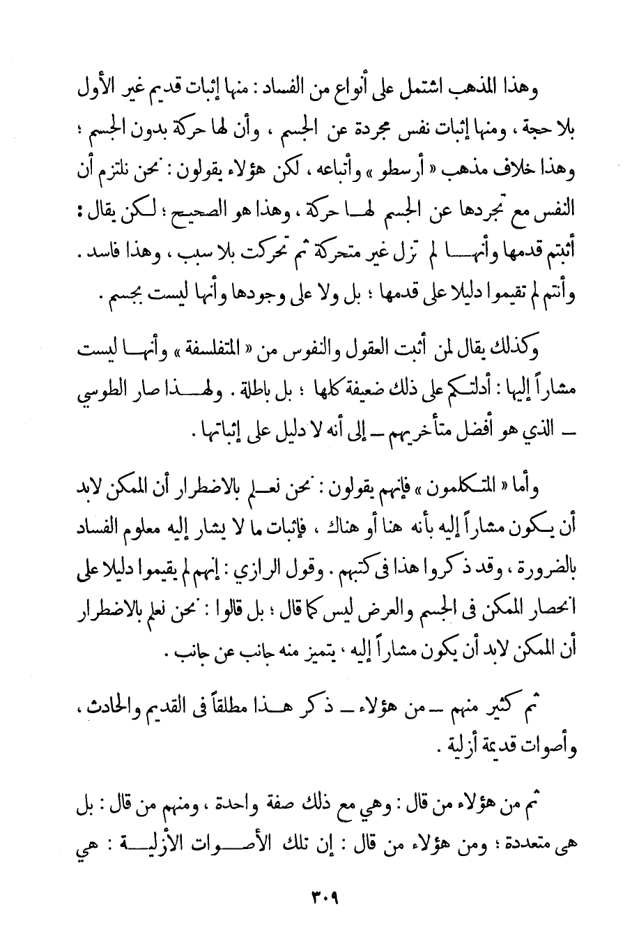 وَهَذَا الْمَذْهَبُ اشْتَمَلَ عَلَى أَنْوَاعٍ مِنْ الْفَسَادِ: مِنْهَا إثْبَاتُ قَدِيمٍ غَيْرِ الْأَوَّلِ بِلَا حُجَّةٍ وَمِنْهَا إثْبَاتُ نَفْسٍ مُجَرَّدَةٍ عَنْ الْجِسْمِ وَأَنَّ لَهَا حَرَكَةً بِدُونِ الْجِسْمِ؛ وَهَذَا خِلَافُ مَذْهَبِ " أَرِسْطُو " وَأَتْبَاعِهِ لَكِنَّ هَؤُلَاءِ يَقُولُونَ: نَحْنُ نَلْتَزِمُ أَنَّ النَّفْسَ مَعَ تَجَرُّدِهَا عَنْ الْجِسْمِ لَهَا حَرَكَةٌ وَهَذَا هُوَ الصَّحِيحُ؛ لَكِنْ يُقَالُ: أَثْبَتُّمْ قِدَمَهَا وَأَنَّهَا لَمْ تَزَلْ غَيْرَ مُتَحَرِّكَةٍ ثُمَّ تَحَرَّكَتْ بِلَا سَبَبٍ وَهَذَا فَاسِدٌ. وَأَنْتُمْ لَمْ تُقِيمُوا دَلِيلًا عَلَى قِدَمِهَا؛ بَلْ وَلَا عَلَى وُجُودِهَا وَأَنَّهَا لَيْسَتْ بِجِسْمِ. وَكَذَلِكَ يُقَالُ لِمَنْ أَثْبَتَ الْعُقُولَ وَالنُّفُوسَ مِنْ " الْمُتَفَلْسِفَةِ " وَأَنَّهَا لَيْسَتْ مُشَارًا إلَيْهَا: أَدِلَّتُكُمْ عَلَى ذَلِكَ ضَعِيفَةٌ كُلُّهَا؛ بَلْ بَاطِلَةٌ. وَلِهَذَا صَارَ الطوسي - الَّذِي هُوَ أَفْضَلُ مُتَأَخِّرِيهِمْ - إلَى أَنَّهُ لَا دَلِيلَ عَلَى إثْبَاتِهَا. وَأَمَّا " الْمُتَكَلِّمُونَ " فَإِنَّهُمْ يَقُولُونَ: نَحْنُ نَعْلَمُ بِالِاضْطِرَارِ أَنَّ الْمُمْكِنَ لَا بُدَّ أَنْ يَكُونَ مُشَارًا إلَيْهِ بِأَنَّهُ هُنَا أَوْ هُنَاكَ فَإِثْبَاتُ مَا لَا يُشَارُ إلَيْهِ مَعْلُومُ الْفَسَادِ بِالضَّرُورَةِ وَقَدْ ذَكَرُوا هَذَا فِي كُتُبِهِمْ. وَقَوْلُ الرَّازِي: إنَّهُمْ لَمْ يُقِيمُوا دَلِيلًا عَلَى انْحِصَارِ الْمُمْكِنِ فِي الْجِسْمِ وَالْعَرَضِ لَيْسَ كَمَا قَالَ؛ بَلْ قَالُوا: نَحْنُ نَعْلَمُ بِالِاضْطِرَارِ أَنَّ الْمُمْكِنَ لَا بُدَّ أَنْ يَكُونَ مُشَارًا إلَيْهِ يَتَمَيَّزُ مِنْهُ جَانِبٌ عَنْ جَانِبٍ. ثُمَّ كَثِيرٌ مِنْهُمْ - مِنْ هَؤُلَاءِ - ذَكَرَ هَذَا مُطْلَقًا فِي الْقَدِيمِ وَالْحَادِثِ وَأَصْوَاتٍ قَدِيمَةٍ أَزَلِيَّةٍ. ثُمَّ مِنْ هَؤُلَاءِ مَنْ قَالَ: وَهِيَ مَعَ ذَلِكَ صِفَةٌ وَاحِدَةٌ وَمِنْهُمْ مَنْ قَالَ: بَلْ هِيَ مُتَعَدِّدَةٌ؛ وَمِنْ هَؤُلَاءِ مَنْ قَالَ: إنَّ تِلْكَ الْأَصْوَاتَ الْأَزَلِيَّةَ: هِيَ