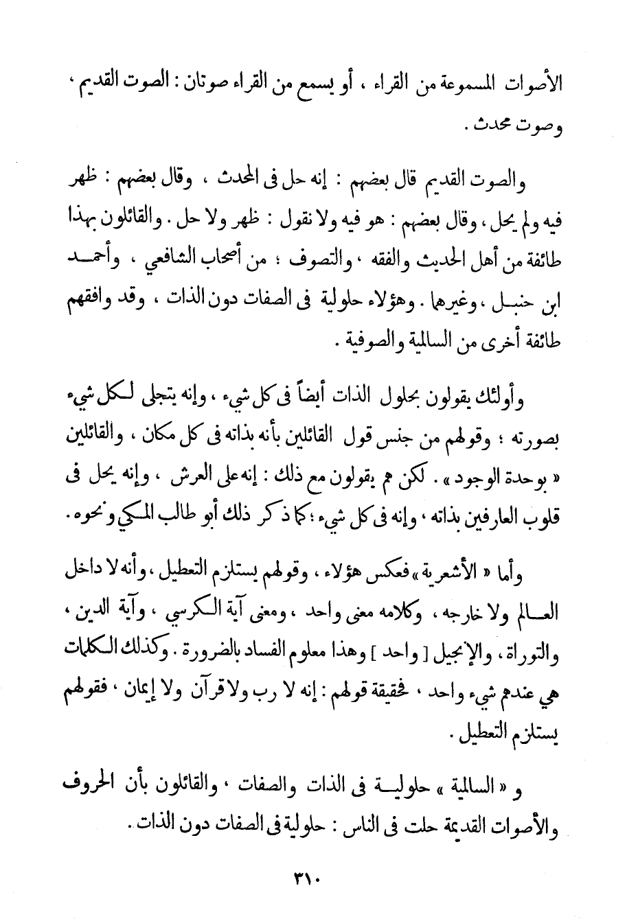 الْأَصْوَاتُ الْمَسْمُوعَةُ مِنْ الْقُرَّاءِ أَوْ يُسْمَعُ مِنْ الْقُرَّاءِ صَوْتَانِ: الصَّوْتُ الْقَدِيمُ وَصَوْتٌ مُحْدَثٌ. وَالصَّوْتُ الْقَدِيمُ قَالَ بَعْضُهُمْ: إنَّهُ حَلَّ فِي الْمُحْدَثِ وَقَالَ بَعْضُهُمْ: ظَهَرَ فِيهِ وَلَمْ يَحُلَّ وَقَالَ بَعْضُهُمْ: هُوَ فِيهِ وَلَا نَقُولُ: ظَهَرَ وَلَا حَلَّ. وَالْقَائِلُونَ بِهَذَا طَائِفَةٌ مِنْ أَهْلِ الْحَدِيثِ وَالْفِقْهِ وَالتَّصَوُّفِ؛ مِنْ أَصْحَابِ الشَّافِعِيِّ وَأَحْمَد بْنِ حَنْبَلٍ وَغَيْرِهِمَا. وَهَؤُلَاءِ حُلُولِيَّةٌ فِي الصِّفَاتِ دُونَ الذَّاتِ وَقَدْ وَافَقَهُمْ طَائِفَةٌ أُخْرَى مِنْ السالمية وَالصُّوفِيَّةِ. وَأُولَئِكَ يَقُولُونَ بِحُلُولِ الذَّاتِ أَيْضًا فِي كُلِّ شَيْءٍ وَأَنَّهُ يَتَجَلَّى لِكُلِّ شَيْءٍ بِصُورَتِهِ؛ وَقَوْلُهُمْ مِنْ جِنْسِ قَوْلِ الْقَائِلِينَ بِأَنَّهُ بِذَاتِهِ فِي كُلِّ مَكَانٍ وَالْقَائِلِينَ " بِوِحْدَةِ الْوُجُودِ ". لَكِنْ هُمْ يَقُولُونَ مَعَ ذَلِكَ: إنَّهُ عَلَى الْعَرْشِ وَإِنَّهُ يَحُلُّ فِي قُلُوبِ الْعَارِفِينَ بِذَاتِهِ وَإِنَّهُ فِي كُلِّ شَيْءٍ؛ كَمَا ذَكَرَ ذَلِكَ أَبُو طَالِبٍ الْمَكِّيُّ وَنَحْوُهُ. وَأَمَّا " الْأَشْعَرِيَّةُ " فَعَكْسُ هَؤُلَاءِ وَقَوْلُهُمْ يَسْتَلْزِمُ التَّعْطِيلَ وَأَنَّهُ لَا دَاخِلَ الْعَالَمِ وَلَا خَارِجَهُ وَكَلَامُهُ مَعْنًى وَاحِدٌ وَمَعْنَى آيَةِ الْكُرْسِيِّ وَآيَةِ الدَّيْنِ وَالتَّوْرَاةِ وَالْإِنْجِيلِ وَاحِدٌ وَهَذَا مَعْلُومُ الْفَسَادِ بِالضَّرُورَةِ. وَكَذَلِكَ الْكَلِمَاتُ هِيَ عِنْدَهُمْ شَيْءٌ وَاحِدٌ فَحَقِيقَةُ قَوْلِهِمْ: إنَّهُ لَا رَبَّ وَلَا قُرْآنَ وَلَا إيمَانَ فَقَوْلُهُمْ يَسْتَلْزِمُ التَّعْطِيلَ.
