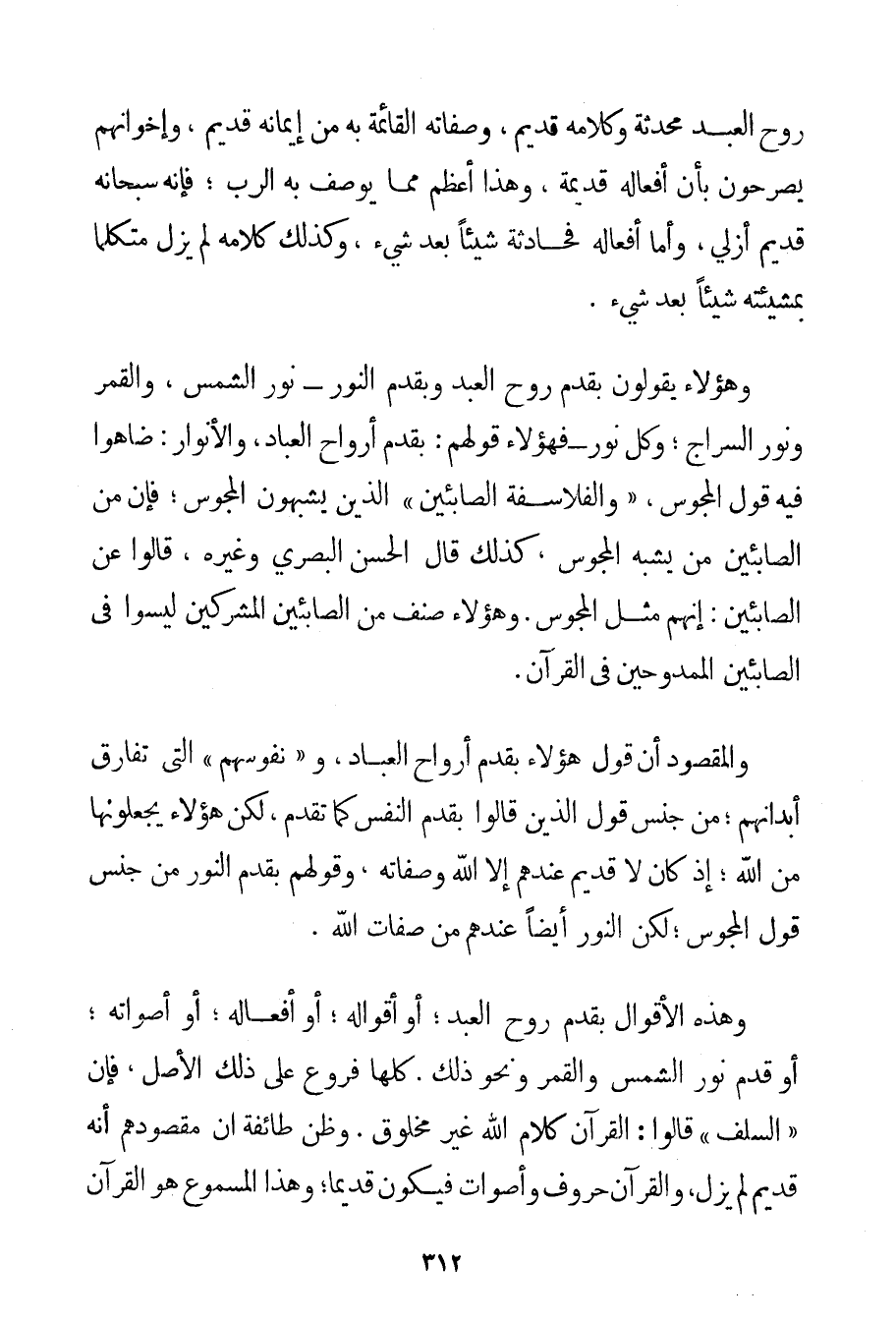 رُوحُ الْعَبْدِ مُحْدَثَةٌ وَكَلَامُهُ قَدِيمٌ وَصِفَاتُهُ الْقَائِمَةُ بِهِ مِنْ إيمَانِهِ قَدِيمَةٌ وَإِخْوَانُهُمْ يُصَرِّحُونَ بِأَنَّ أَفْعَالَهُ قَدِيمَةٌ وَهَذَا أَعْظَمُ مِمَّا يُوصَفُ بِهِ الرَّبُّ؛ فَإِنَّهُ سُبْحَانَهُ قَدِيمٌ أَزَلِيٌّ: وَأَمَّا أَفْعَالُهُ فَحَادِثَةٌ شَيْئًا بَعْدَ شَيْءٍ وَكَذَلِكَ كَلَامُهُ لَمْ يَزَلْ مُتَكَلِّمًا بِمَشِيئَتِهِ شَيْئًا بَعْدَ شَيْءٍ. وَهَؤُلَاءِ يَقُولُونَ بِقِدَمِ رُوحِ الْعَبْدِ وَبِقِدَمِ النُّورِ - نُورِ الشَّمْسِ وَالْقَمَرِ وَنُورِ السِّرَاجِ؛ وَكُلِّ نُورٍ - فَهَؤُلَاءِ قَوْلُهُمْ: بِقِدَمِ أَرْوَاحِ الْعِبَادِ وَالْأَنْوَارِ: ضَاهَوْا فِيهِ قَوْلَ الْمَجُوسِ " وَالْفَلَاسِفَةِ الصَّابِئِينَ " الَّذِينَ يُشْبِهُونَ الْمَجُوسَ؛ فَإِنَّ مِنْ الصَّابِئِينَ مَنْ يُشْبِهُ الْمَجُوسَ كَذَلِكَ قَالَ الْحَسَنُ الْبَصْرِيُّ وَغَيْرُهُ قَالُوا عَنْ الصَّابِئِينَ: إنَّهُمْ مِثْلُ الْمَجُوسِ. وَهَؤُلَاءِ صِنْفٌ مِنْ الصَّابِئِينَ الْمُشْرِكِينَ لَيْسُوا فِي الصَّابِئِينَ الْمَمْدُوحِينَ فِي الْقُرْآنِ. وَالْمَقْصُودُ أَنَّ قَوْلَ هَؤُلَاءِ بِقِدَمِ أَرْوَاحِ الْعِبَادِ وَ " نُفُوسِهِمْ " الَّتِي تُفَارِقُ أَبْدَانَهُمْ. مِنْ جِنْسِ قَوْلِ الَّذِينَ قَالُوا بِقِدَمِ النَّفْسِ كَمَا تَقَدَّمَ لَكِنَّ هَؤُلَاءِ يَجْعَلُونَهَا مِنْ اللَّهِ؛ إذْ كَانَ لَا قَدِيمَ عِنْدَهُمْ إلَّا اللَّهُ وَصِفَاتُهُ وَقَوْلُهُمْ بِقِدَمِ النُّورِ مِنْ جِنْسِ قَوْلِ الْمَجُوسِ. لَكِنَّ النُّورَ أَيْضًا عِنْدَهُمْ مِنْ صِفَاتِ اللَّهِ. وَهَذِهِ الْأَقْوَالُ بِقِدَمِ رُوحِ الْعَبْدِ؛ أَوْ أَقْوَالِهِ؛ أَوْ أَفْعَالِهِ؛ أَوْ أَصْوَاتِهِ؛ أَوْ قِدَمِ نُورِ الشَّمْسِ وَالْقَمَرِ وَنَحْوِ ذَلِكَ. كُلُّهَا فُرُوعٌ عَلَى ذَلِكَ الْأَصْلِ فَإِنَّ " السَّلَفَ " قَالُوا: الْقُرْآنُ كَلَامُ اللَّهِ غَيْرُ مَخْلُوقٍ. وَظَنَّ طَائِفَةٌ أَنَّ مَقْصُودَهُمْ أَنَّهُ قَدِيمٌ لَمْ يَزَلْ وَالْقُرْآنُ حُرُوفٌ وَأَصْوَاتٌ فَيَكُونُ قَدِيمًا؛ وَهَذَا الْمَسْمُوعُ هُوَ الْقُرْآنُ