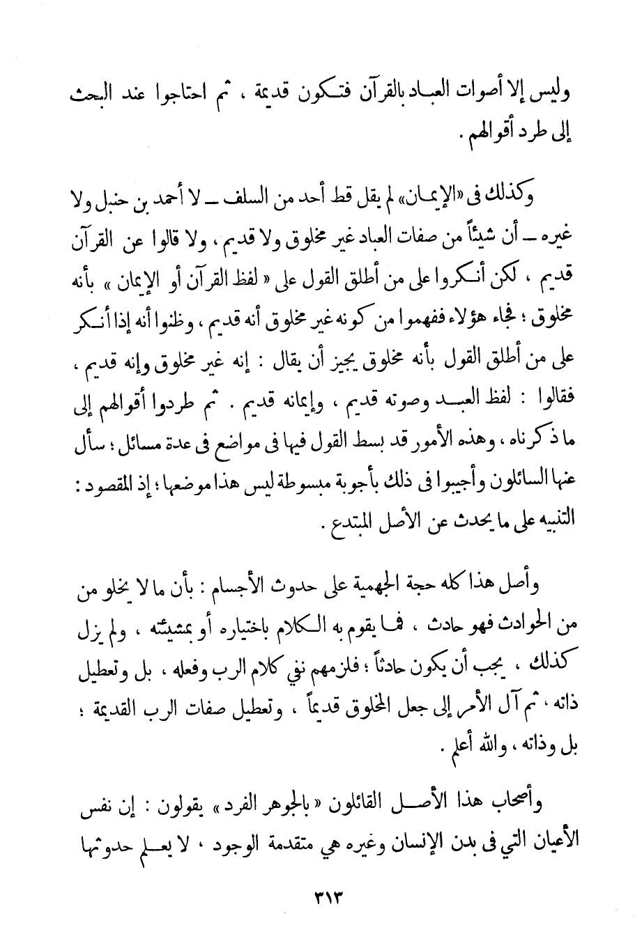 وَلَيْسَ إلَّا أَصْوَاتَ الْعِبَادِ بِالْقُرْآنِ فَتَكُونُ قَدِيمَةً ثُمَّ احْتَاجُوا عِنْدَ الْبَحْثِ إلَى طَرْدِ أَقْوَالِهِمْ. وَكَذَلِكَ فِي " الْإِيمَانِ " لَمْ يَقُلْ قَطُّ أَحَدٌ مِنْ السَّلَفِ - لَا أَحْمَد بْنُ حَنْبَلٍ وَلَا غَيْرُهُ - إنَّ شَيْئًا مِنْ صِفَاتِ الْعِبَادِ غَيْرُ مَخْلُوقٍ وَلَا قَدِيمٍ وَلَا قَالُوا عَنْ الْقُرْآنِ: قَدِيمٌ لَكِنْ أَنْكَرُوا عَلَى مَنْ أَطْلَقَ الْقَوْلَ عَلَى " لَفْظِ الْقُرْآنِ أَوْ الْإِيمَانِ " بِأَنَّهُ مَخْلُوقٌ؛ فَجَاءَ هَؤُلَاءِ فَفَهِمُوا مِنْ كَوْنِهِ غَيْرَ مَخْلُوقٍ أَنَّهُ قَدِيمٌ وَظَنُّوا أَنَّهُ إذَا أُنْكِرَ عَلَى مَنْ أَطْلَقَ الْقَوْلَ بِأَنَّهُ مَخْلُوقٌ يُجِيزُ أَنْ يُقَالَ: إنَّهُ غَيْرُ مَخْلُوقٍ وَإِنَّهُ قَدِيمٌ فَقَالُوا: لَفْظُ الْعَبْدِ وَصَوْتُهُ قَدِيمٌ وَإِيمَانُهُ قَدِيمٌ. ثُمَّ طَرَدُوا أَقْوَالَهُمْ إلَى مَا ذَكَرْنَاهُ وَهَذِهِ الْأُمُورُ قَدْ بُسِطَ الْقَوْلُ فِيهَا فِي مَوَاضِعَ فِي عِدَّةِ مَسَائِلَ؛ سَأَلَ عَنْهَا السَّائِلُونَ وَأُجِيبُوا فِي ذَلِكَ بِأَجْوِبَةِ مَبْسُوطَةٍ لَيْسَ هَذَا مَوْضِعَهَا؛ إذْ الْمَقْصُودُ: التَّنْبِيهُ عَلَى مَا يَحْدُثُ عَنْ الْأَصْلِ الْمُبْتَدَعِ. وَأَصْلُ هَذَا كُلِّهِ حُجَّةُ الْجَهْمِيَّة عَلَى حُدُوثِ الْأَجْسَامِ: بِأَنَّ مَا لَا يَخْلُو مِنْ الْحَوَادِثِ فَهُوَ حَادِثٌ فَمَا يَقُومُ بِهِ الْكَلَامُ بِاخْتِيَارِهِ أَوْ بِمَشِيئَتِهِ وَلَمْ يَزَلْ كَذَلِكَ يَجِبُ أَنْ يَكُونَ حَادِثًا؛ فَلَزِمَهُمْ نَفْيُ كَلَامِ الرَّبِّ وَفِعْلِهِ بَلْ وَتَعْطِيلُ ذَاتِهِ ثُمَّ آلَ الْأَمْرُ إلَى جَعْلِ الْمَخْلُوقِ قَدِيمًا وَتَعْطِيلِ صِفَاتِ الرَّبِّ الْقَدِيمَةِ؛ بَلْ وَذَاتِهِ وَاَللَّهُ أَعْلَمُ. وَأَصْحَابُ هَذَا الْأَصْلِ الْقَائِلُونَ " بِالْجَوْهَرِ الْفَرْدِ " يَقُولُونَ: إنَّ نَفْسَ الْأَعْيَانِ الَّتِي فِي بَدَنِ الْإِنْسَانِ وَغَيْرِهِ هِيَ مُتَقَدِّمَةُ الْوُجُودِ لَا يُعْلَمُ حُدُوثُهَا