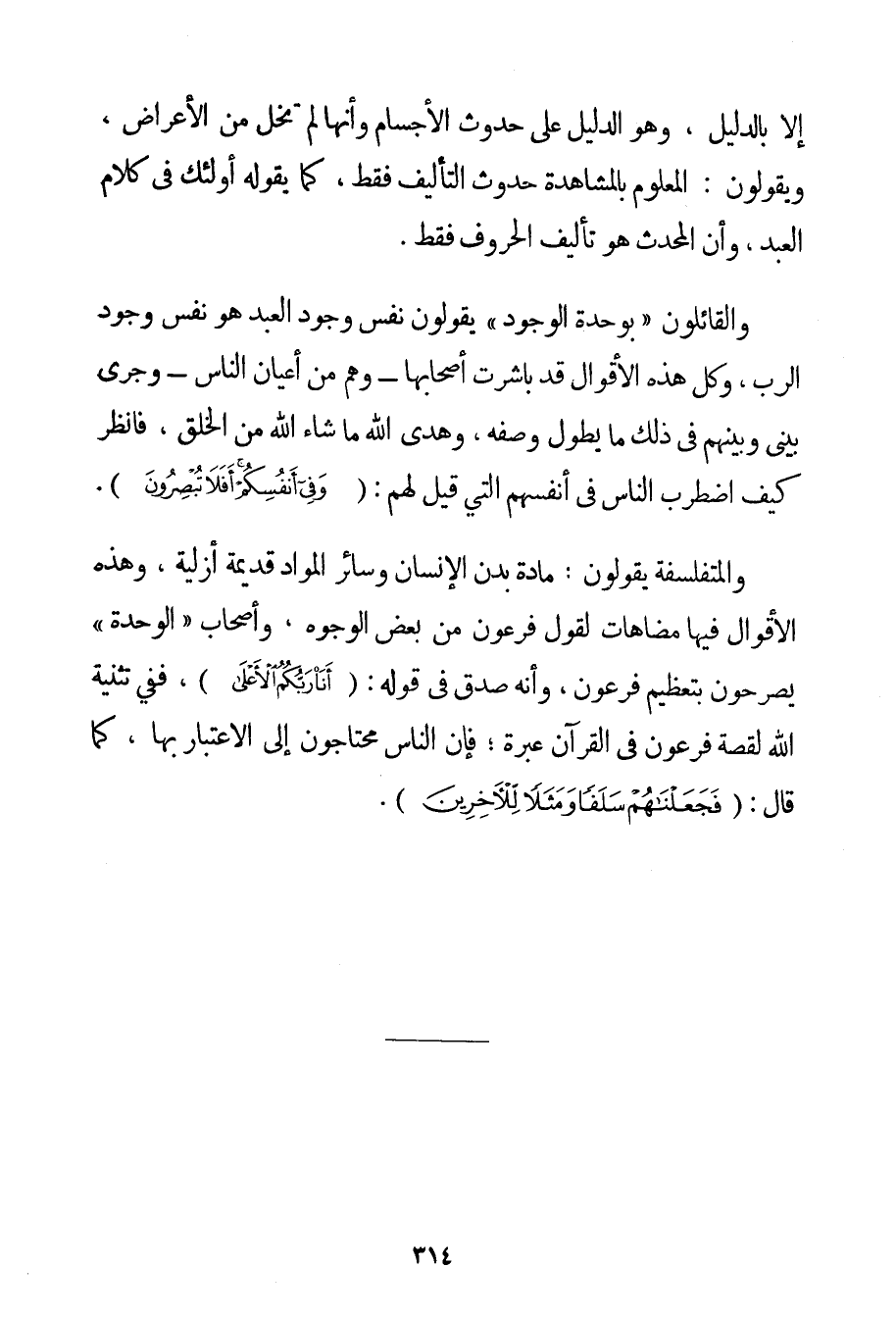 إلَّا بِالدَّلِيلِ وَهُوَ الدَّلِيلُ عَلَى حُدُوثِ الْأَجْسَامِ وَأَنَّهَا لَمْ تَخْلُ مِنْ الْأَعْرَاضِ وَيَقُولُونَ: الْمَعْلُومُ بِالْمُشَاهَدَةِ حُدُوثُ التَّأْلِيفِ فَقَطْ كَمَا يَقُولُهُ أُولَئِكَ فِي كَلَامِ الْعَبْدِ وَأَنَّ الْمُحْدَثَ هُوَ تَأْلِيفُ الْحُرُوفِ فَقَطْ. وَالْقَائِلُونَ " بِوَحْدَةِ الْوُجُودِ " يَقُولُونَ نَفْسُ وُجُودِ الْعَبْدِ هُوَ نَفْسُ وُجُودِ الرَّبِّ وَكُلُّ هَذِهِ الْأَقْوَالِ قَدْ بَاشَرْت أَصْحَابَهَا - وَهُمْ مِنْ أَعْيَانِ النَّاسِ - وَجَرَى بَيْنِي وَبَيْنَهُمْ فِي ذَلِكَ مَا يَطُولُ وَصْفُهُ وَهَدَى اللَّهُ مَا شَاءَ اللَّهُ مِنْ الْخَلْقِ فَانْظُرْ كَيْفَ اضْطَرَبَ النَّاسُ فِي أَنْفُسِهِمْ الَّتِي قِيلَ لَهُمْ: {وَفِي أَنْفُسِكُمْ أَفَلَا تُبْصِرُونَ} .
