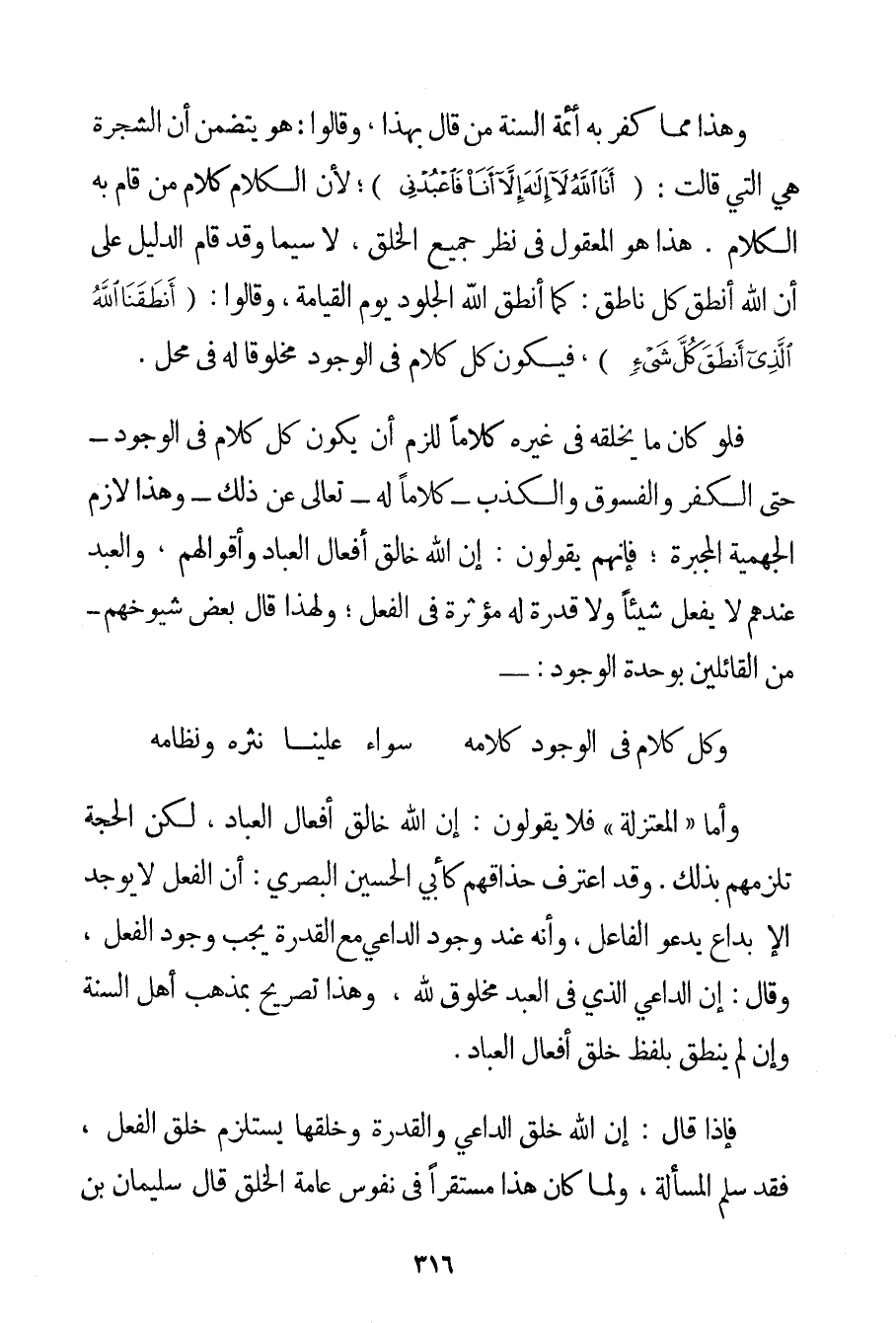 وَهَذَا مِمَّا كَفَّرَ بِهِ أَئِمَّةُ السُّنَّةِ مَنْ قَالَ بِهَذَا وَقَالُوا: هُوَ يَتَضَمَّنُ أَنَّ الشَّجَرَةَ هِيَ الَّتِي قَالَتْ: {أَنَا اللَّهُ لَا إلَهَ إلَّا أَنَا فَاعْبُدْنِي} لِأَنَّ الْكَلَامَ كَلَامُ مَنْ قَامَ بِهِ الْكَلَامُ. هَذَا هُوَ الْمَعْقُولُ فِي نَظَرِ جَمِيعِ الْخَلْقِ لَا سِيَّمَا وَقَدْ قَامَ الدَّلِيلُ عَلَى أَنَّ اللَّهَ أَنْطَقَ كُلَّ نَاطِقٍ: كَمَا أَنْطَقَ اللَّهُ الْجُلُودَ يَوْمَ الْقِيَامَةِ وَقَالُوا: {أَنْطَقَنَا اللَّهُ الَّذِي أَنْطَقَ كُلَّ شَيْءٍ} فَيَكُونُ كُلُّ كَلَامٍ فِي الْوُجُودِ مَخْلُوقًا لَهُ فِي مَحَلٍّ. فَلَوْ كَانَ مَا يَخْلُقُهُ فِي غَيْرِهِ كَلَامًا لَلَزِمَ أَنْ يَكُونَ كُلُّ كَلَامٍ فِي الْوُجُودِ - حَتَّى الْكُفْرِ وَالْفُسُوقِ وَالْكَذِبِ - كَلَامًا لَهُ - تَعَالَى عَنْ ذَلِكَ - وَهَذَا لَازِمُ الْجَهْمِيَّة الْمُجْبِرَةِ؛ فَإِنَّهُمْ يَقُولُونَ: إنَّ اللَّهَ خَالِقُ أَفْعَالِ الْعِبَادِ وَأَقْوَالِهِمْ وَالْعَبْدُ عِنْدَهُمْ لَا يَفْعَلُ شَيْئًا وَلَا قُدْرَةَ لَهُ مُؤَثِّرَةً فِي الْفِعْلِ؛ وَلِهَذَا قَالَ بَعْضُ شُيُوخِهِمْ - مِنْ الْقَائِلِينَ بِوَحْدَةِ الْوُجُودِ: - وَكُلُّ كَلَامٍ فِي الْوُجُودِ كَلَامُهُ سَوَاءٌ عَلَيْنَا نَثْرُهُ وَنِظَامُهُ وَأَمَّا " الْمُعْتَزِلَةُ " فَلَا يَقُولُونَ: إنَّ اللَّهَ خَالِقُ أَفْعَالِ الْعِبَادِ لَكِنَّ الْحُجَّةَ تَلْزَمُهُمْ بِذَلِكَ. وَقَدْ اعْتَرَفَ حُذَّاقُهُمْ كَأَبِي الْحُسَيْنِ الْبَصْرِيِّ: أَنَّ الْفِعْلَ لَا يُوجَدُ إلَّا بِدَاعٍ يَدْعُو الْفَاعِلَ وَأَنَّهُ عِنْدَ وُجُودِ الدَّاعِي مَعَ الْقُدْرَةِ يَجِبُ وُجُودُ الْفِعْلِ وَقَالَ: إنَّ الدَّاعِيَ الَّذِي فِي الْعَبْدِ مَخْلُوقٌ لِلَّهِ وَهَذَا تَصْرِيحٌ بِمَذْهَبِ أَهْلِ السُّنَّةِ وَإِنْ لَمْ يَنْطِقْ بِلَفْظِ خَلْقِ أَفْعَالِ الْعِبَادِ. فَإِذَا قَالَ: إنَّ اللَّهَ خَلَقَ الدَّاعِيَ وَالْقُدْرَةَ وَخَلْقُهَا يَسْتَلْزِمُ خَلْقَ الْفِعْلِ فَقَدْ سَلَّمَ الْمَسْأَلَةَ وَلَمَّا كَانَ هَذَا مُسْتَقِرًّا فِي نُفُوسِ عَامَّةِ الْخَلْقِ قَالَ سُلَيْمَانُ بْنُ