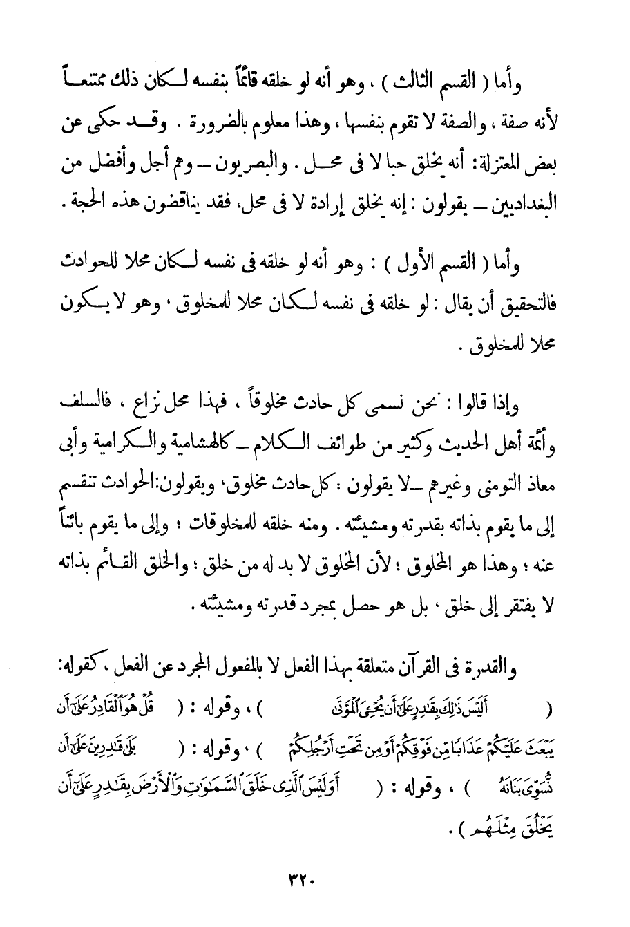 وَأَمَّا الْقِسْمُ الثَّالِثُ وَهُوَ أَنَّهُ لَوْ خَلَقَهُ قَائِمًا بِنَفْسِهِ لَكَانَ ذَلِكَ مُمْتَنِعًا لِأَنَّهُ صِفَةٌ وَالصِّفَةُ لَا تَقُومُ بِنَفْسِهَا وَهَذَا مَعْلُومٌ بِالضَّرُورَةِ. وَقَدْ حُكِيَ عَنْ بَعْضِ الْمُعْتَزِلَةِ: أَنَّهُ يَخْلُقُ حِبَالًا فِي مَحَلٍّ. وَالْبَصْرِيُّونَ - وَهُمْ أَجَلُّ وَأَفْضَلُ مِنْ الْبَغْدَادِيِّينَ - يَقُولُونَ: إنَّهُ يَخْلُقُ إرَادَةً لَا فِي مَحَلٍّ فَقَدْ يُنَاقِضُونَ هَذِهِ الْحُجَّةَ. وَأَمَّا الْقِسْمُ الْأَوَّلُ؛ وَهُوَ أَنَّهُ لَوْ خَلَقَهُ فِي نَفْسِهِ لَكَانَ مَحَلًّا لِلْحَوَادِثِ فَالتَّحْقِيقُ أَنْ يُقَالَ: لَوْ خَلَقَهُ فِي نَفْسِهِ لَكَانَ مَحَلًّا لِلْمَخْلُوقِ وَهُوَ لَا يَكُونُ مَحَلًّا لِلْمَخْلُوقِ. وَإِذَا قَالُوا: نَحْنُ نُسَمِّي كُلَّ حَادِثٍ مَخْلُوقًا فَهَذَا مَحَلُّ نِزَاعٍ فَالسَّلَفُ وَأَئِمَّةُ أَهْلِ الْحَدِيثِ وَكَثِيرٌ مِنْ طَوَائِفِ الْكَلَامِ - كالهشامية والكَرَّامِيَة وَأَبِي مُعَاذٍ التومني وَغَيْرِهِمْ - لَا يَقُولُونَ: كُلُّ حَادِثٍ مَخْلُوقٌ وَيَقُولُونَ: الْحَوَادِثُ تَنْقَسِمُ إلَى مَا يَقُومُ بِذَاتِهِ بِقُدْرَتِهِ وَمَشِيئَتِهِ. وَمِنْهُ خَلْقُهُ لِلْمَخْلُوقَاتِ؛ وَإِلَى مَا يَقُومُ بَائِنًا عَنْهُ؛ وَهَذَا هُوَ الْمَخْلُوقُ؛ لِأَنَّ الْمَخْلُوقَ لَا بُدَّ لَهُ مِنْ خَلْقٍ: وَالْخَلْقُ الْقَائِمُ بِذَاتِهِ لَا يَفْتَقِرُ إلَى خَلْقٍ بَلْ هُوَ حَصَلَ بِمُجَرَّدِ قُدْرَتِهِ وَمَشِيئَتِهِ. وَالْقُدْرَةُ فِي الْقُرْآنِ مُتَعَلِّقَةٌ بِهَذَا الْفِعْلِ لَا بِالْمَفْعُولِ الْمُجَرَّدِ عَنْ الْفِعْلِ كَقَوْلِهِ: {أَلَيْسَ ذَلِكَ بِقَادِرٍ عَلَى أَنْ يُحْيِيَ الْمَوْتَى} وَقَوْلِهِ: {قُلْ هُوَ الْقَادِرُ عَلَى أَنْ يَبْعَثَ عَلَيْكُمْ عَذَابًا مِنْ فَوْقِكُمْ أَوْ مِنْ تَحْتِ أَرْجُلِكُمْ} وَقَوْلِهِ: {بَلَى قَادِرِينَ عَلَى أَنْ نُسَوِّيَ بَنَانَهُ} وَقَوْلِهِ: {أَوَلَيْسَ الَّذِي خَلَقَ السَّمَاوَاتِ وَالْأَرْضَ بِقَادِرٍ عَلَى أَنْ يَخْلُقَ مِثْلَهُمْ} .