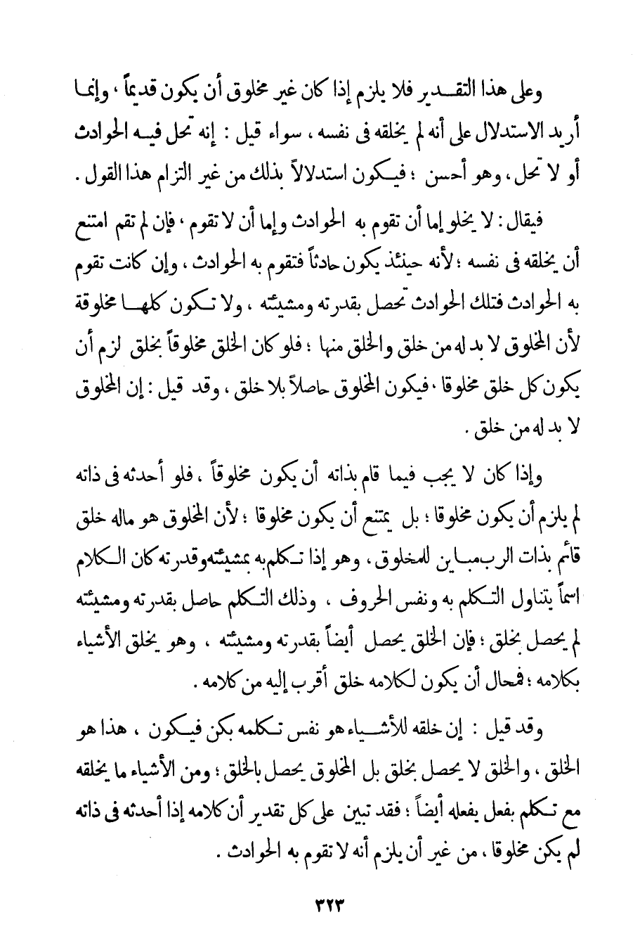 وَعَلَى هَذَا التَّقْدِيرِ فَلَا يَلْزَمُ إذَا كَانَ غَيْرَ مَخْلُوقٍ أَنْ يَكُونَ قَدِيمًا وَإِنَّمَا أُرِيدَ الِاسْتِدْلَالُ عَلَى أَنَّهُ لَمْ يَخْلُقْهُ فِي نَفْسِهِ سَوَاءٌ قِيلَ: إنَّهُ تَحُلُّ فِيهِ الْحَوَادِثُ أَوْ لَا تَحُلُّ وَهُوَ أَحْسَنُ؛ فَيَكُونُ اسْتِدْلَالًا بِذَلِكَ مِنْ غَيْرِ الْتِزَامِ هَذَا الْقَوْلِ. فَيُقَالُ: لَا يَخْلُو إمَّا أَنْ تَقُومَ بِهِ الْحَوَادِثُ وَإِمَّا أَنْ لَا تَقُومَ فَإِنْ لَمْ تَقُمْ امْتَنَعَ أَنْ يَخْلُقَهُ فِي نَفْسِهِ؛ لِأَنَّهُ حِينَئِذٍ يَكُونُ حَادِثًا فَتَقُومُ بِهِ الْحَوَادِثُ وَإِنْ كَانَتْ تَقُومُ بِهِ الْحَوَادِثُ فَتِلْكَ الْحَوَادِثُ تَحْصُلُ بِقُدْرَتِهِ وَمَشِيئَتِهِ وَلَا تَكُونُ كُلُّهَا مَخْلُوقَةً لِأَنَّ الْمَخْلُوقَ لَا بُدَّ لَهُ مِنْ خَلْقٍ وَالْخَلْقُ مِنْهَا؛ فَلَوْ كَانَ الْخَلْقُ مَخْلُوقًا بِخَلْقِ لَزِمَ أَنْ يَكُونَ كُلُّ خَلْقٍ مَخْلُوقًا فَيَكُونَ الْمَخْلُوقُ حَاصِلًا بِلَا خَلْقٍ وَقَدْ قِيلَ: إنَّ الْمَخْلُوقَ لَا بُدَّ لَهُ مِنْ خَلْقٍ. وَإِذَا كَانَ لَا يَجِبُ فِيمَا قَامَ بِذَاتِهِ أَنْ يَكُونَ مَخْلُوقًا فَلَوْ أَحْدَثَهُ فِي ذَاتِهِ لَمْ يَلْزَمْ أَنْ يَكُونَ مَخْلُوقًا؛ بَلْ يَمْتَنِعُ أَنْ يَكُونَ مَخْلُوقًا؛ لِأَنَّ الْمَخْلُوقَ هُوَ مَا لَهُ خَلْقٌ قَائِمٌ بِذَاتِ الرَّبِّ مُبَايِنٌ لِلْمَخْلُوقِ وَهُوَ إذَا تَكَلَّمَ بِهِ بِمَشِيئَتِهِ وَقُدْرَتِهِ كَانَ الْكَلَامُ اسْمًا يَتَنَاوَلُ التَّكَلُّمَ بِهِ وَنَفْسَ الْحُرُوفِ وَذَلِكَ التَّكَلُّمُ حَاصِلٌ بِقُدْرَتِهِ وَمَشِيئَتِهِ لَمْ يَحْصُلْ بِخَلْقِ؛ فَإِنَّ الْخَلْقَ يَحْصُلُ أَيْضًا بِقُدْرَتِهِ وَمَشِيئَتِهِ وَهُوَ يَخْلُقُ الْأَشْيَاءَ بِكَلَامِهِ؛ فَمُحَالٌ أَنْ يَكُونَ لِكَلَامِهِ خَلْقٌ أَقْرَبُ إلَيْهِ مِنْ كَلَامِهِ. وَقَدْ قِيلَ: إنَّ خَلْقَهُ لِلْأَشْيَاءِ هُوَ نَفْسُ تَكَلُّمِهِ بكن فَيَكُونُ هَذَا هُوَ الْخَلْقُ وَالْخَلْقُ لَا يَحْصُلُ بِخَلْقِ بَلْ الْمَخْلُوقُ يَحْصُلُ بِالْخَلْقِ؛ وَمِنْ الْأَشْيَاءِ مَا يَخْلُقُهُ مَعَ تَكَلُّمٍ بِفِعْلِ يَفْعَلُهُ أَيْضًا؛ فَقَدْ تَبَيَّنَ عَلَى كُلِّ تَقْدِيرٍ أَنَّ كَلَامَهُ إذَا أَحْدَثَهُ فِي ذَاتِهِ لَمْ يَكُنْ مَخْلُوقًا مِنْ غَيْرِ أَنْ يَلْزَمَ أَنَّهُ لَا تَقُومُ بِهِ الْحَوَادِثُ.